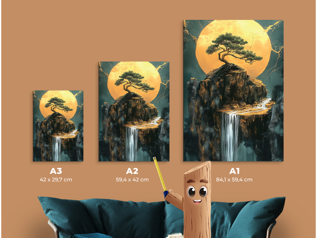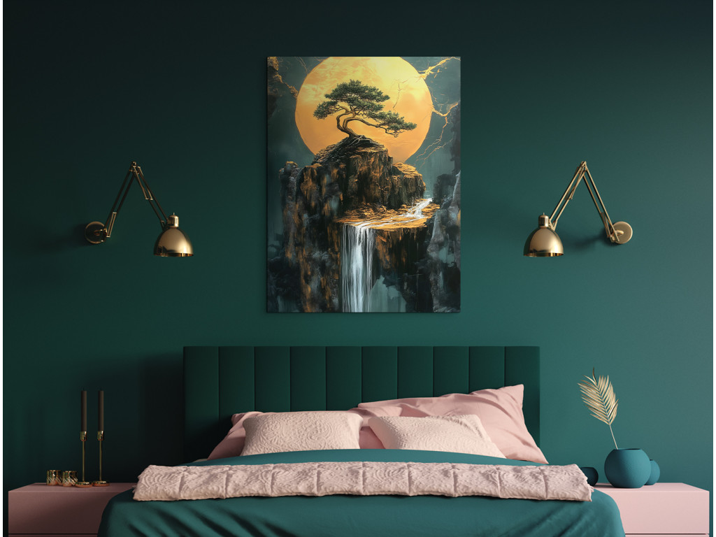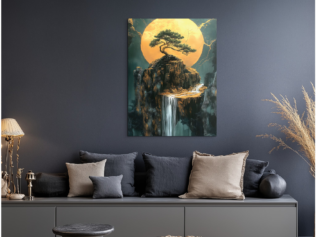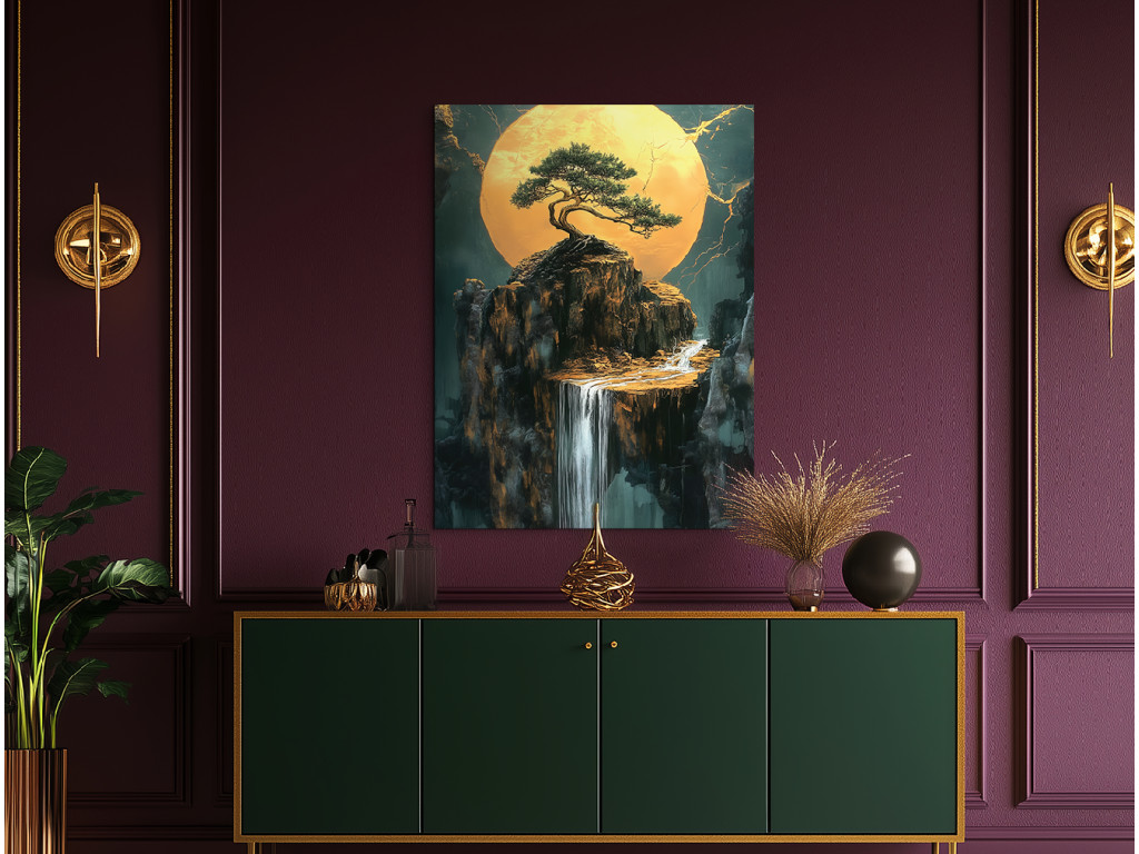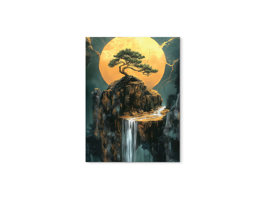 Le bonsaï sur la falaise symbolise l'équilibre et la persévérance, en contraste avec le paysage ouvert. Le soleil ou la lune rayonnant(e) aux tons dorés illumine la cascade et le massif rocheux en contrebas. Les fissures dorées en arrière-plan confèrent à l'image une expression dramatique et artistique avec une touche de mysticisme.