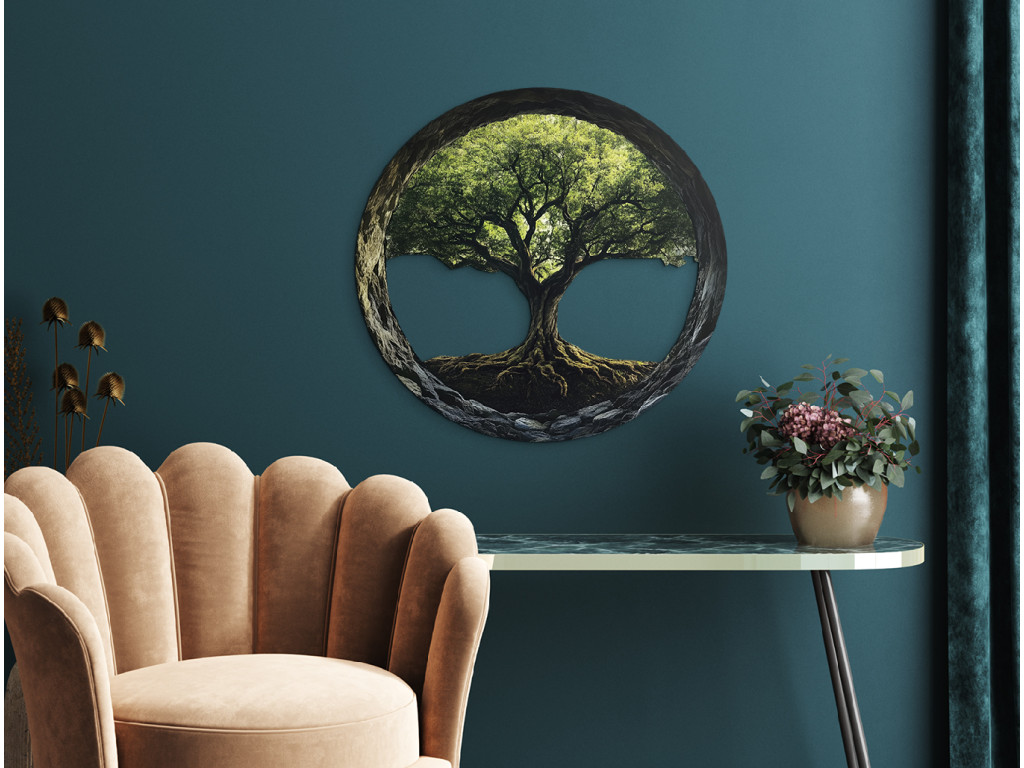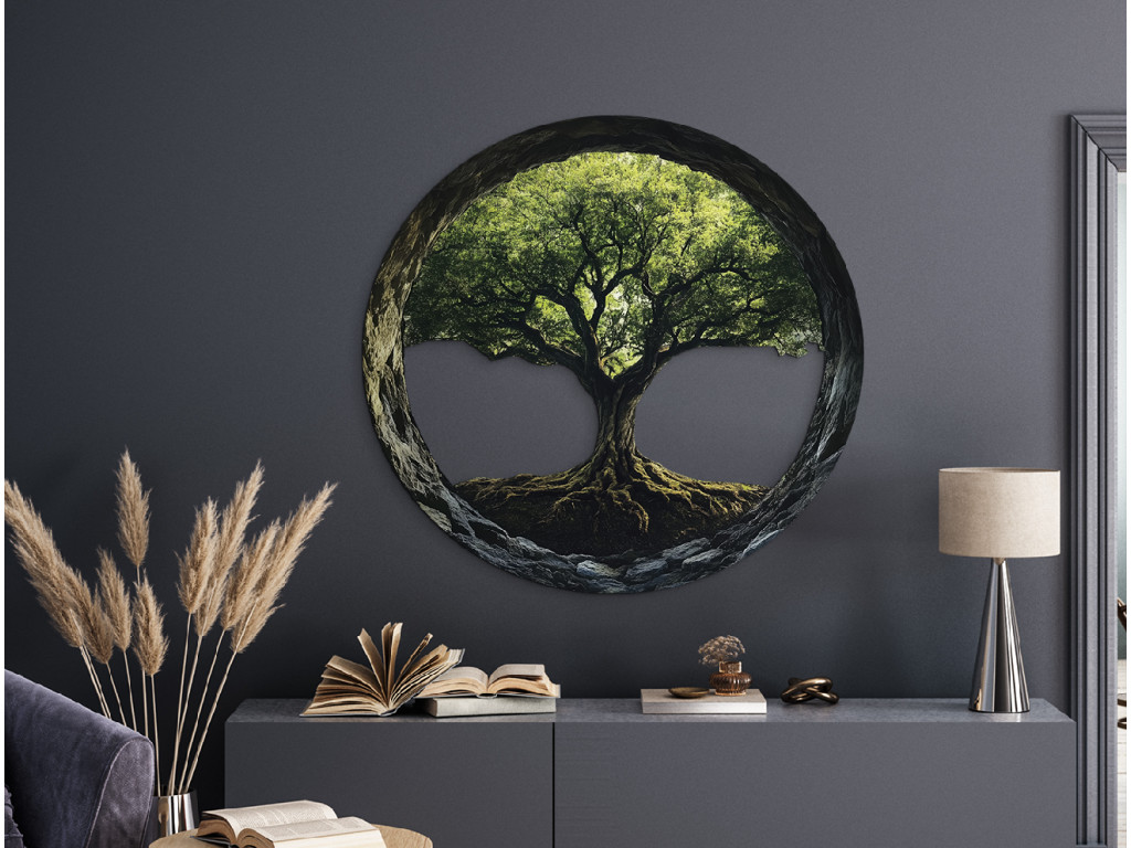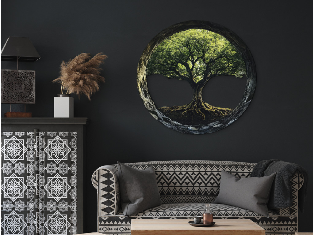 L'arbre de vie, avec ses racines entrelacées et sa couronne, symbolise souvent le cycle éternel de la vie, l'interconnexion de tous les êtres et l'énergie infinie. Le cadre sombre met en valeur le motif central et confère à l'œuvre un caractère paisible et équilibré.