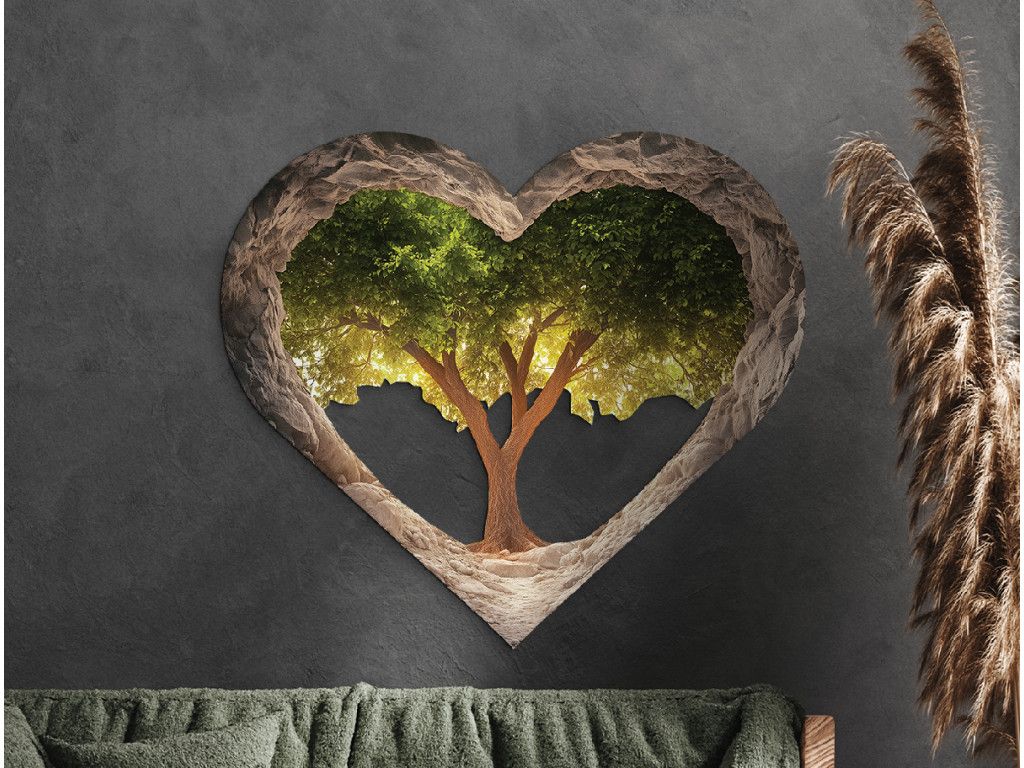 Le tableau représente un arbre à la couronne verte luxuriante poussant dans un espace en forme de cœur rappelant une grotte ou une formation rocheuse. Les bords texturés du cœur évoquent la profondeur et la protection, tandis que la lumière qui pénètre par l'arrière crée un sentiment d'espoir et de paix. L'œuvre symbolise la vie, la croissance et la force cachées au cœur de la nature.