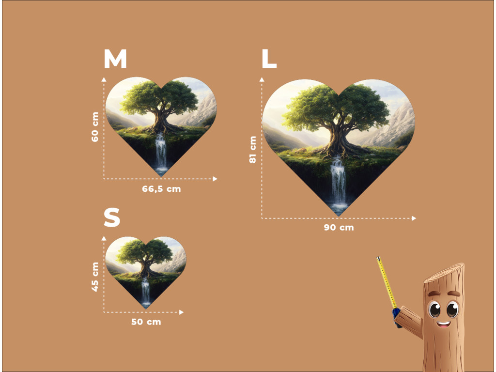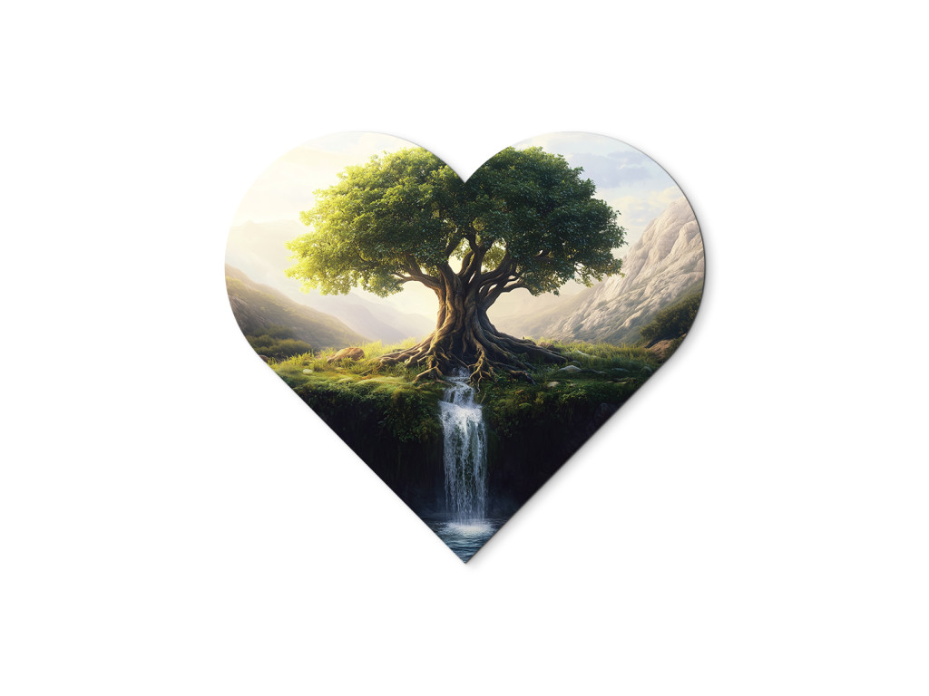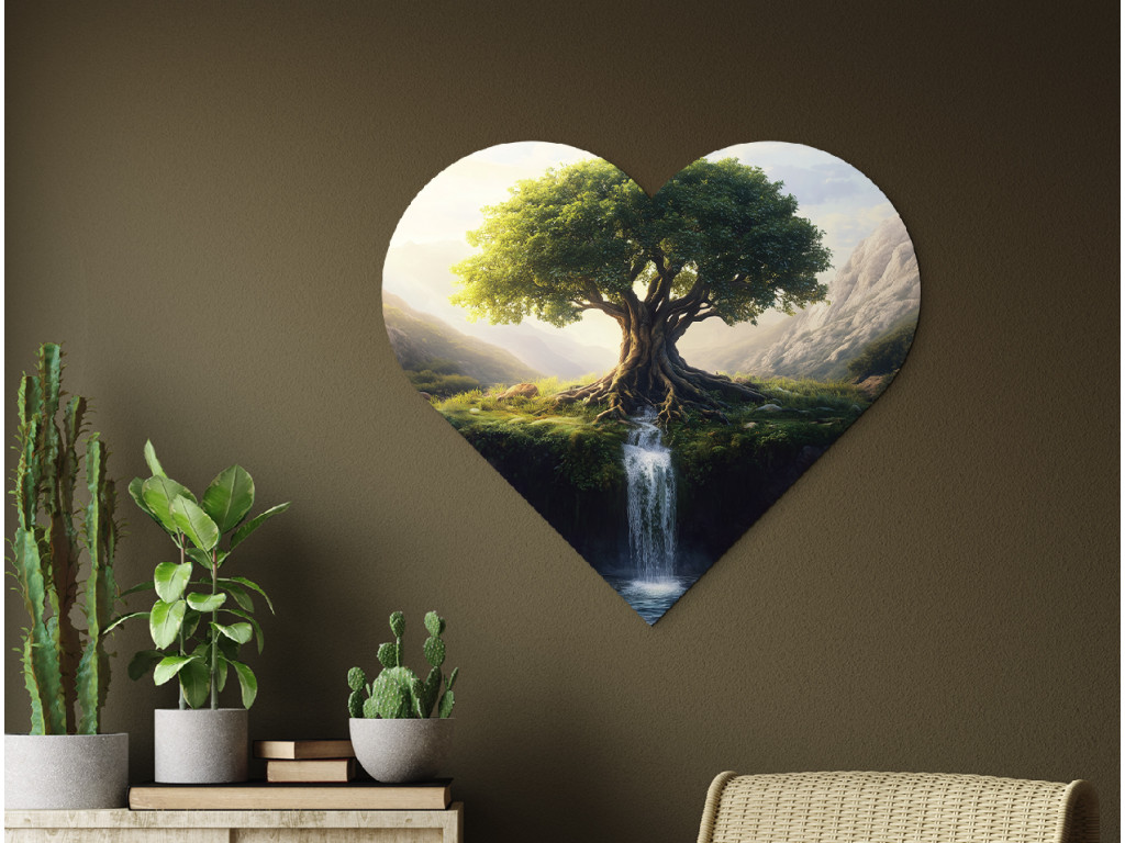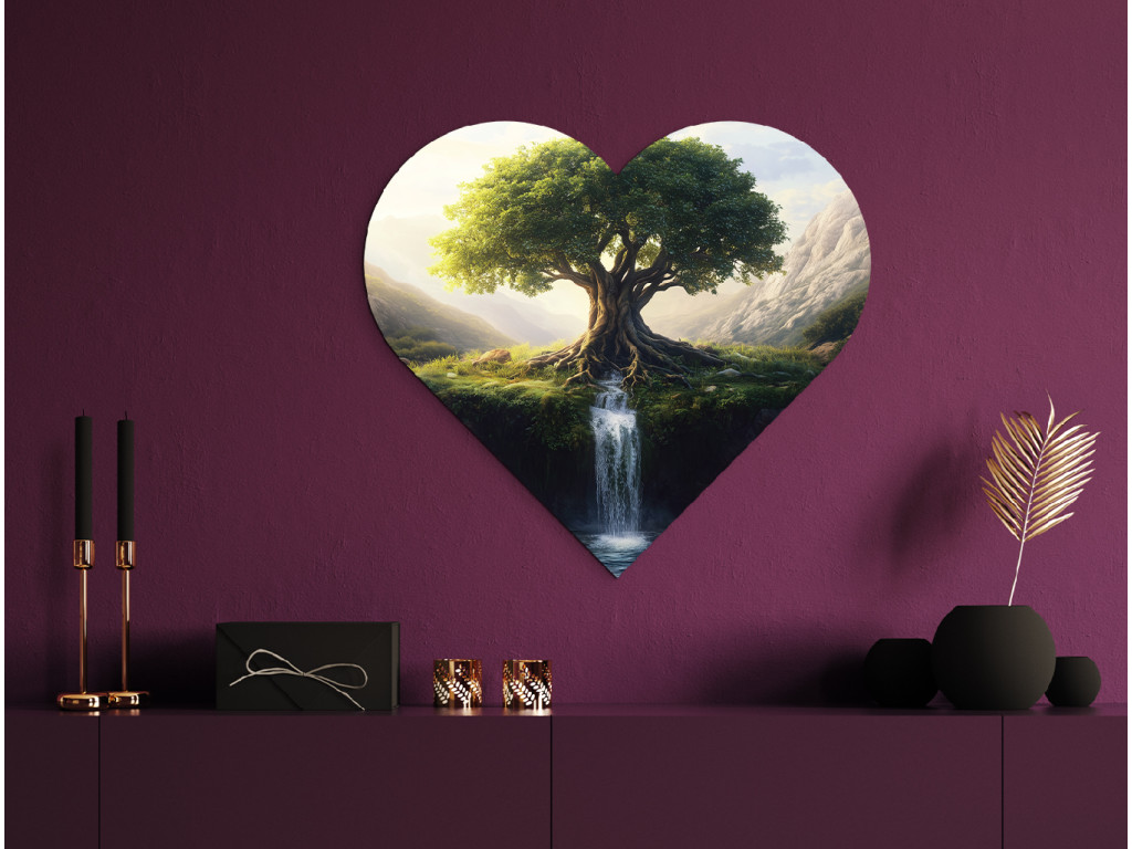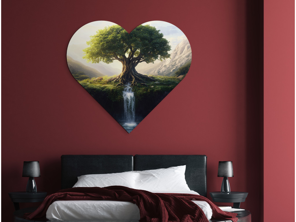 Le tableau en forme de cœur représente l'arbre de vie avec ses racines richement ramifiées qui se confondent avec la cascade coulant de la falaise. En arrière-plan, les montagnes et la campagne verdoyante s'étendent, créant une atmosphère paisible et harmonieuse. Le fond rouge contraste avec le motif naturel et accentue l'émotion du tableau.