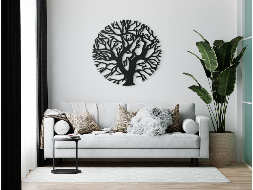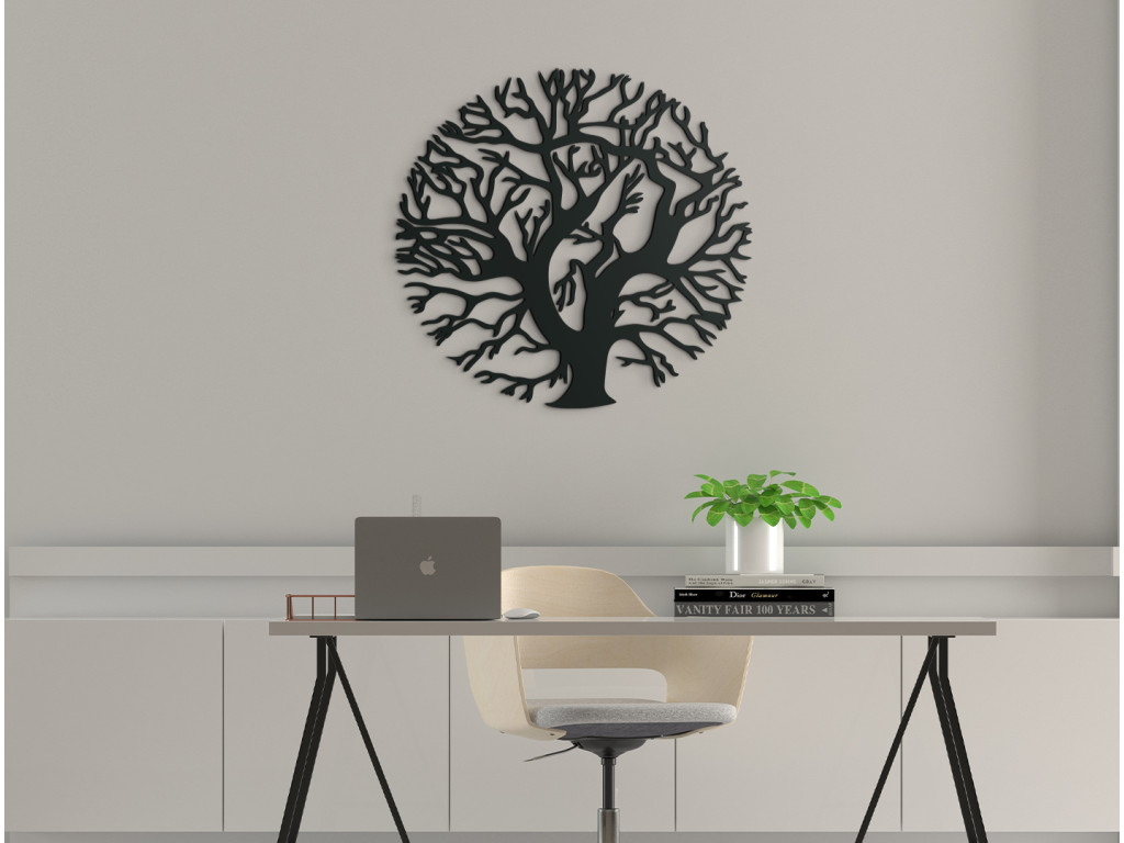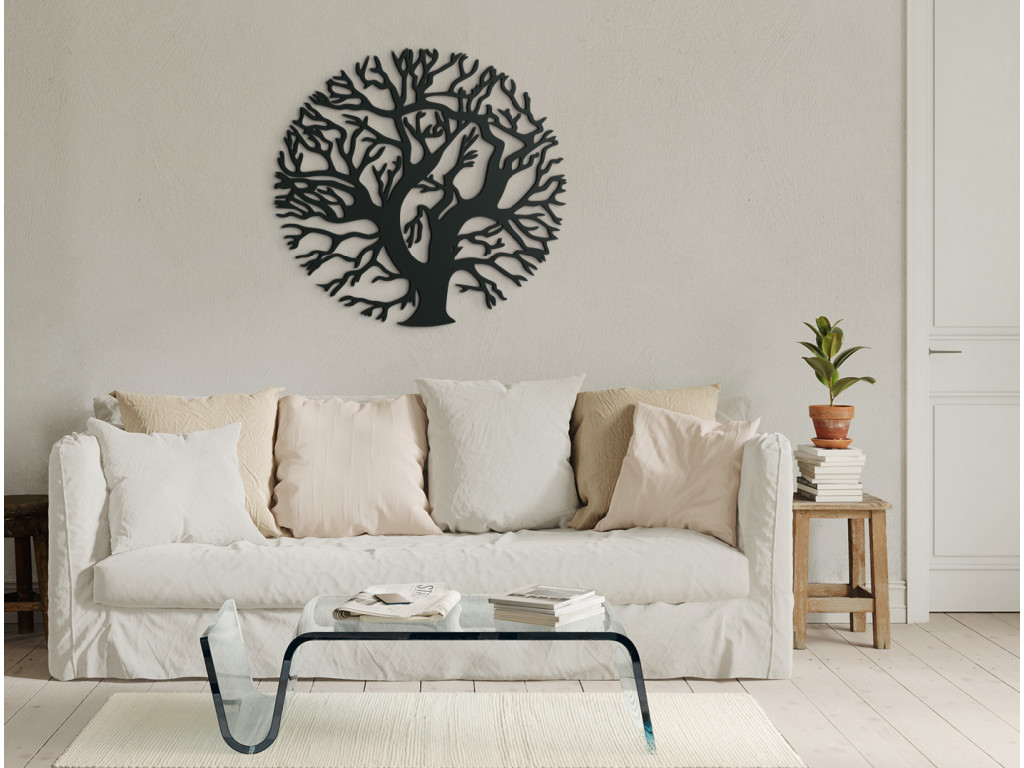Drevené Stromy života predstavujú motív s hlbokou duchovnou symbolikou. Strom života býva vyobrazený vždy s bohatou korunou a košatými konármi, rozširujúcimi sa do priestoru. Nálepka na stenu Strom života bez koreňov okrúhly znázorňuje strom bez listov, ktorý má konáre usporiadané do kruhu, čím odkazuje na pradávny cyklus znovuzrodenia a prispôsobenia rozličným podmienkam prostredia.