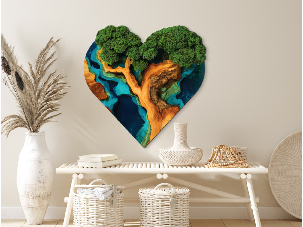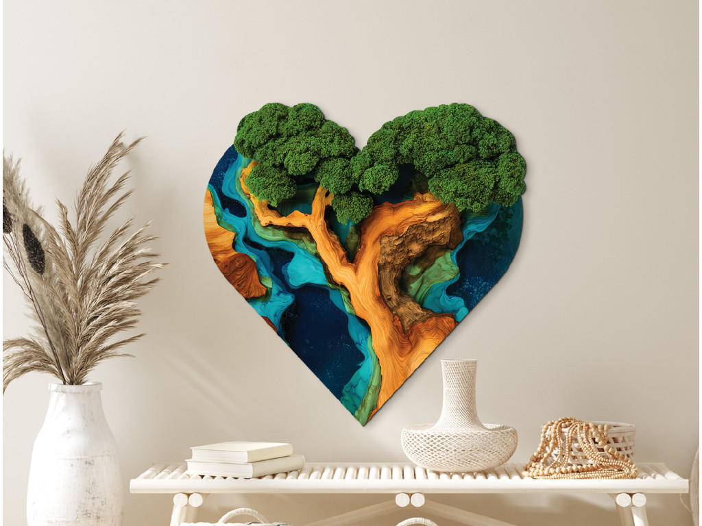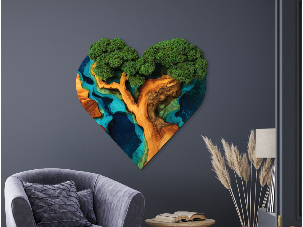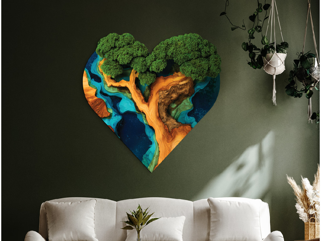 L'Arbre de vie en mousse Souffle du cœur (impression UV) associe la beauté des tableaux en mousse à la symbolique de la vie éternelle. Grâce à une impression UV précise, sa couronne verte semble être faite de mousse vivante et sa surface paraît époxy, mais l'image reste sans entretien, durable et plus abordable que les œuvres en mousse classiques. La forme de cœur renforce son caractère exceptionnel.