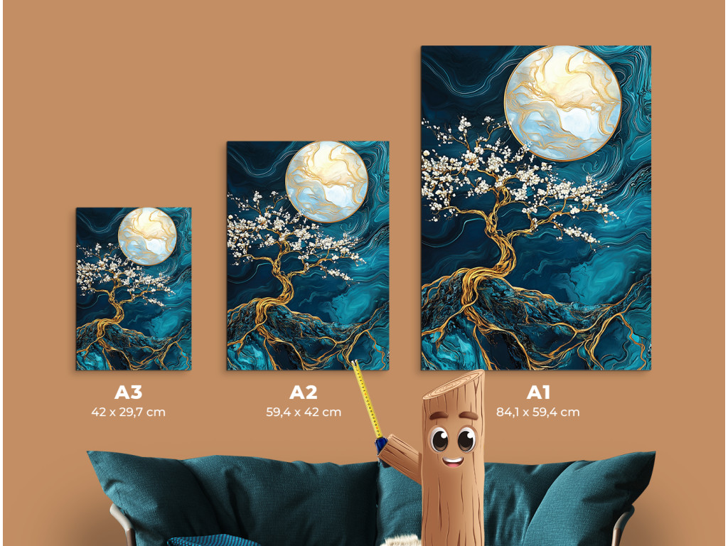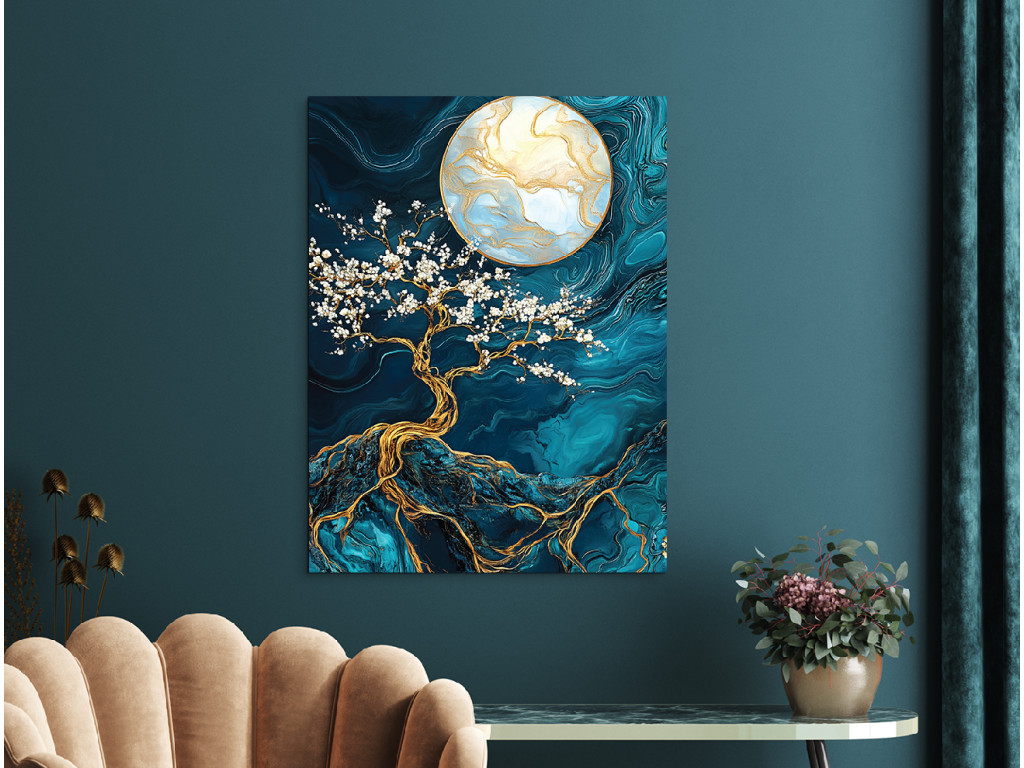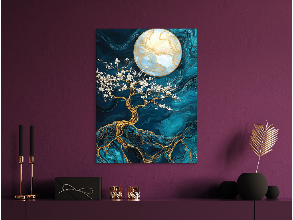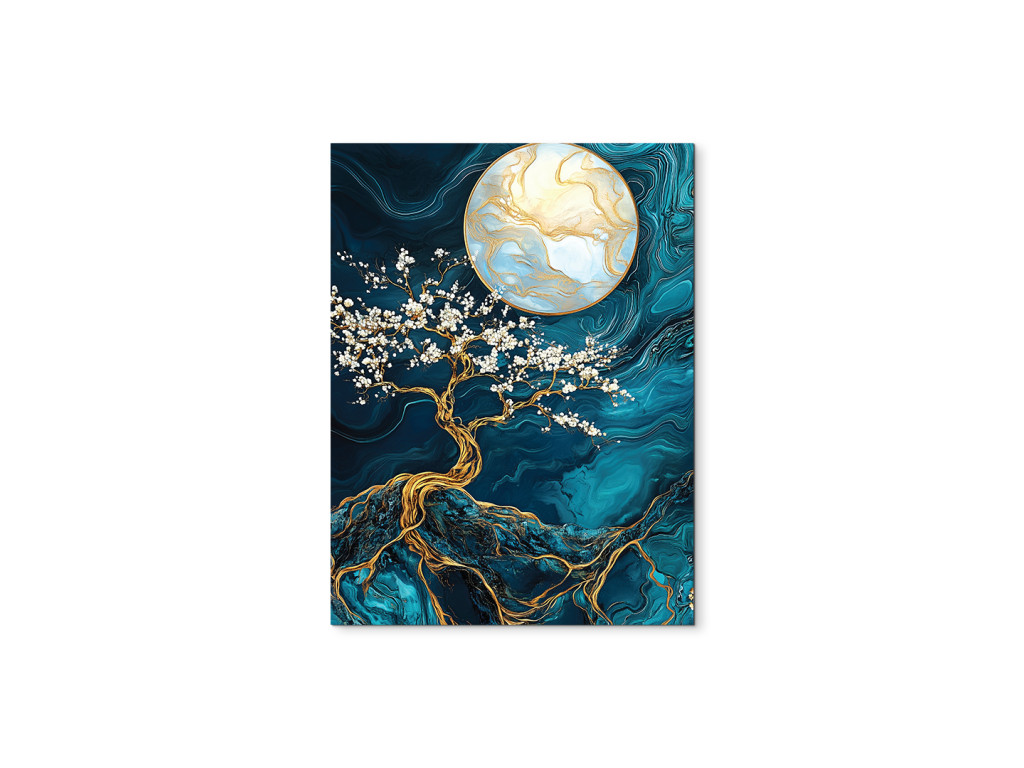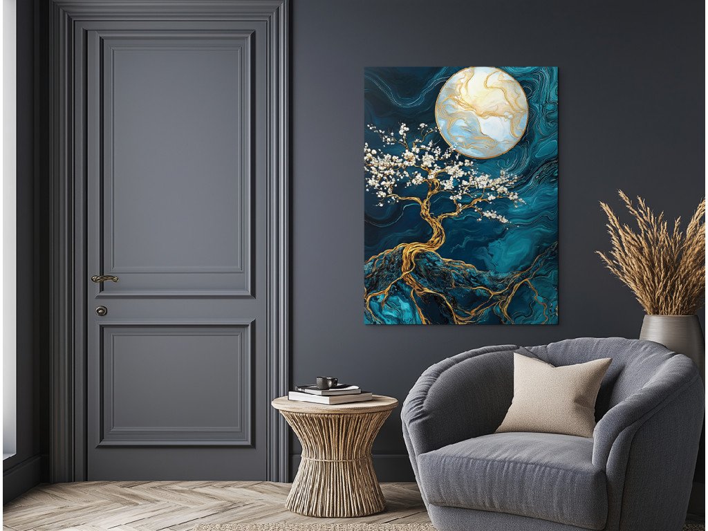 L'arbre doré aux fleurs blanches s'étend sur un fond marbré profond, illuminé par une grande lune dorée. Les nuances turquoise et bleues apportent de la profondeur, tandis que les accents dorés créent un contraste luxueux. Le tableau dégage une impression mystique et équilibrée, idéal comme élément mural élégant dans une chambre ou un salon.