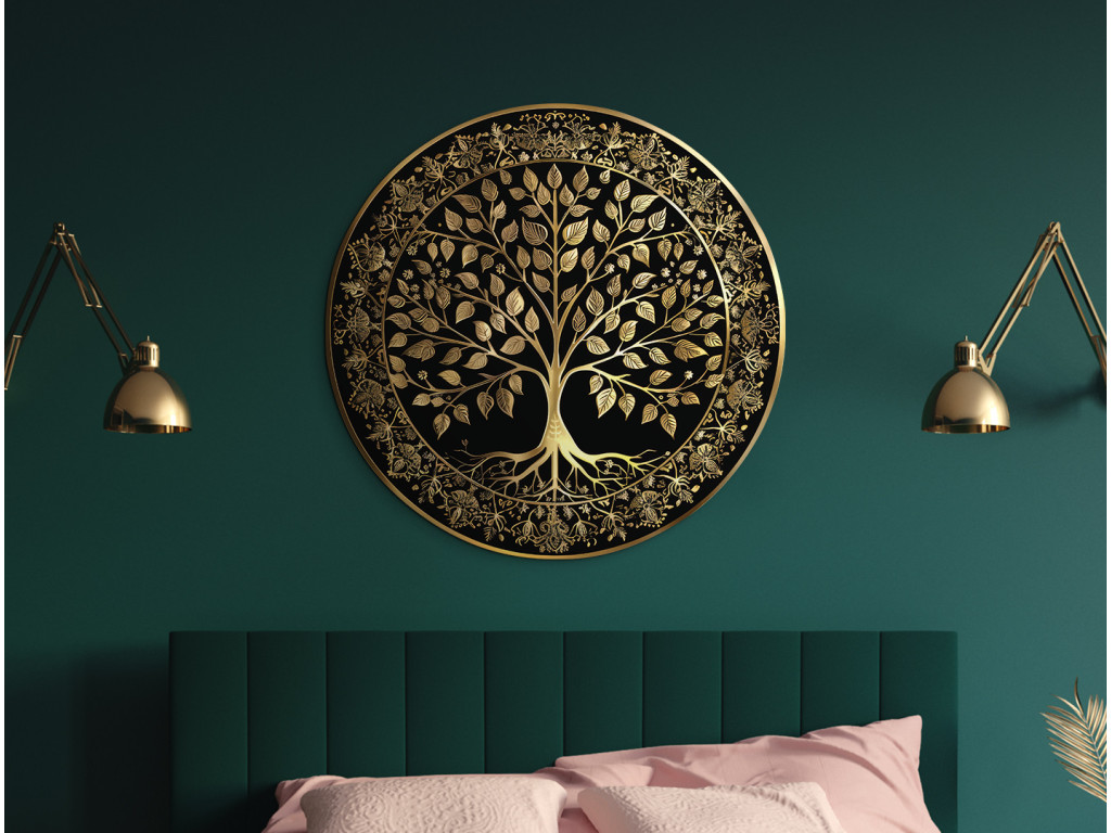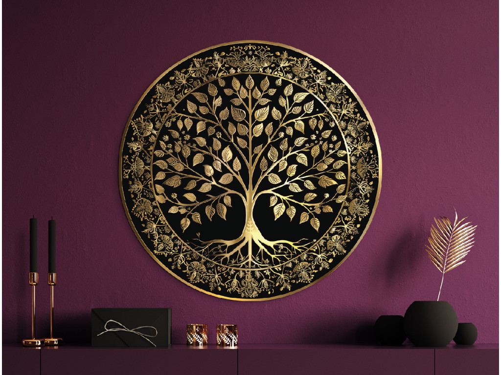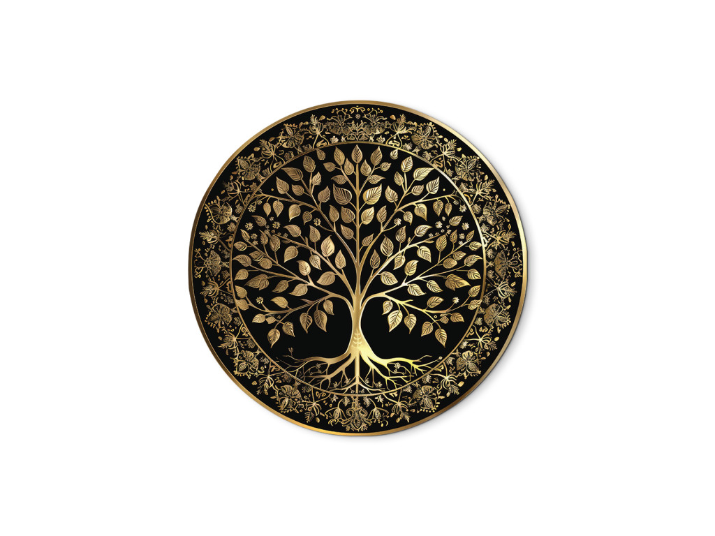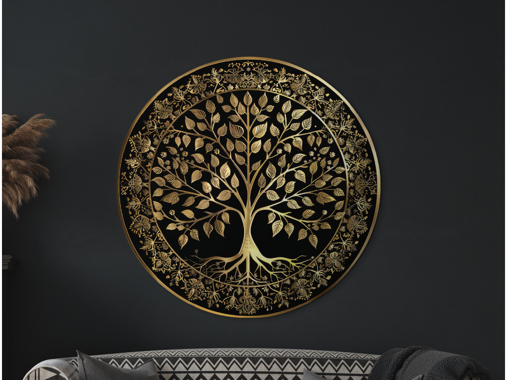 Élégante décoration circulaire avec le motif de l'arbre de vie en couleur dorée sur fond noir. L'arbre à la couronne luxuriante et aux racines ramifiées est entouré d'une bordure ornementale avec des motifs floraux, ce qui confère à l'œuvre un aspect luxueux et symbolique. Idéal comme élément distinctif dans un intérieur moderne ou classique.
