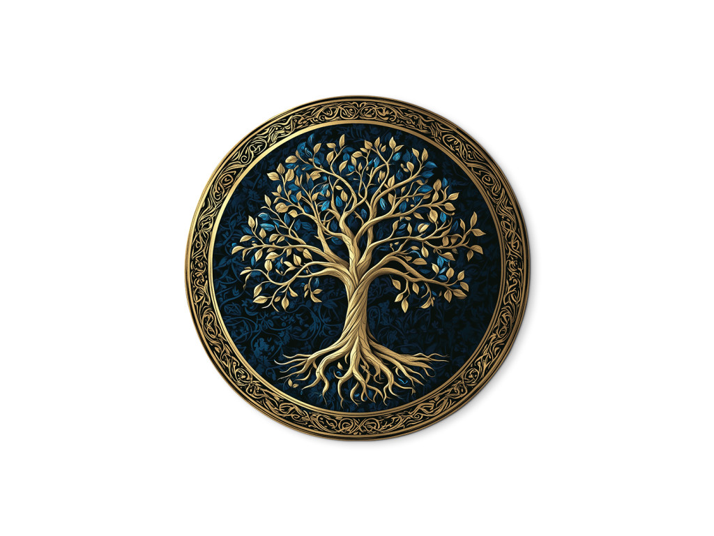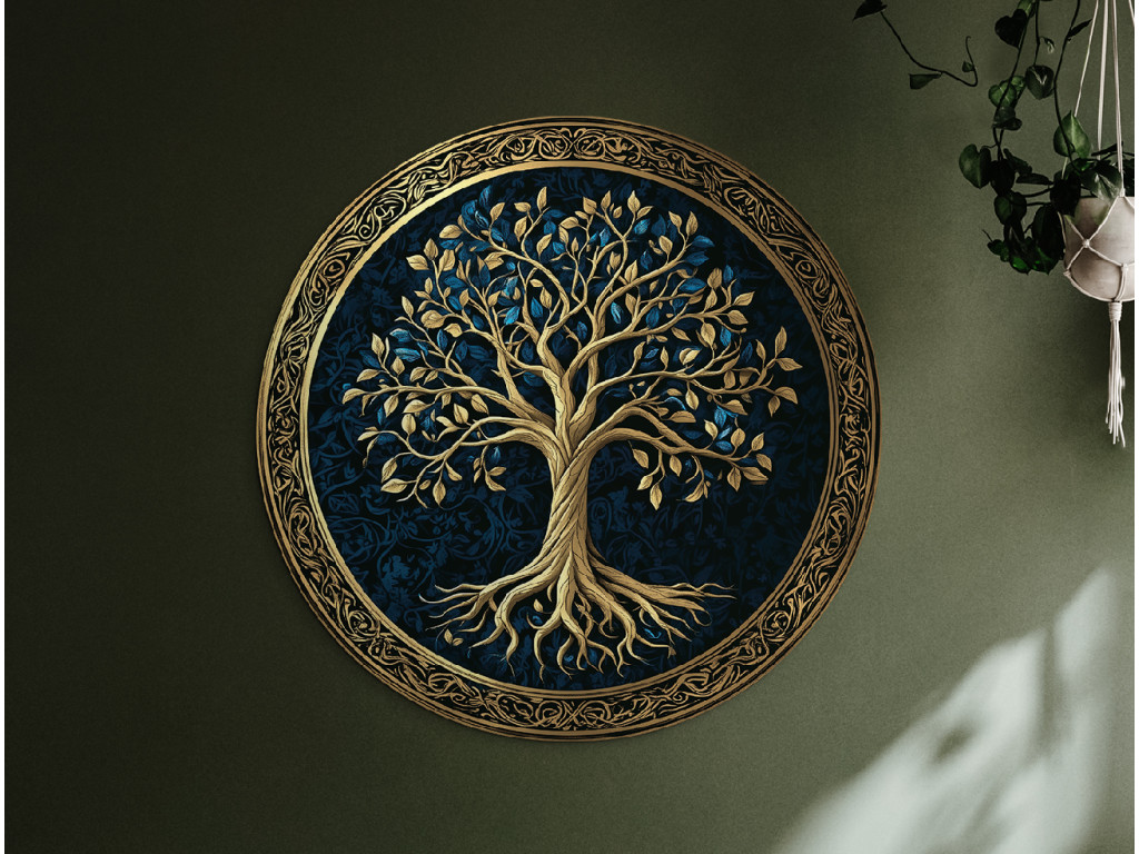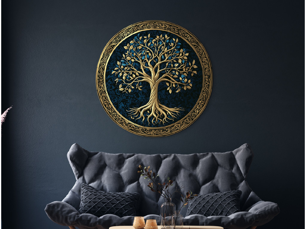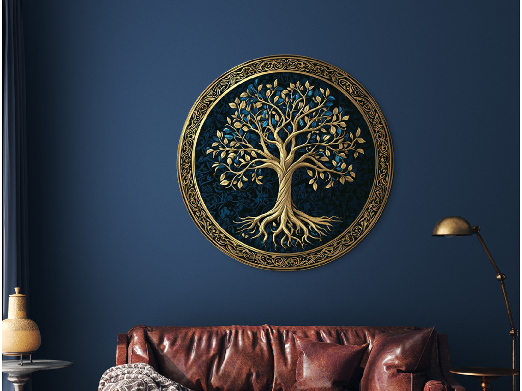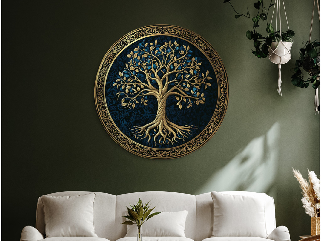 La décoration murale ronde avec le motif de l'Arbre de vie représente un feuillage et des racines dorés et luxuriants sur un fond bleu foncé à motifs. L'ensemble est encadré par un cercle ornemental doré qui souligne le symbole de l'éternité et de l'harmonie. Convient comme accent élégant dans les intérieurs modernes et classiques.