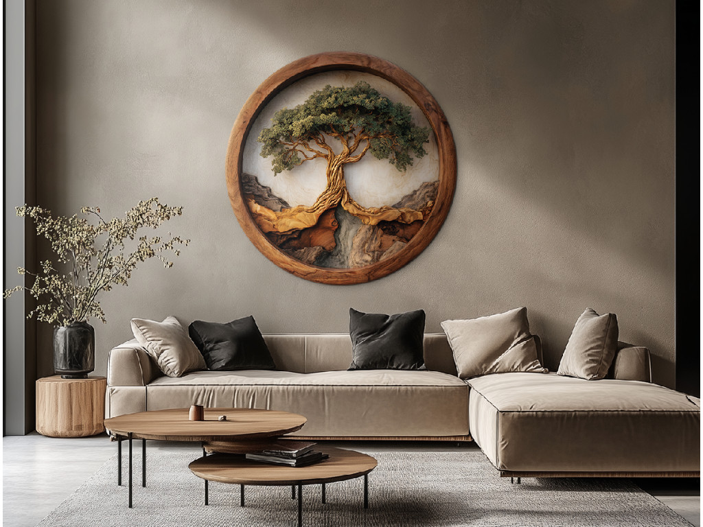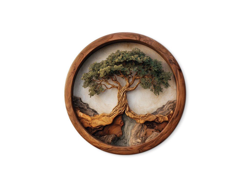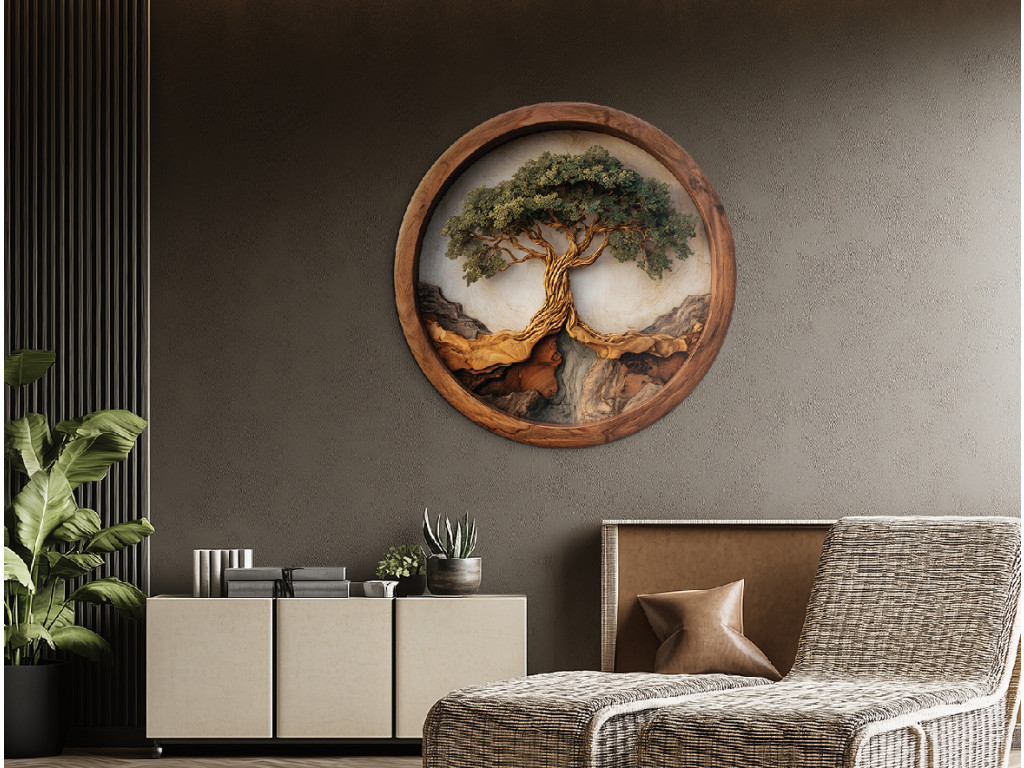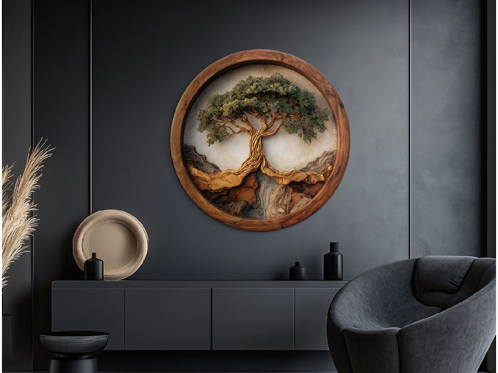 Ce tableau imprimé aux UV dans un cadre rond représente un arbre imposant avec un tronc ramifié et une couronne verte dense rappelant un bonsaï. Le tronc est rendu de manière réaliste avec un dessin détaillé du bois et pousse sur un support évoquant des rochers ou des collines, ce qui donne à l'image une profondeur naturelle.