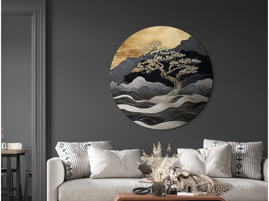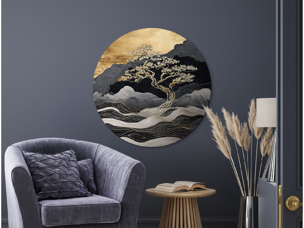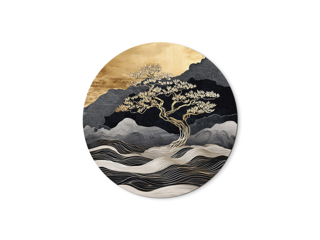Tableau rond avec un arbre doré dominant se dressant sur fond de paysage abstrait. Les lignes ondulées évoquant les montagnes ou l'eau contrastent avec la partie supérieure légèrement lumineuse rappelant le coucher du soleil. Cette représentation moderne avec une touche d'esthétique asiatique dégage une impression de calme et de méditation.