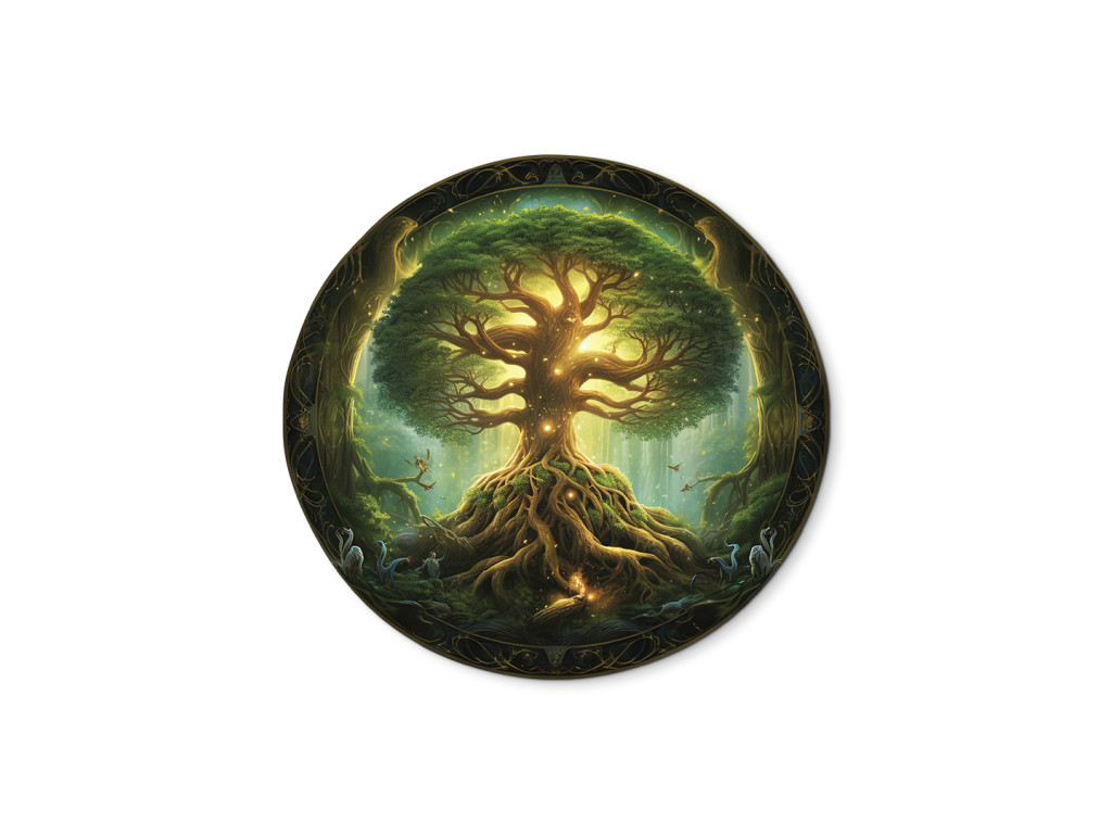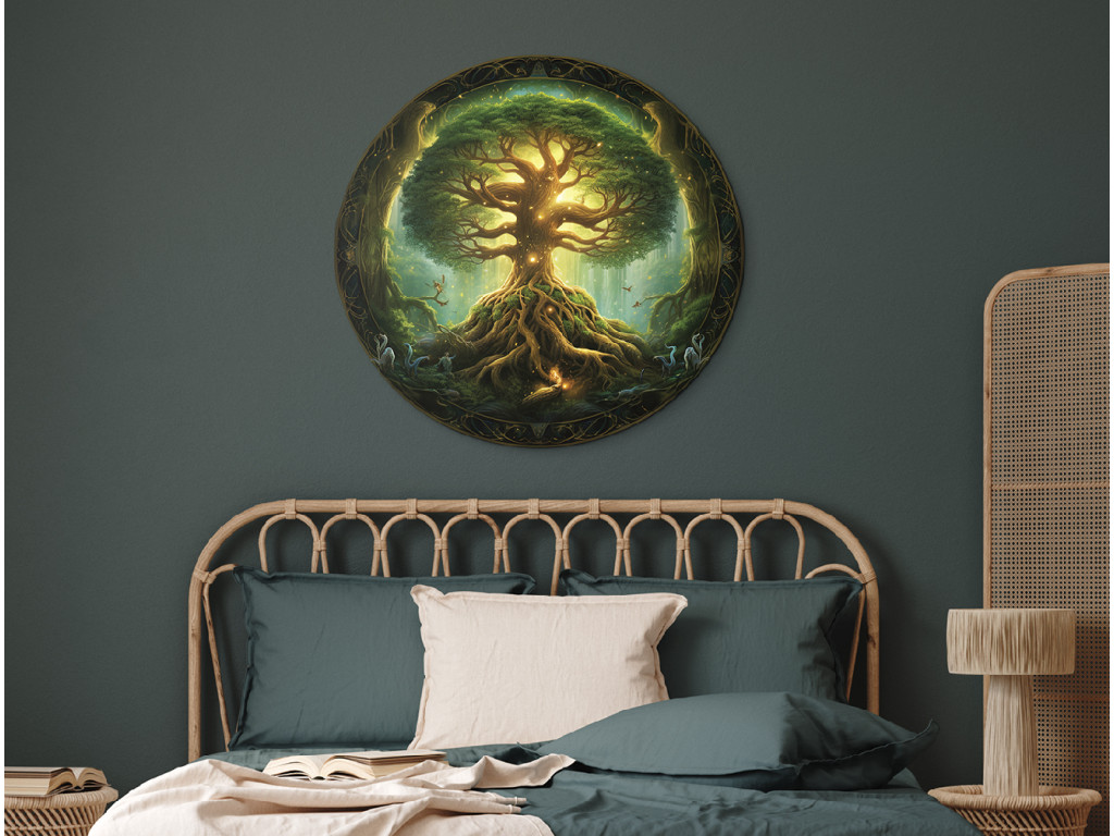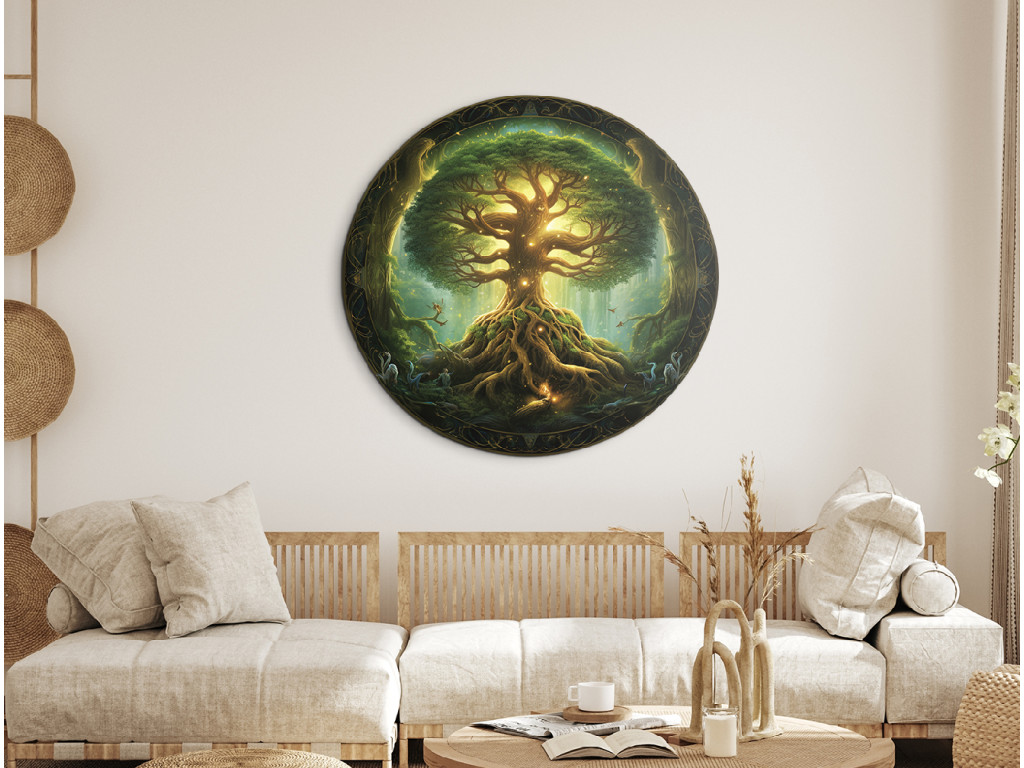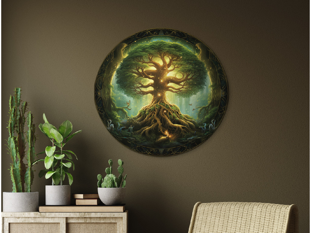 La décoration murale ronde représente Yggdrasil, l'arbre sacré de la mythologie nordique, avec ses racines imposantes et sa couronne lumineuse pleine de feuilles vertes. La lumière transparaît à l'arrière-plan, créant une atmosphère mystique et spirituelle. Le cadre ornemental et les détails délicats confèrent à l'œuvre une profondeur symbolique et un caractère exceptionnel.