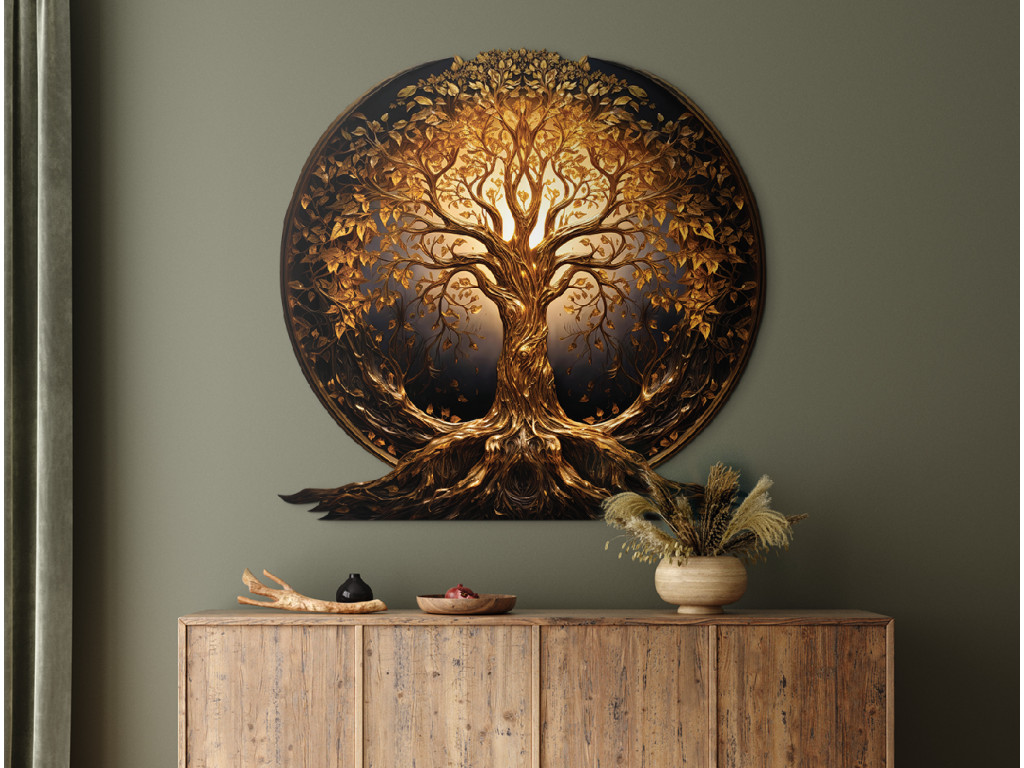 Cette élégante décoration ronde représente l'arbre de vie doré avec ses racines et sa couronne de feuilles richement ramifiées, brillantes d'une douce teinte dorée. La composition est harmonieuse et équilibrée, soulignant la symbolique de la force vitale, de la croissance et du lien entre le ciel et la terre.