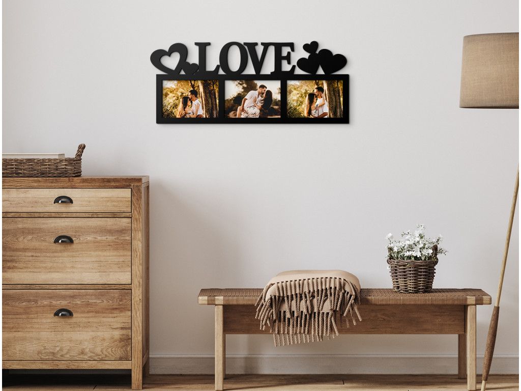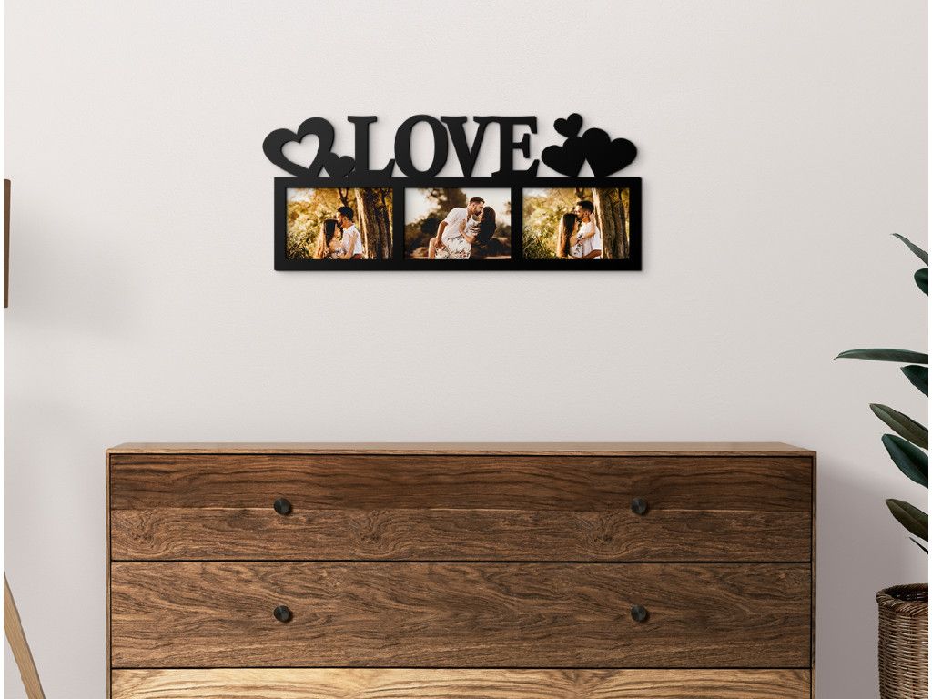 Cadre photo romantique avec l’inscription anglaise « Love » pour tous les couples qui souhaitent se remémorer chaque jour les plus beaux moments de leur relation. Le cadre peut contenir 3 photos orientées horizontalement. Faites plaisir à votre moitié avec un cadeau original pour votre anniversaire, la Saint-Valentin ou simplement pour le plaisir.