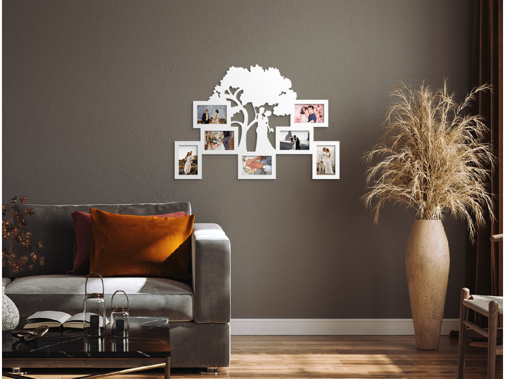 Svadobné fotografie majú pre zaľúbené páry osobitý význam, prečo ich teda skrývať v albume? Pripomínajte si svoj sľub či najkrajšie momenty spoločného vzťahu dennodenne prostredníctvom fotorámika. Dizajn je tvorený stromom života s objímajúcim sa párom pod jeho širokou korunou. Vystaviť si tu môžete až 7 fotografií v horizontálnom aj vertikálnom smere. Produkt tvorí výhradne iba rámik, neobsahuje sklo či iný materiál.