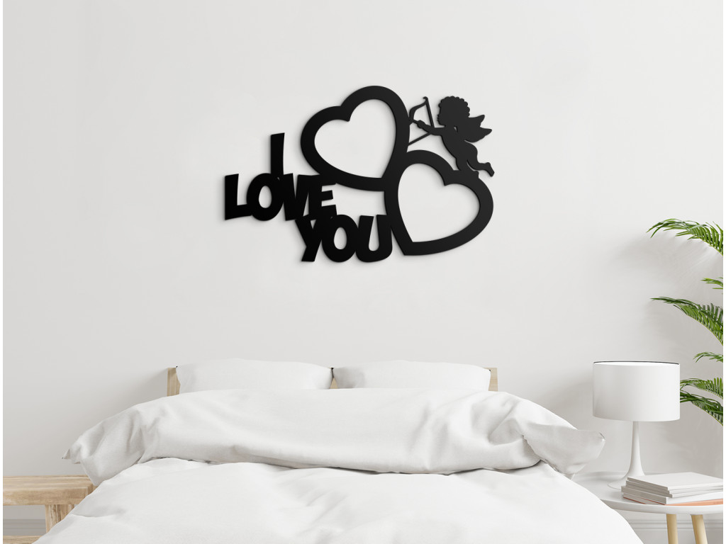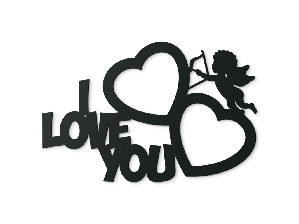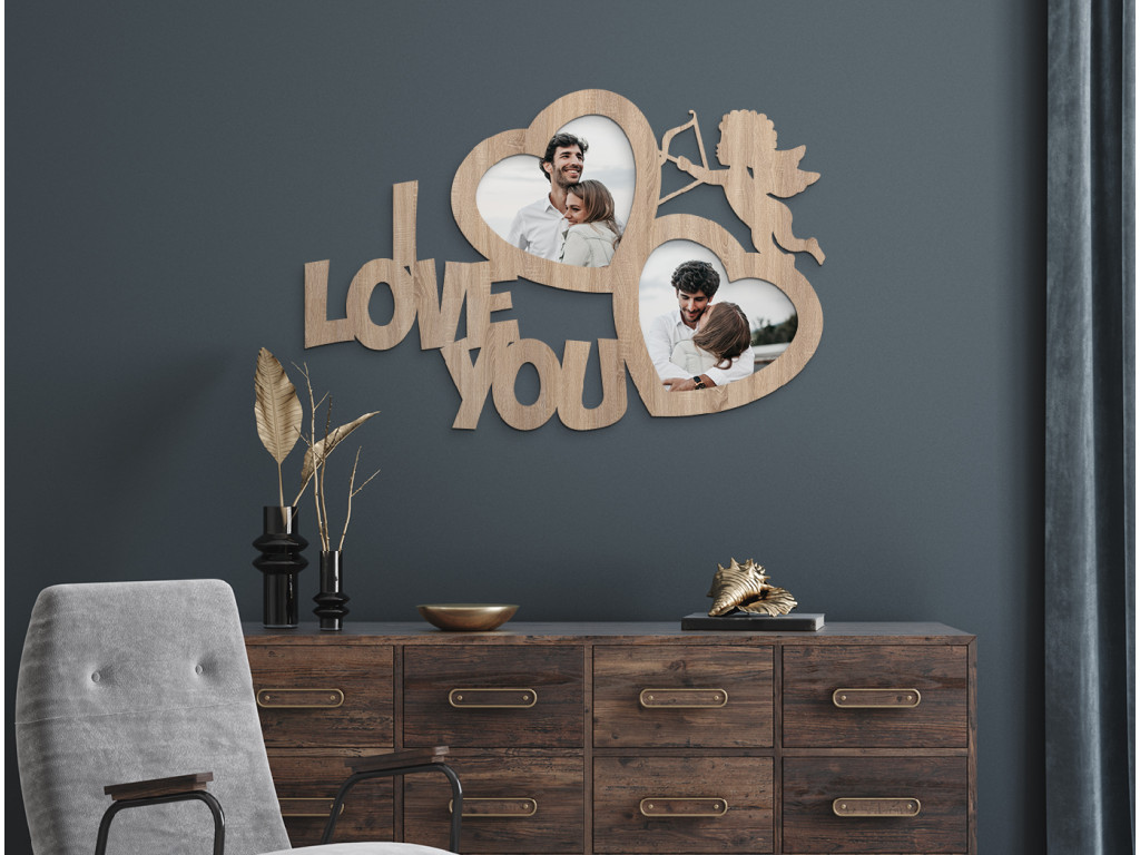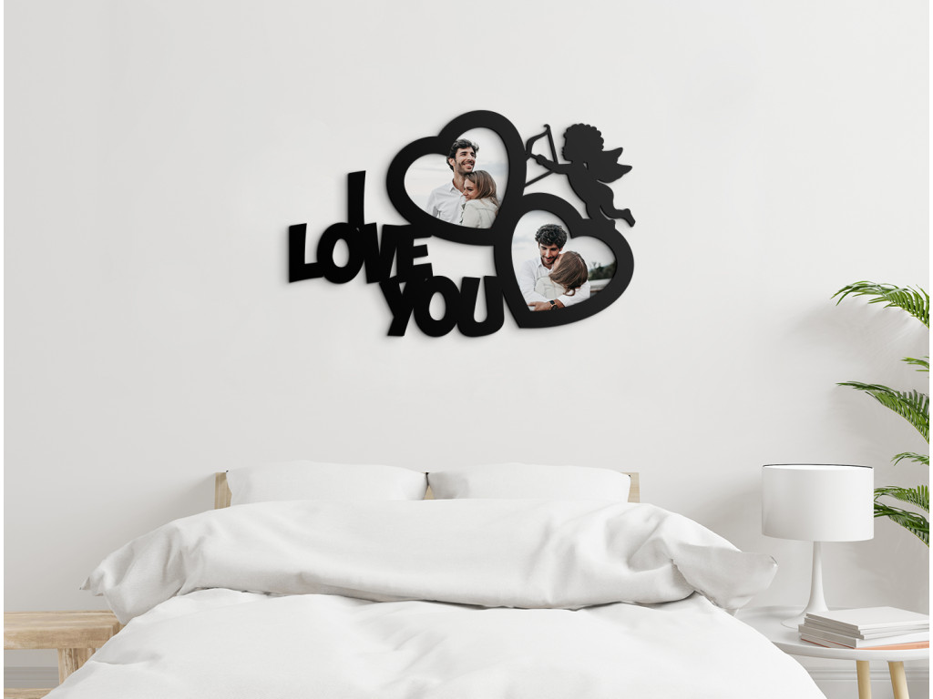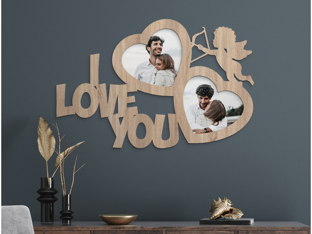 Dizajn rámika na 2 fotky pozostáva z anglického nápisu I love you, dvoch srdiečok - rámikov na fotografie a postavičky - Amora s napnutým lukom a pripraveným šípom. Do veľkej miery si ho môžete prispôsobiť podľa svojho vkusu. Na výber máte aktuálne viacero dekorov, ktoré je ľahké zladiť buď k nábytku alebo k farbe steny. Produkt tvoria výhradne iba rámiky, neobsahujú sklo či iný materiál.