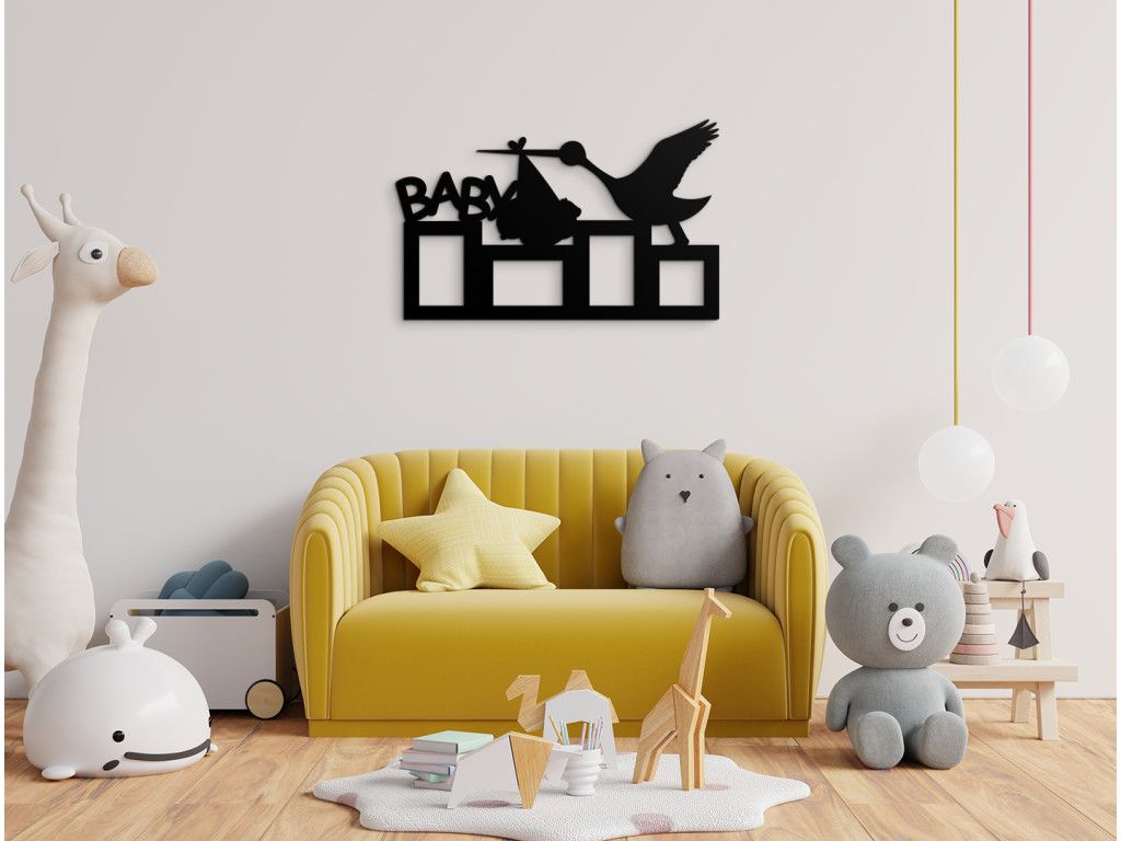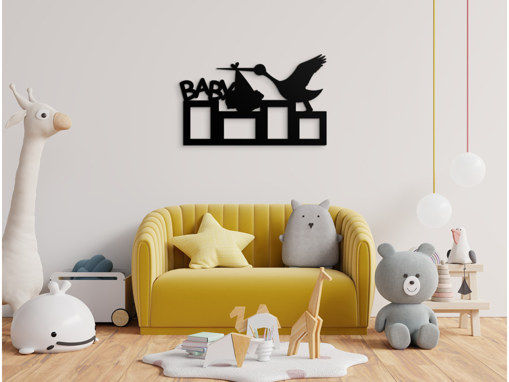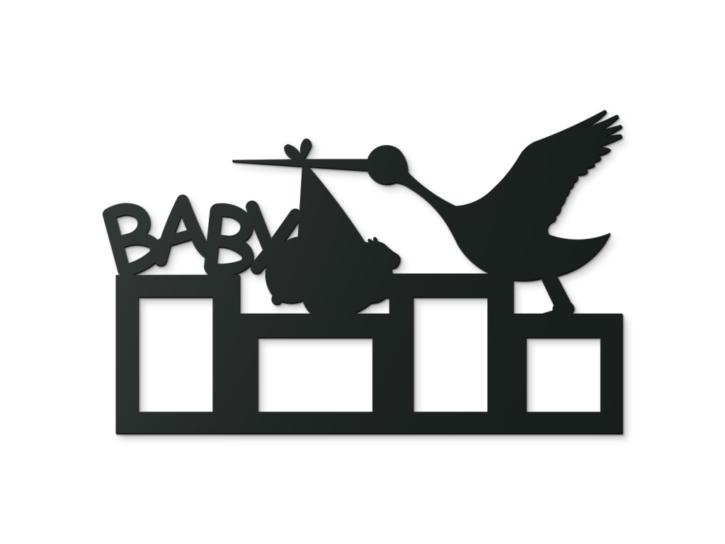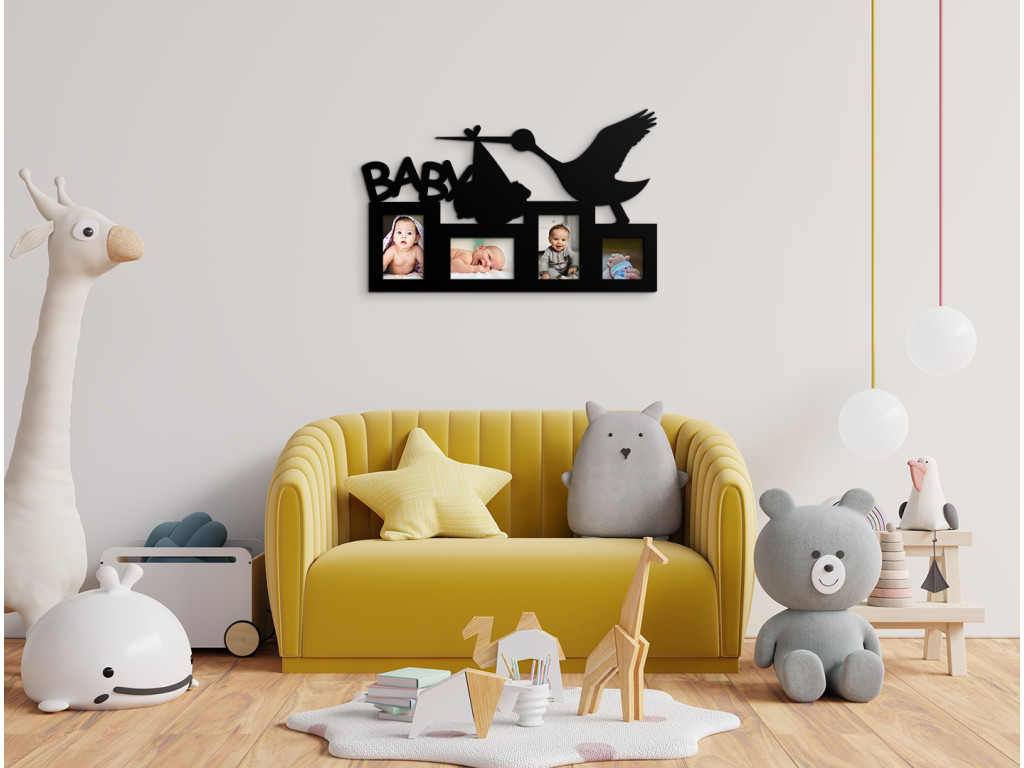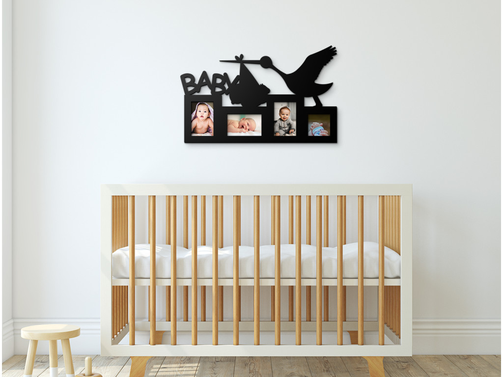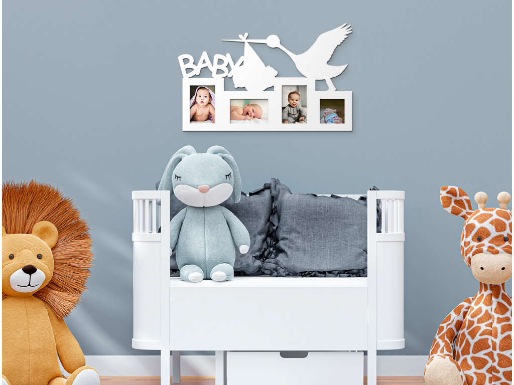 Neschovávajte rodinné fotografie v albumoch alebo v mobile. Fotorámik na stenu detskej izby s nápisom Baby, bocianom a priestorom až na 4 fotografie je najlepší spôsob, ako detskú izbičku oživiť. K fotorámiku od nás dostanete nielen montážny materiál na stenu, ale taktiež aj obojstranné samolepky určené na lepenie fotografií. Produkt tvorí výhradne iba rámik, neobsahuje sklo či iný materiál.