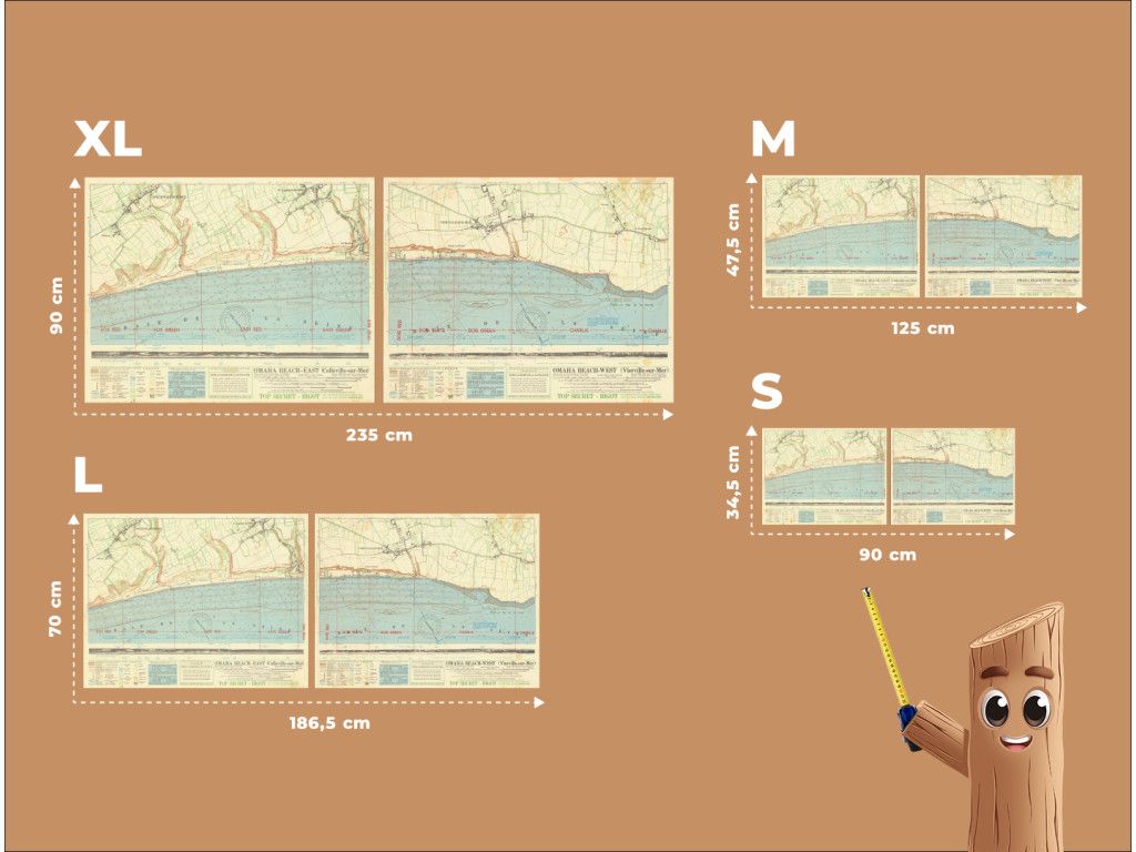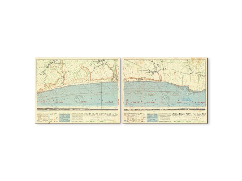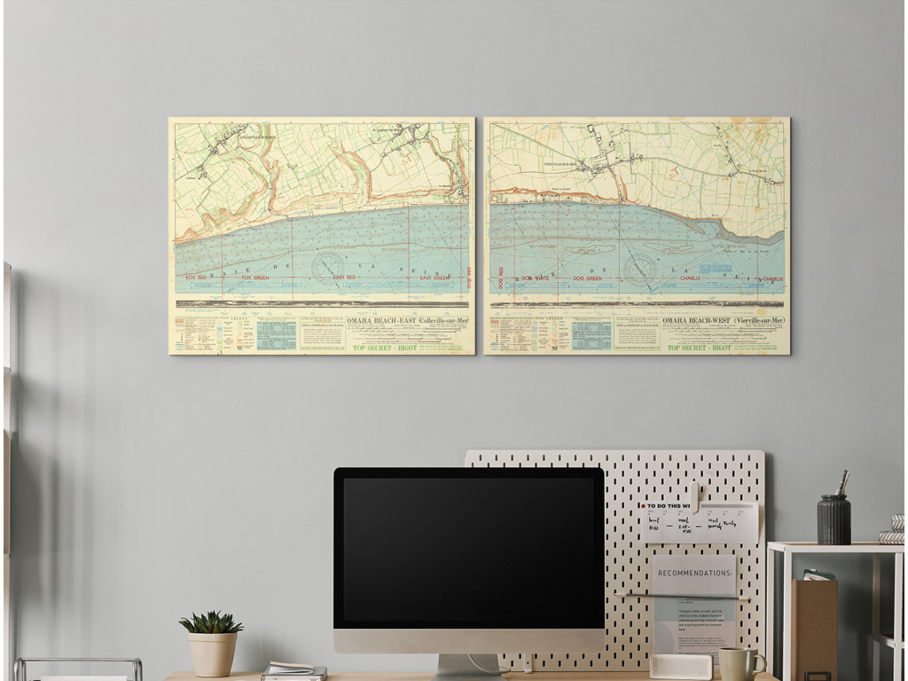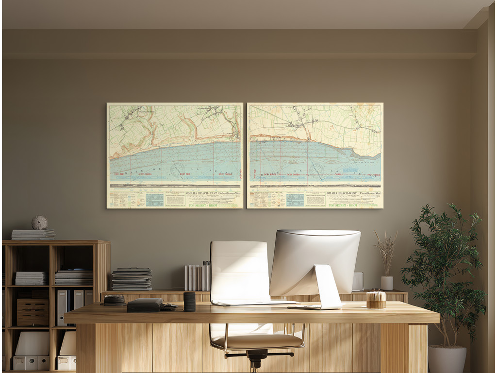 Les cartes historiques de 1944 montrent les préparatifs détaillés du débarquement sur Omaha Beach pendant le D-Day. Marquées TOP SECRET – BIGOT, elles montrent les lignes de défense allemandes et les obstacles près des côtes de Colleville-sur-Mer et Vierville-sur-Mer. Le tableau a une forte valeur historique et convient à un bureau, un espace de travail ou un espace dédié à l'histoire militaire.