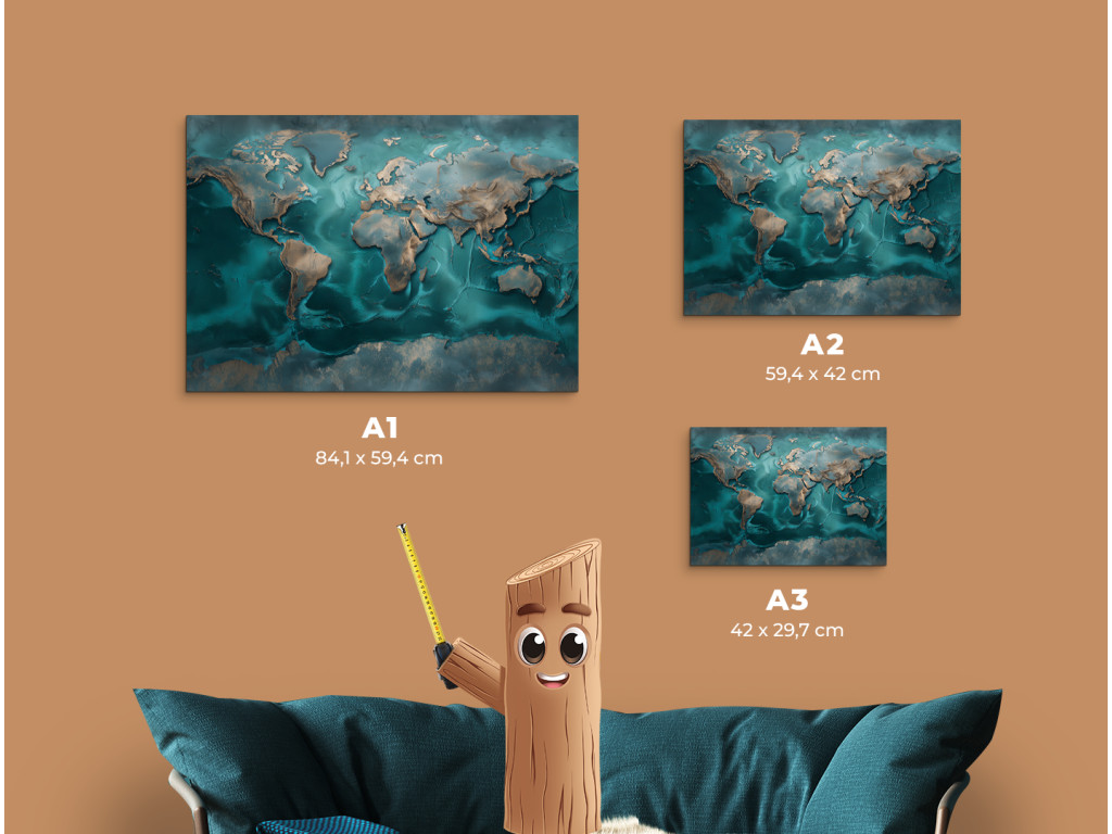 La carte décorative du monde, inspirée de la technique de l'art de la résine, séduit par son aspect et son impression de profondeur. Les tons turquoise et bleu avec de subtiles touches métalliques lui confèrent un aspect moderne et élégant. Le tableau est idéal comme élément de design dans un intérieur moderne, où il attire le regard au premier coup d'œil.