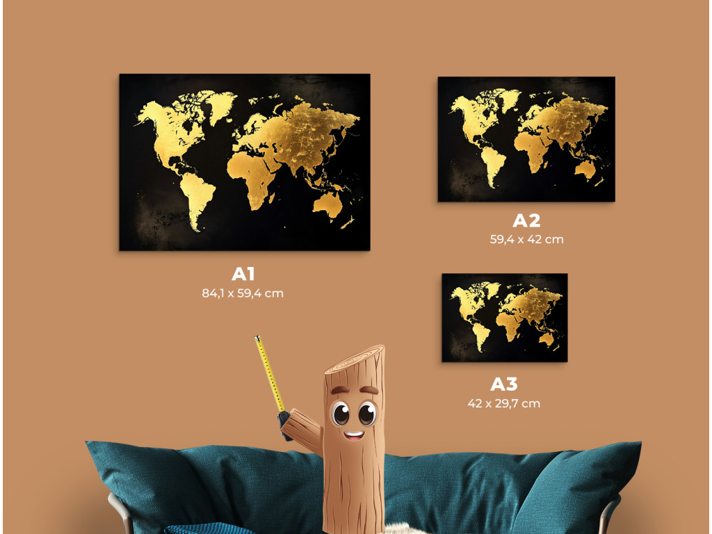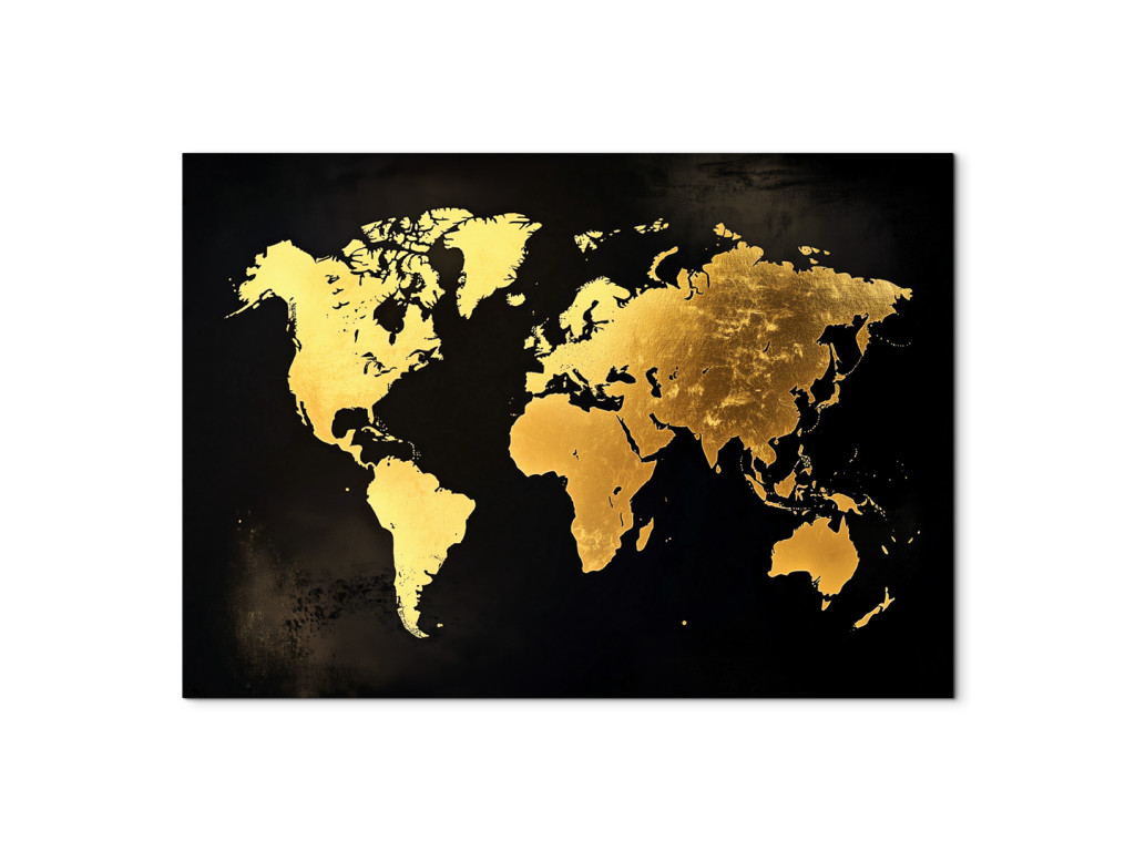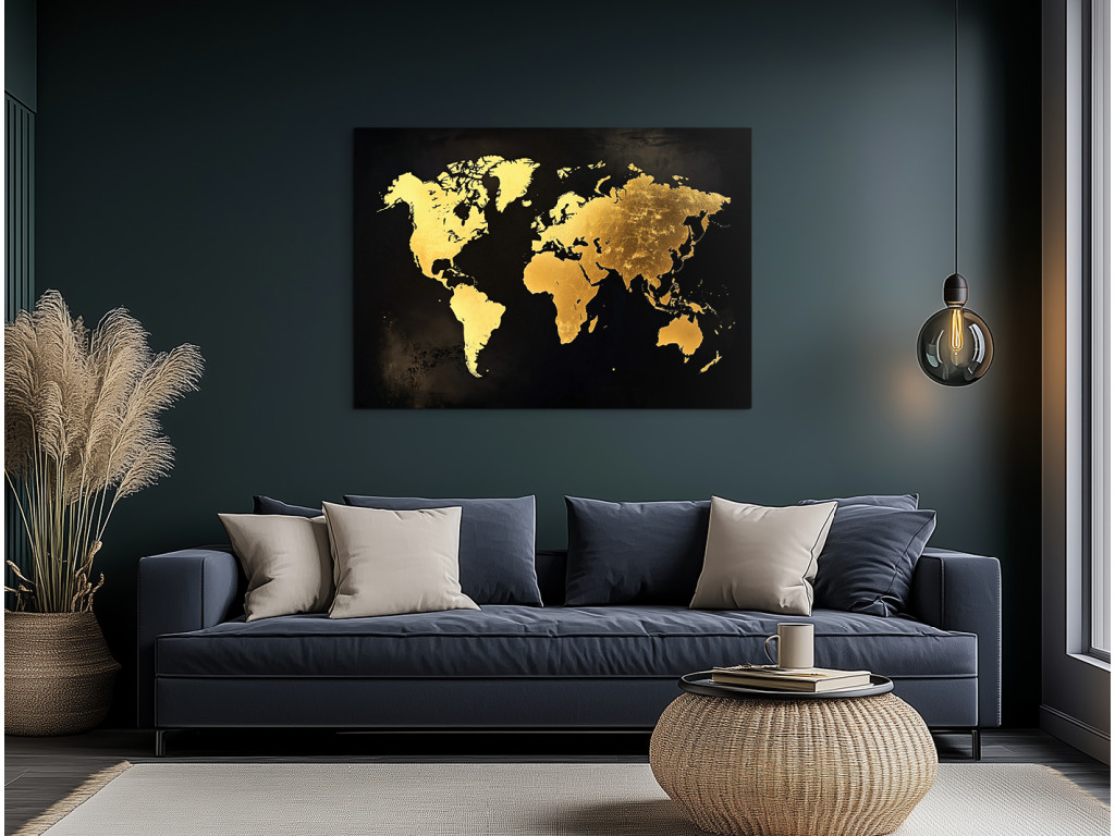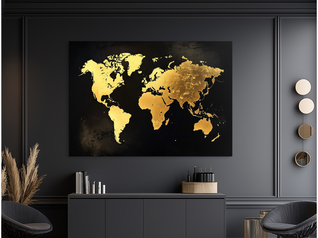 La carte moderne du monde avec ses continents dorés sur fond sombre est luxueuse et élégante. La texture rappelant la feuille d'or contraste magnifiquement avec le noir mat, créant ainsi un élément de design saisissant. Le tableau s'intègre parfaitement dans un intérieur moderne, un bureau ou un espace représentatif, où il attire immédiatement le regard.