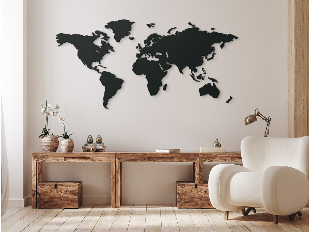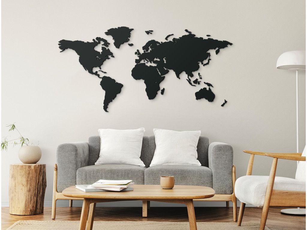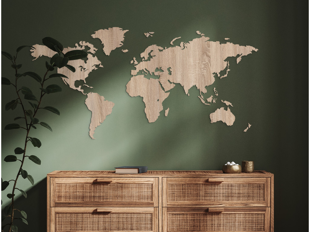 Une carte du monde moderne à accrocher au mur pour les âmes voyageuses et les amateurs de style moderne. La carte se compose de plusieurs pièces que vous pouvez facilement assembler à l’aide d’un gabarit. Elle convient aussi bien à un environnement domestique qu’à des locaux professionnels, où elle donnera une impression d’élégance et d’ordre.