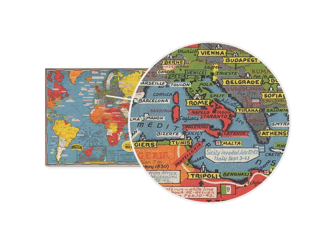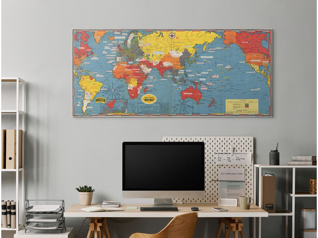 La carte de guerre originale de 1944 de Stanley Turner retrace les événements clés de la Seconde Guerre mondiale à l'aide d'un code couleur représentant les territoires et les avancées militaires. Connue sous le nom de Dated Events War Map, cette carte est un document historique important lié à la période du D-Day. En tant que décoration, elle est authentique et éducative et convient à un bureau, une salle de travail ou un intérieur où l'on s'intéresse à l'histoire.