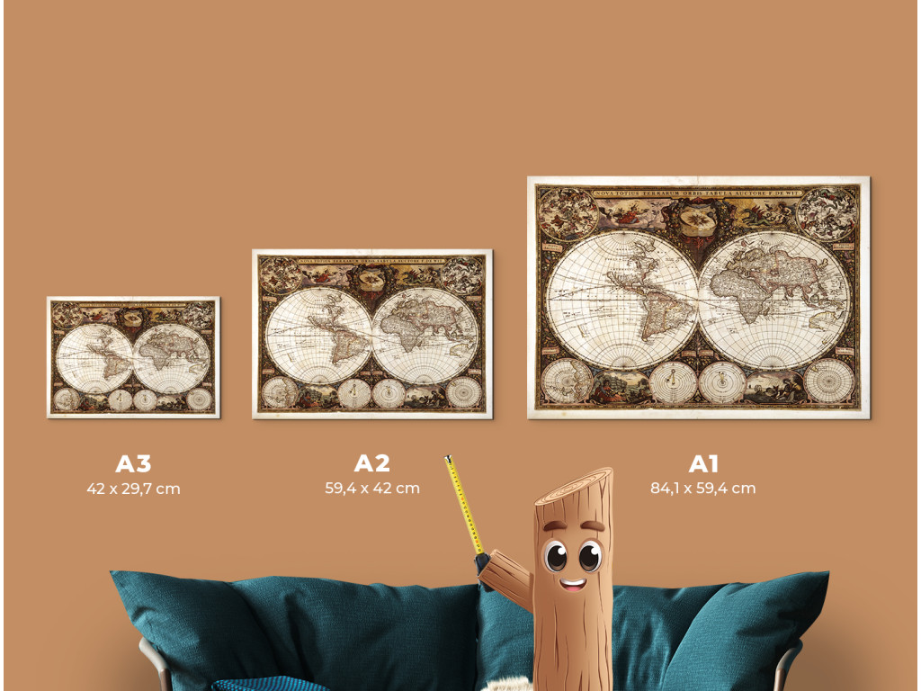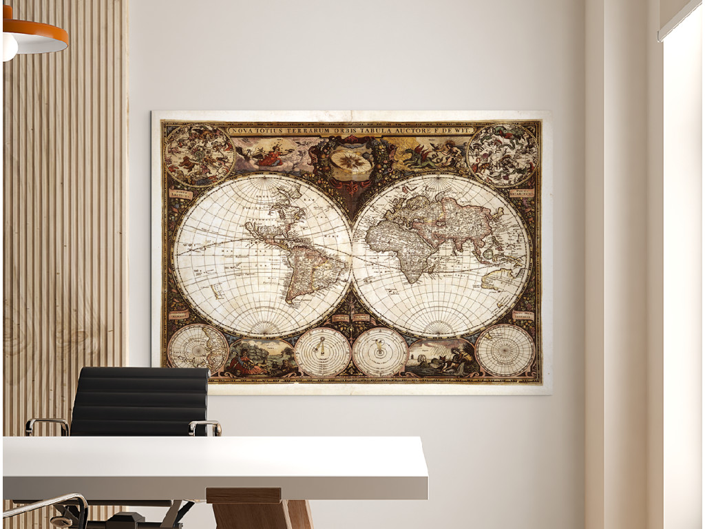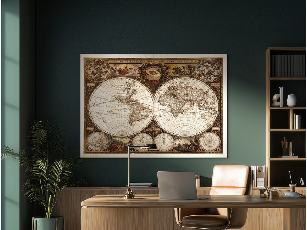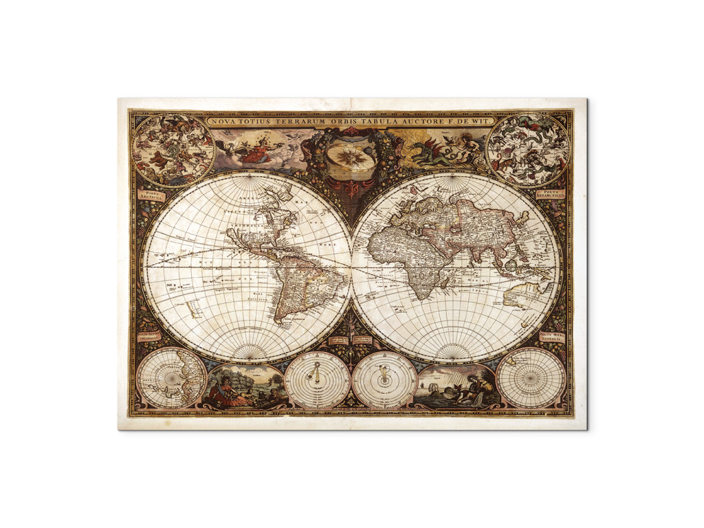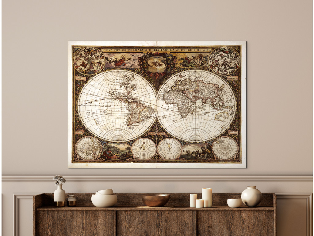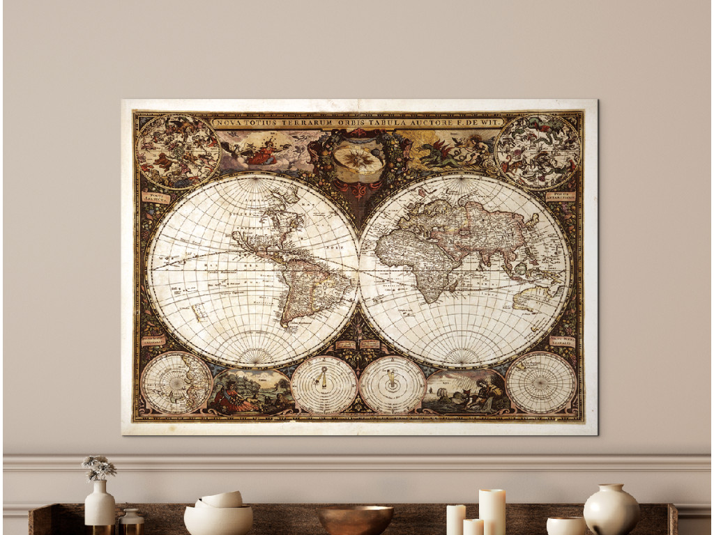 La carte historique du monde de Frederik de Wit de la fin du XVIIe siècle représente la vision du monde de l'époque en deux hémisphères. Les riches ornements avec des allégories et des planètes confèrent à la carte un caractère artistique et collectionnable. Le tableau convient à un bureau, une bibliothèque ou un intérieur représentatif, où il mettra en valeur le rapport à l'histoire et à la découverte.