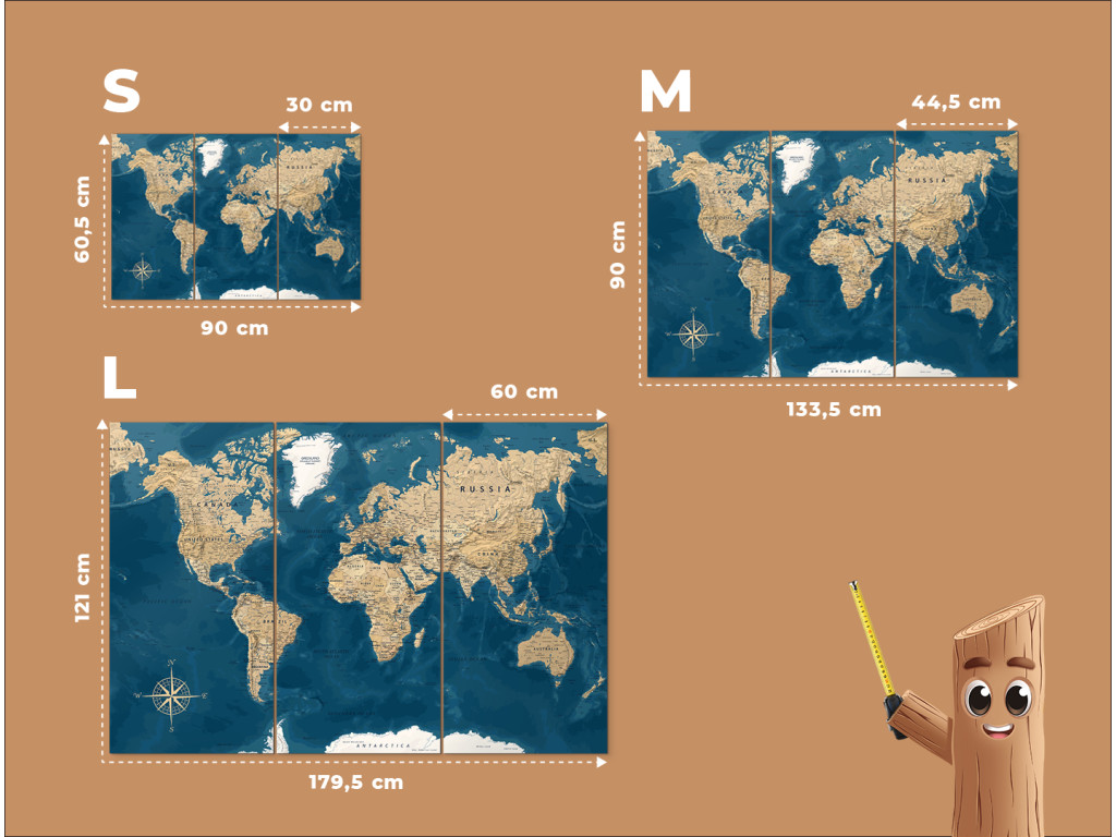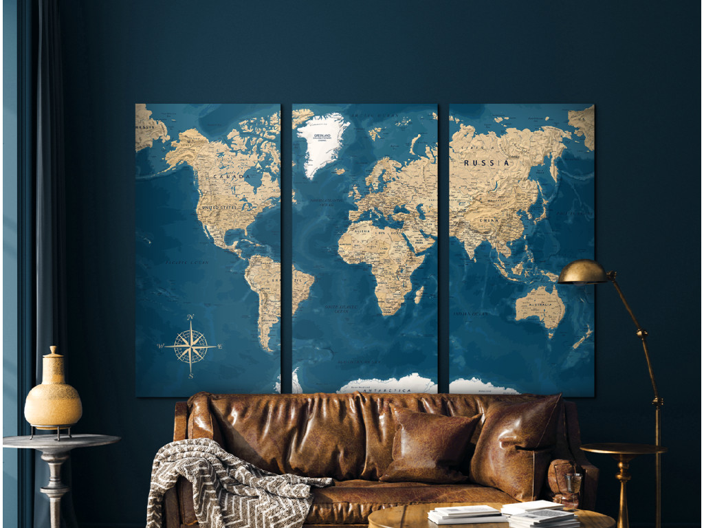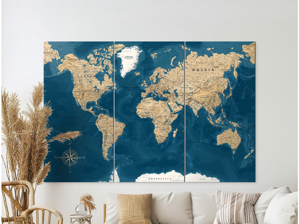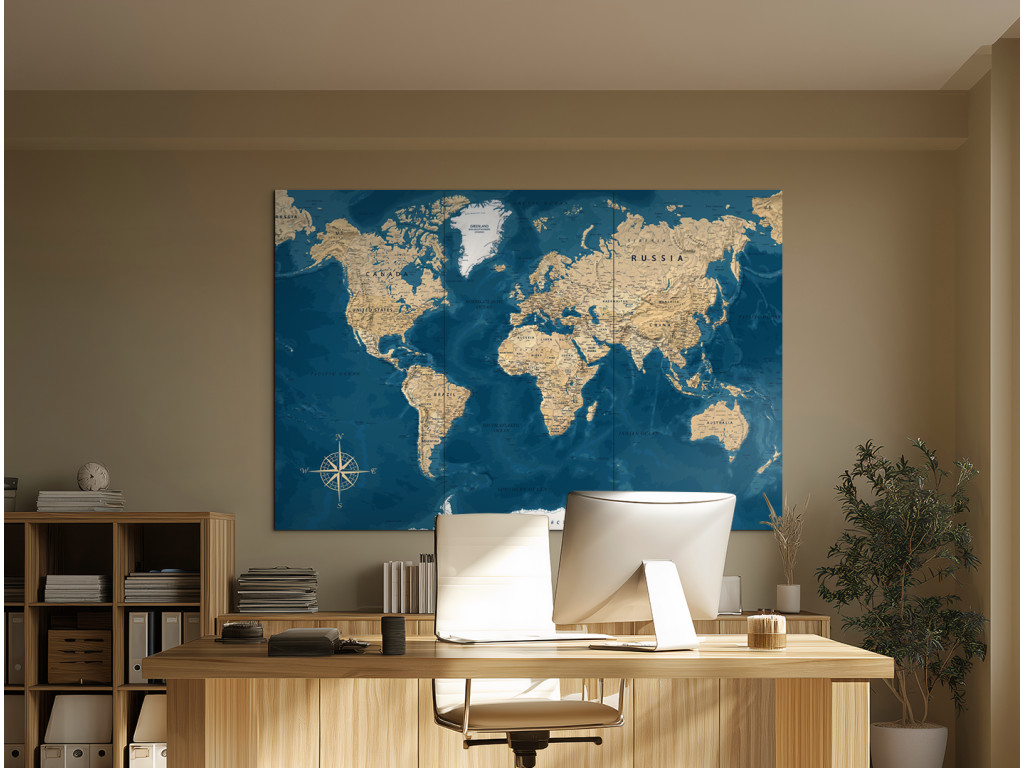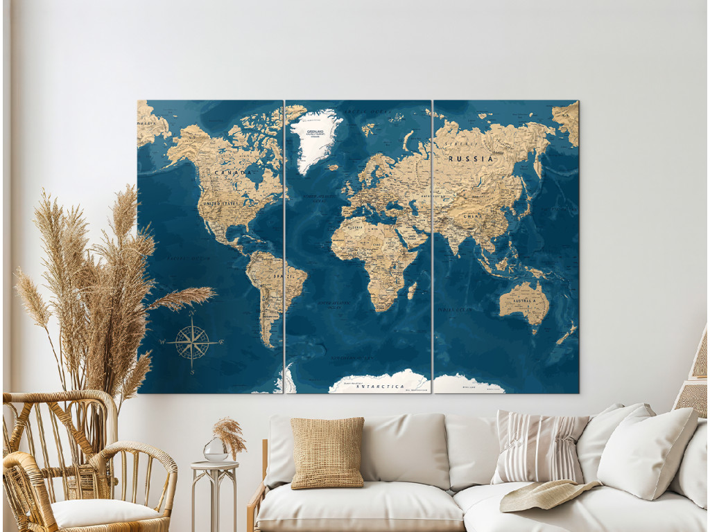 La carte du monde sur trois panneaux combine des océans bleu foncé et des continents clairs beige. La division en trois panneaux verticaux confère à l'image un rythme et un effet décoratif prononcé. Grâce à l'impression UV en haute résolution, les inscriptions et les moindres détails ressortent parfaitement. Le tableau convient à un bureau, une salle de travail ou un intérieur au caractère vintage.