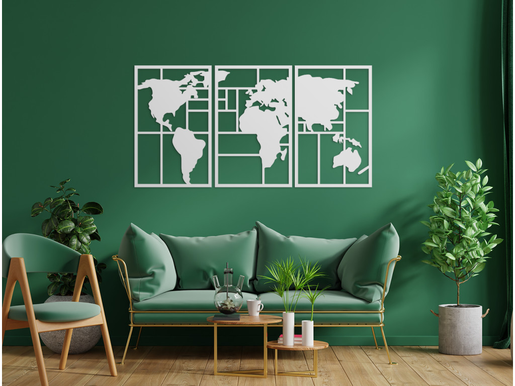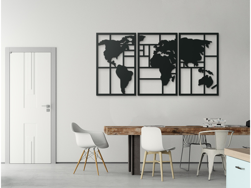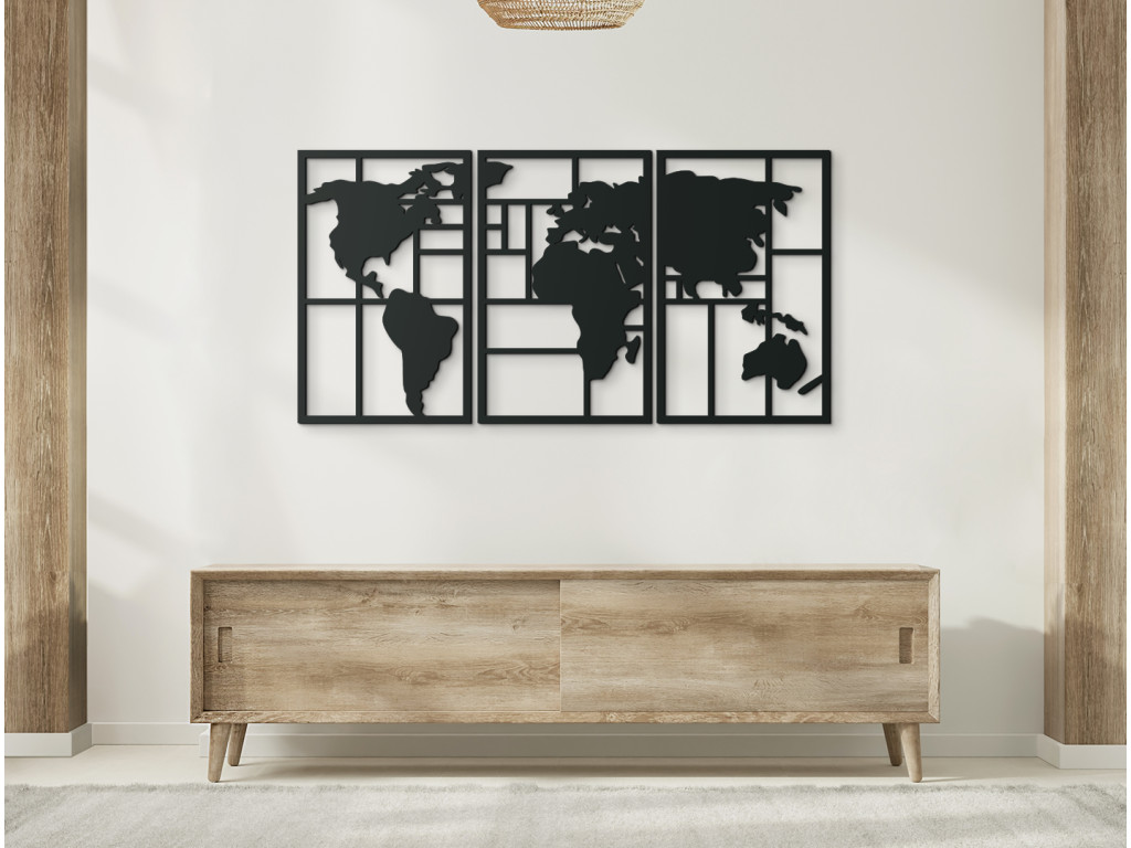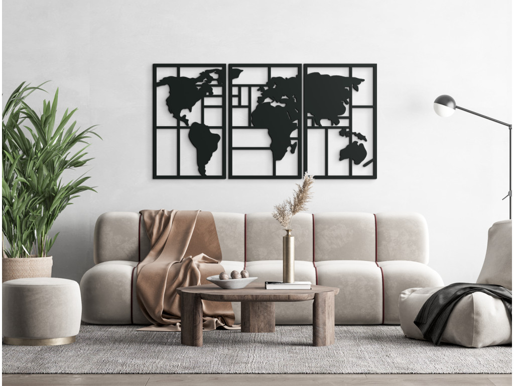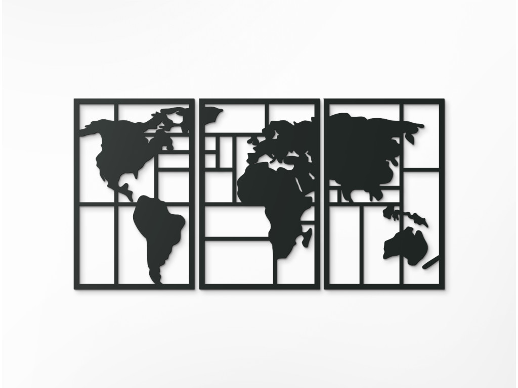 Moderná mapa na stenu vytvorí vo vašom interiéri originálny dizajn a cestovateľský nádych. Obraz si vyskladáte z 3 dielov, ktoré spolu vytvoria nádhernú mapu sveta na stenu. Svetadiely dopĺňajú horizontálne a vertikálne línie. Mapa sveta sa hodí do domáceho aj firemného prostredia. Jednoducho všade tam, kde vaša duša báži po cestovaní.