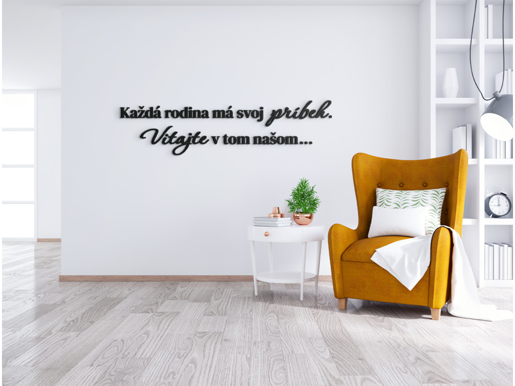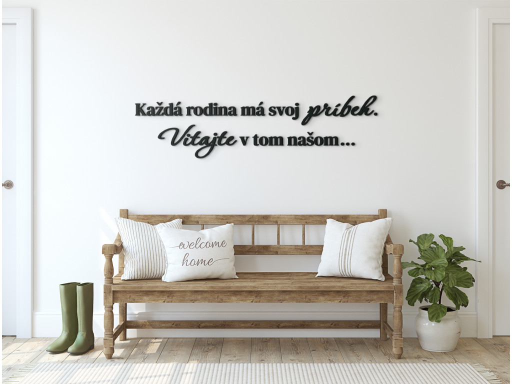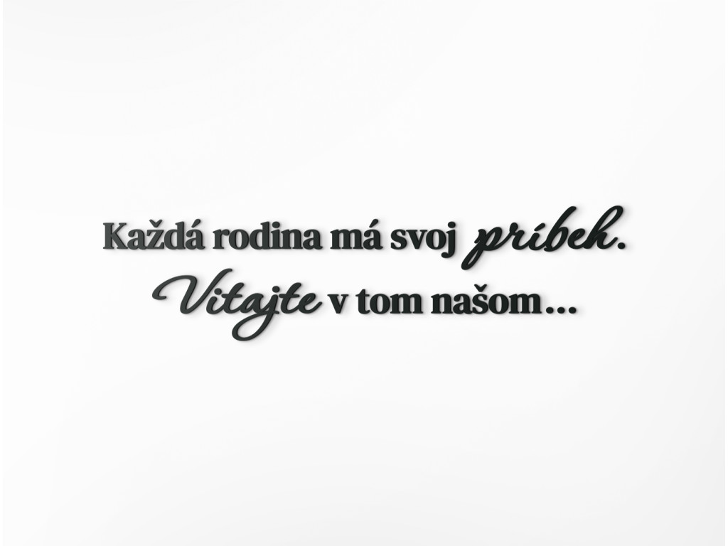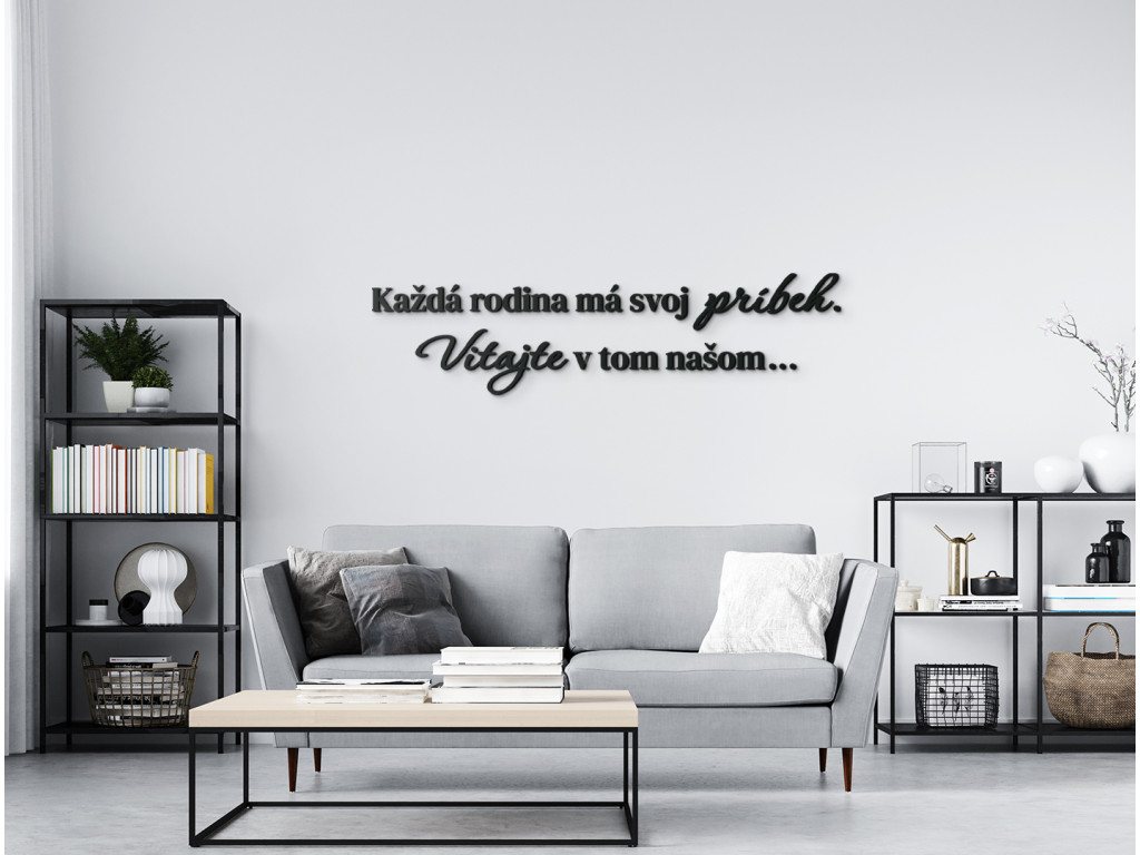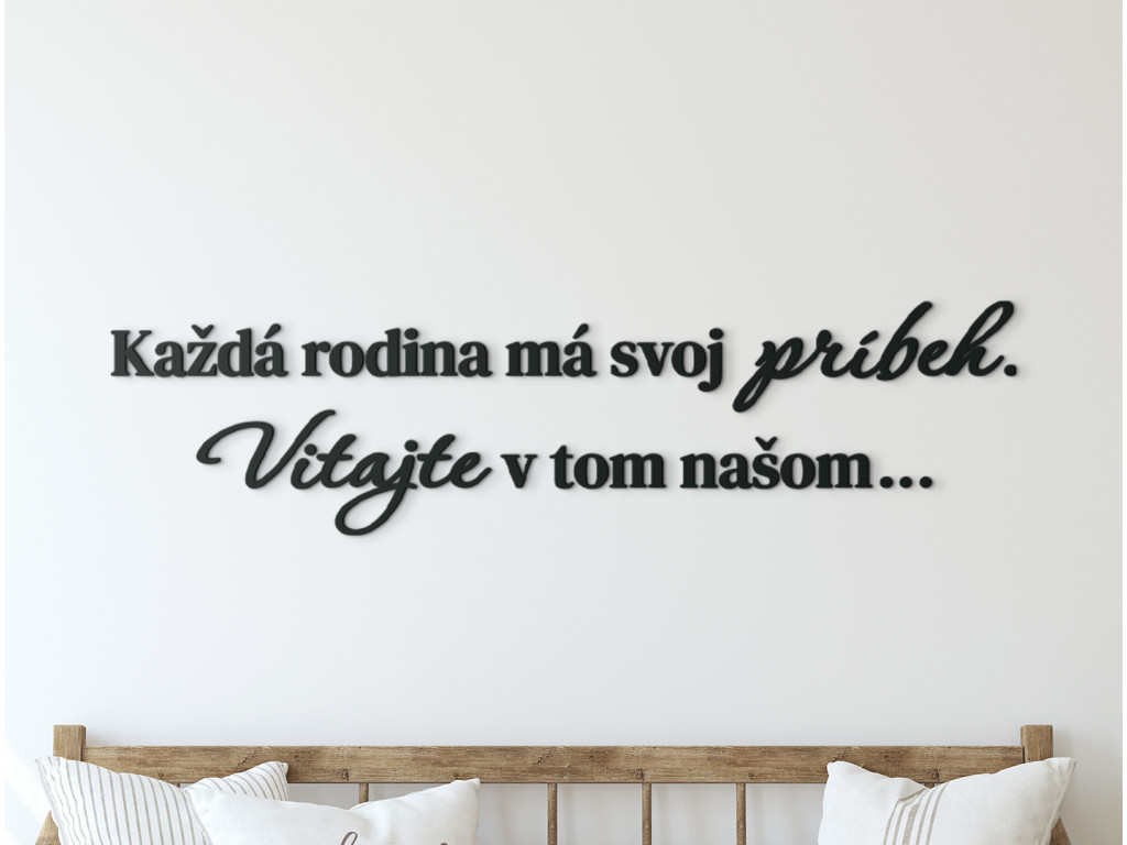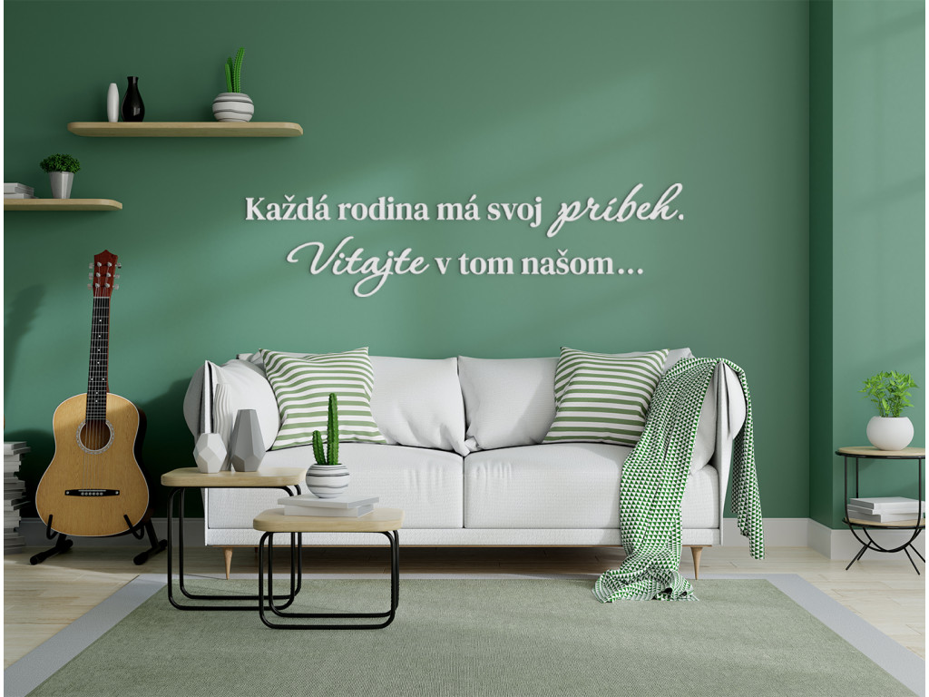 Citát na stenu "Každá rodina má svoj príbeh. Vitajte v tom našom...." je skvelým oživením fádnych stien v obývačke, detskej izbe, kuchyni alebo spálni. Trendový dizajn a pôsobivý obsah výroku zaujmú už na prvý pohľad. Vybrať si môžete z viacerých veľkostí i dekorov, takže ho ľahko zladíte s nábytkom i ďalšími bytovými dekoráciami.