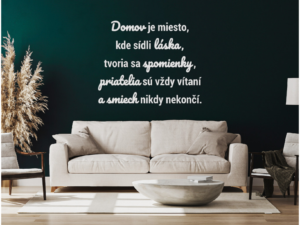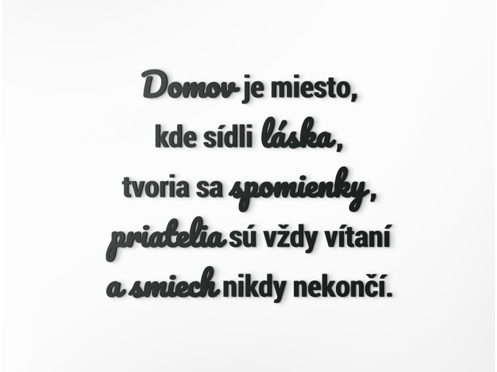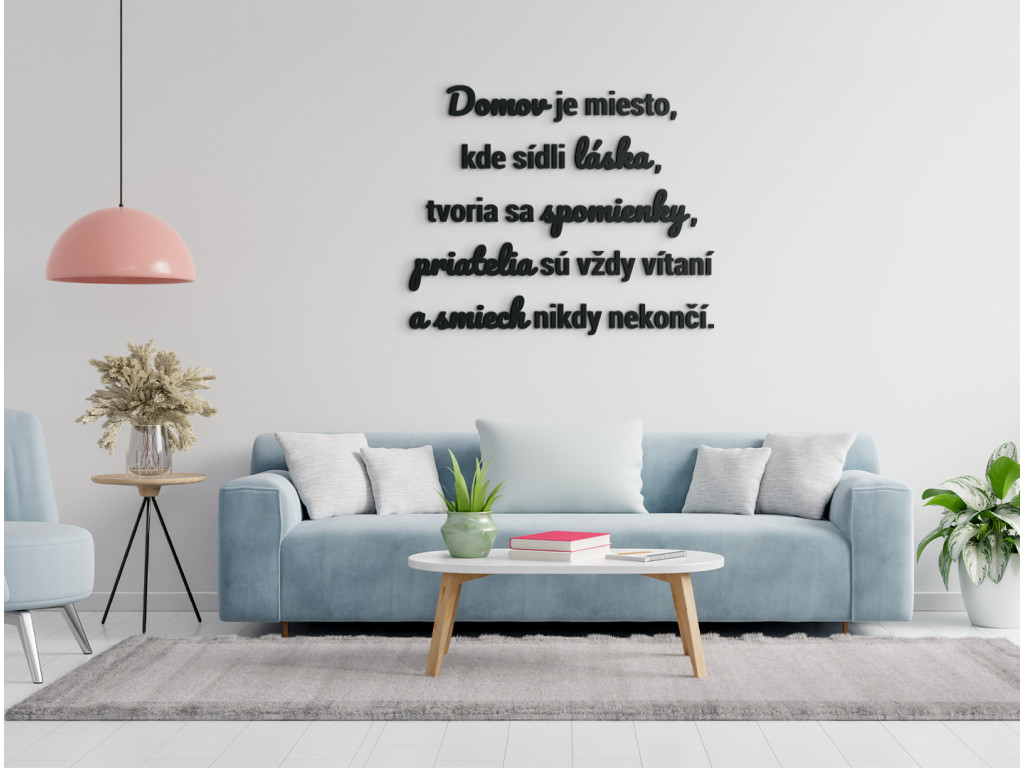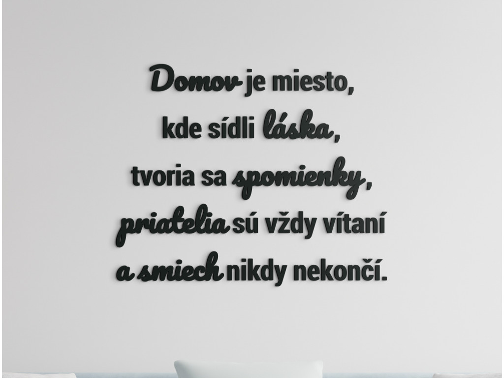 Citát na stenu "Domov je miesto, kde sídli láska, tvoria sa spomienky, priatelia sú vždy vítaní a smiech nikdy nekončí" je vhodným doplnkom do domácnosti pre každého, kto si váži svoju rodinu a cení si svoj domov. Drevená dekorácia poslúži aj ako zaujímavý darček pre blízkych a priateľov. Nalepte ju napríklad nad gaučovú súpravu do obývačky alebo ňou ozdobte stenu v kuchyni.