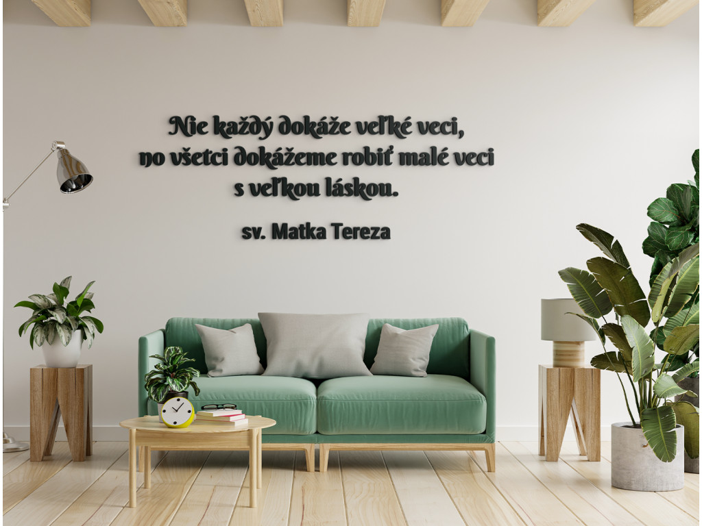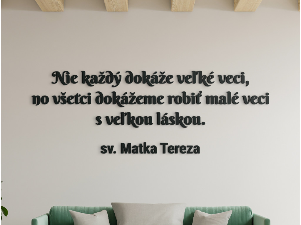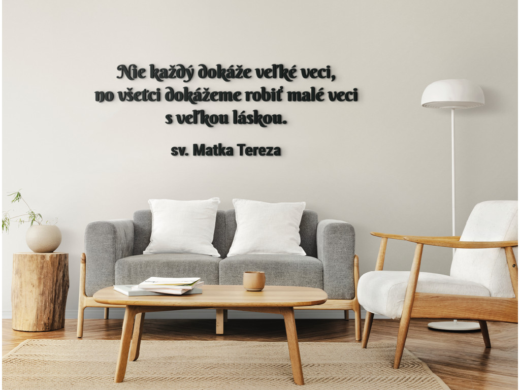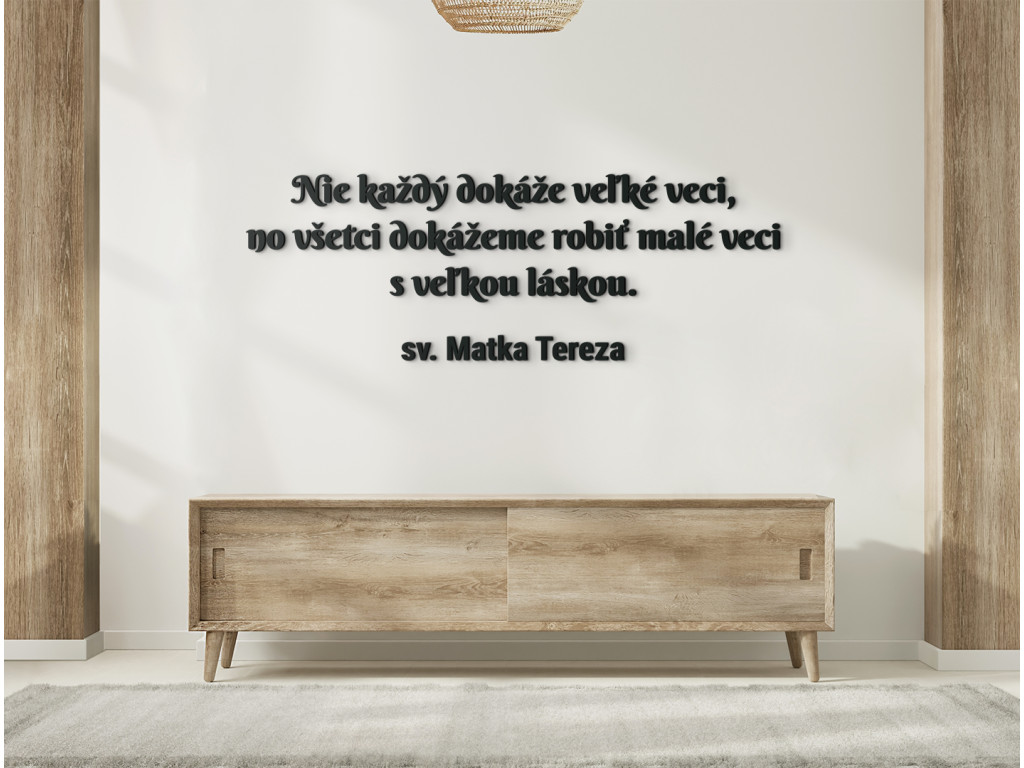 Výrok sv. Matky Terezy "Nie každý dokáže veľké veci, no všetci dokážeme robiť malé veci s veľkou láskou," je oslavou života a možností, ktoré ponúka. Nalepte si tento drevený citát na stenu na dobre viditeľné miesto, aby ste ho mali stále pred očami. Vďaka kvalitnému vyhotoveniu vám bude robiť spoločnosť po dlhé roky. Nikdy totiž neviete, či ktorý deň sa pre vás stane tým najkrajším.