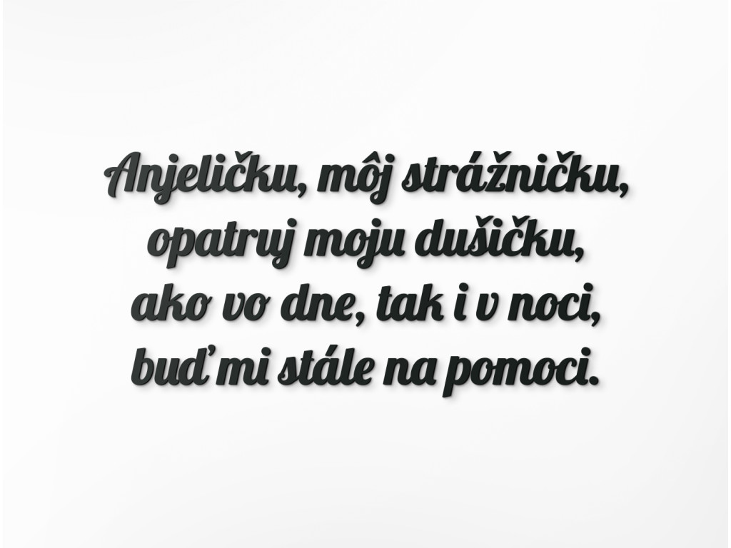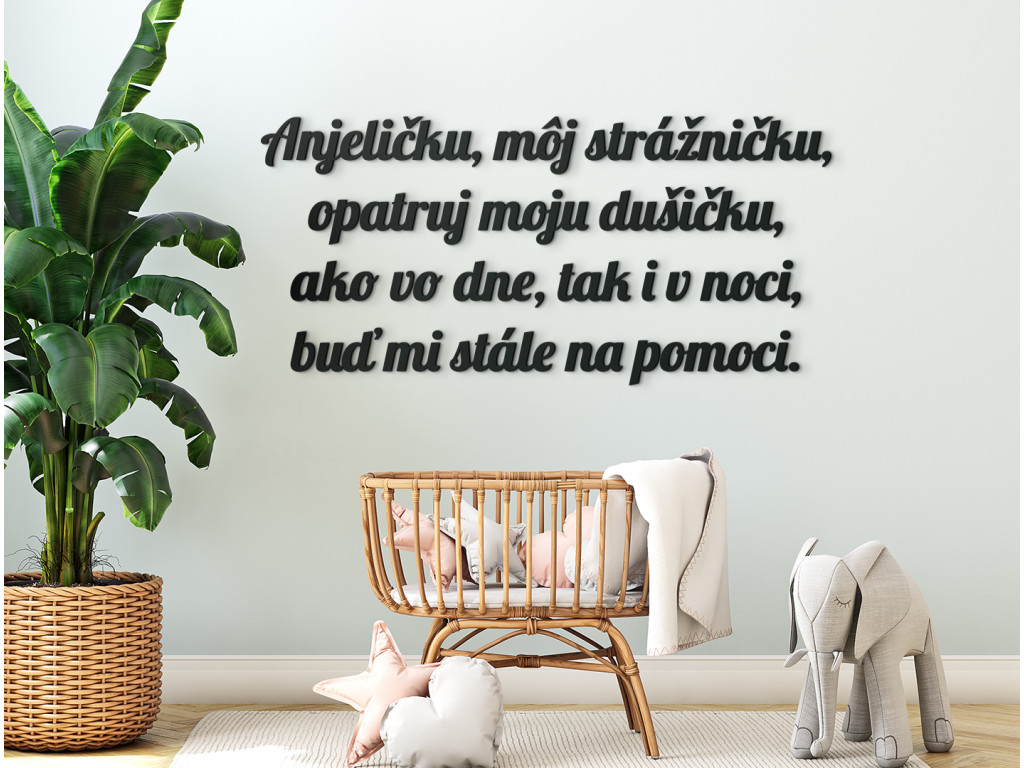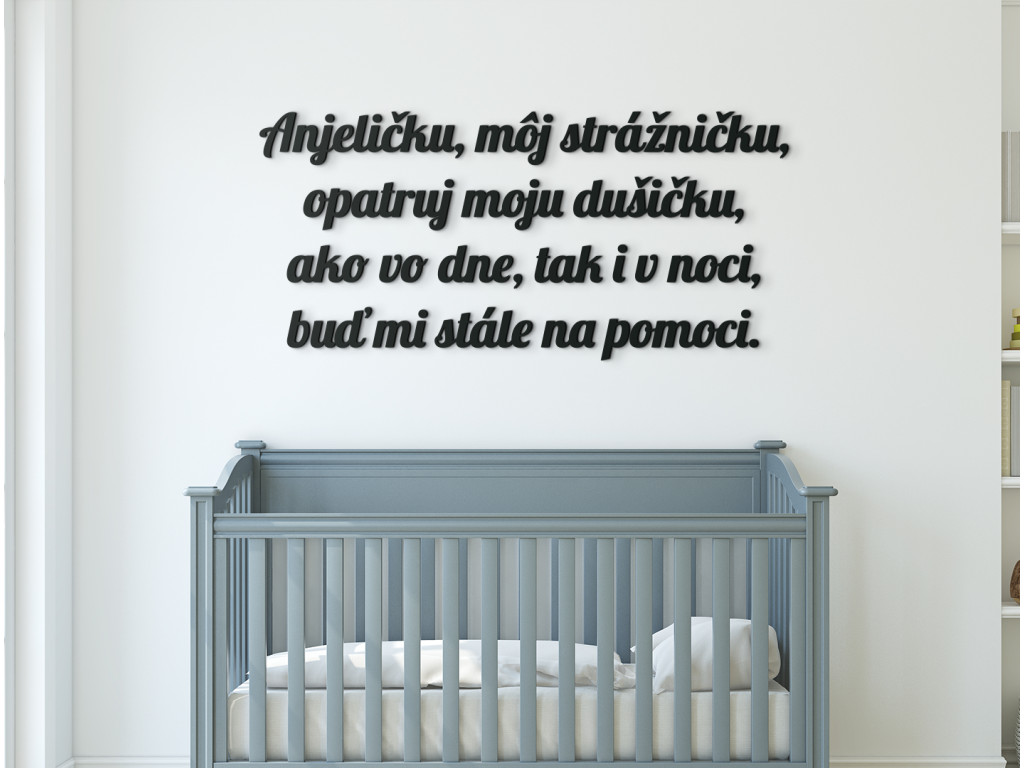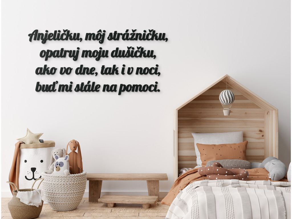 Krásna modlitba z dreva na stenu "Anjeličku, môj strážničku, opatruj moju dušičku, ako vodne, tak i v noci, buď mi stále na pomoci." Nálepka krásne dotvorí dizajn celej miestnosti a pritiahne na seba všetky pohľady. Vynikajúci doplnok do detskej izby.