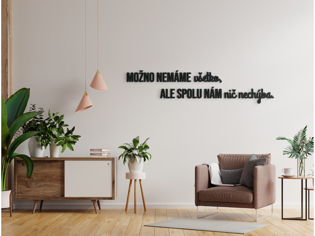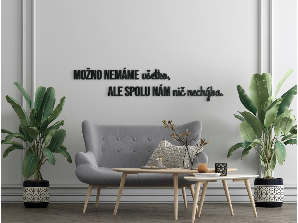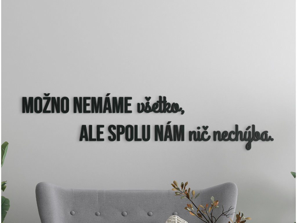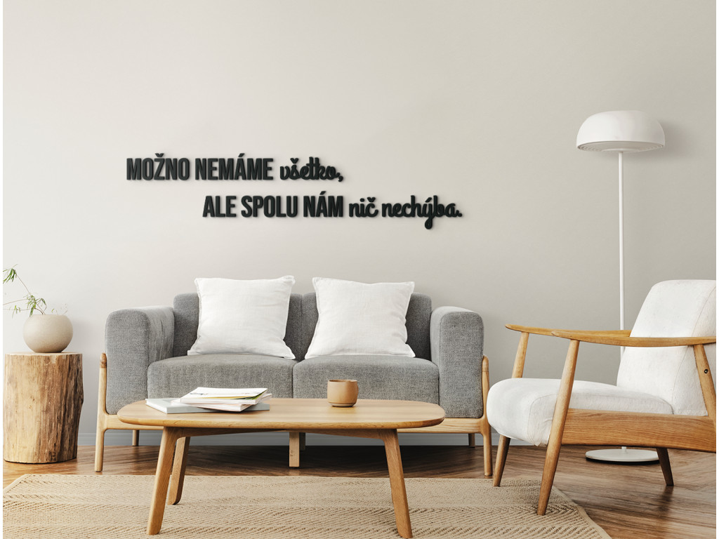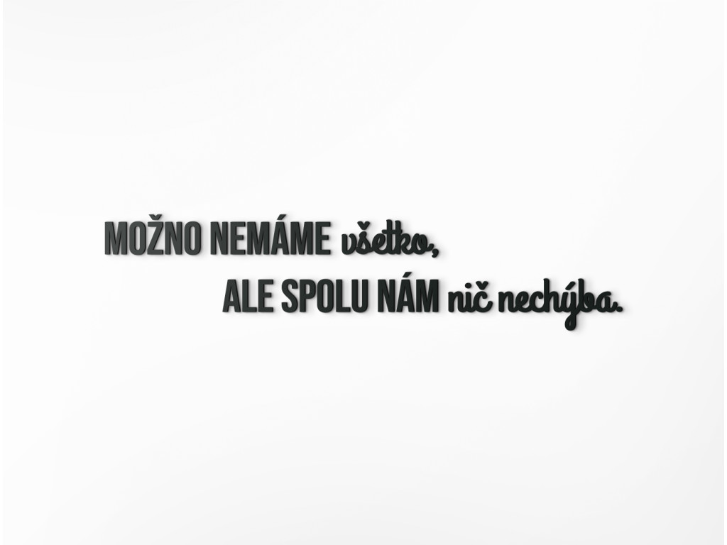 Osviežte svoju domácnosť krásnym mottom v podobe dreveného citátu na stenu. Výrok "Možno nemáme všetko, no spolu nám nič nechýba." hovorí o vašom vzťahu k najbližším výrečnejšie ako tisíce krásnych slov. Nálepku môžete nalepiť na stenu napríklad do spálne, obývačky či chodby. Všade vytvorí jedinečnú atmosféru plnú lásky a vzájomnej spolupatričnosti.