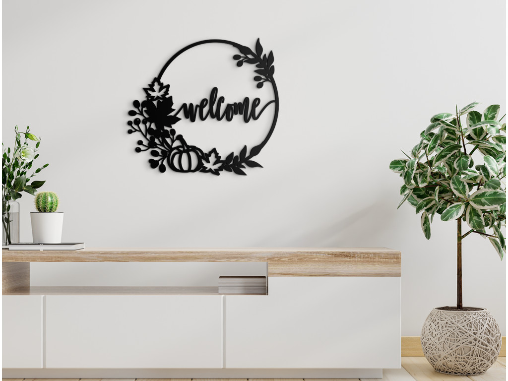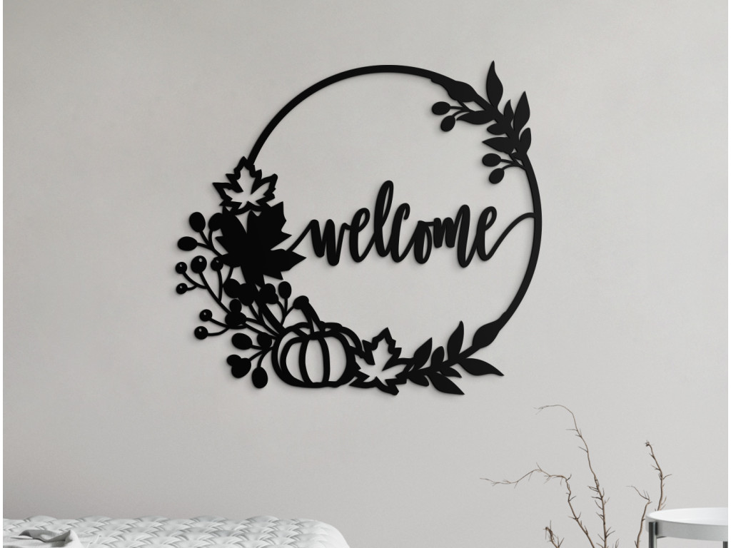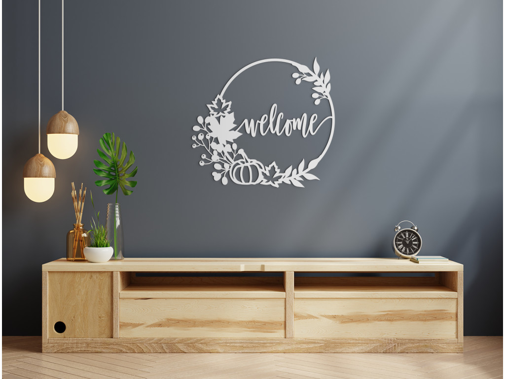 Privítajte vašich hostí nápisom Welcome. Drevený veniec na dvere s týmto nápisom môžete umiestniť do predsiene, chodby. Nápis sa nachádza v strede dreveného venca s jesennou tematikou. Dekorácia sa hodí do moderných a minimalistických priestorov.