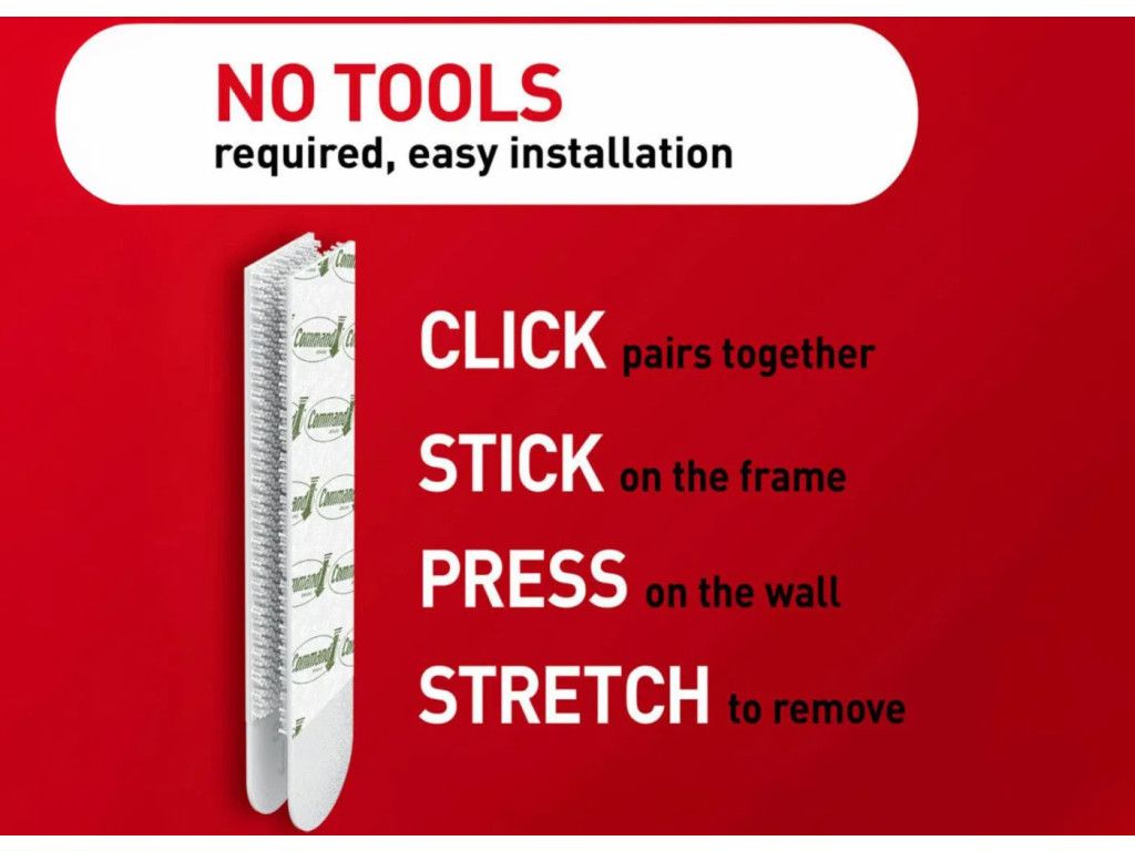 Découvrez une solution simple et fiable pour accrocher des tableaux, des photos ou des décorations sans percer ni abîmer les murs : les bandes adhésives 3M Command™ Picture Hanging Strips. Ces bandes de taille L utilisent un système innovant de type velcro qui permet de fixer, détacher et repositionner facilement vos tableaux.