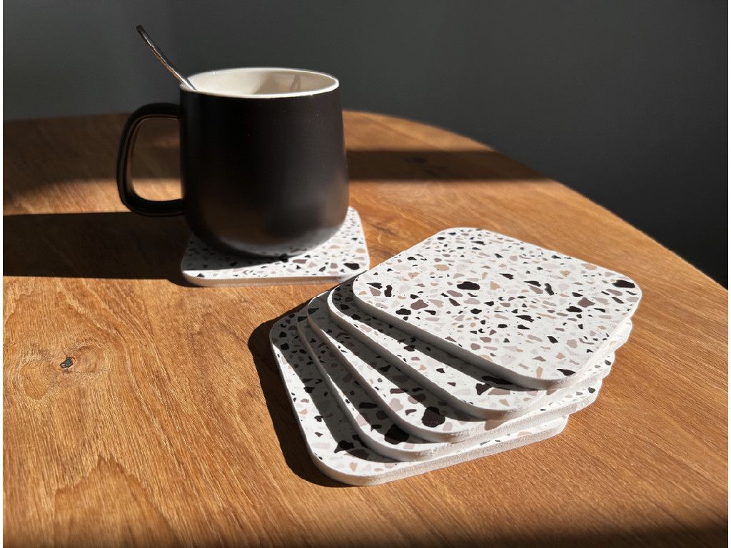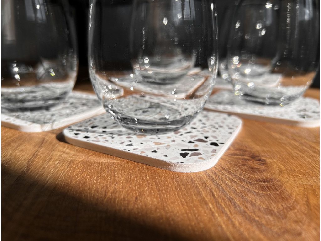 Chaque sous-verre mesure 10 × 10 cm, a une épaisseur de 5 mm et des coins arrondis, ce qui lui confère un aspect élégant et un toucher agréable. Leur motif terrazzo apporte à la pièce un caractère moderne et frais qui s’intègre parfaitement dans les intérieurs minimalistes comme dans les espaces plus ludiques.