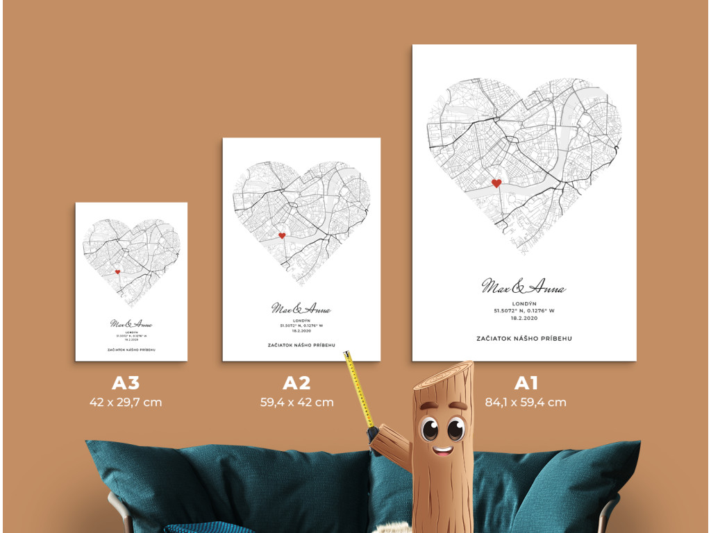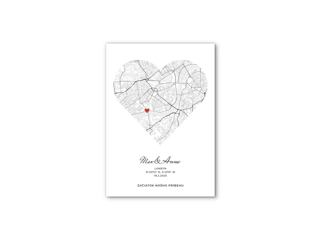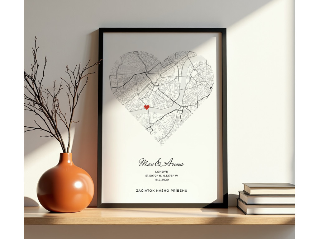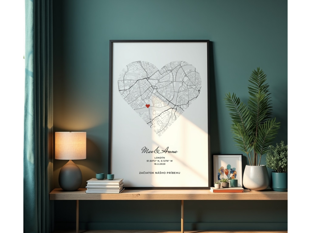 Un tableau avec une carte en forme de cœur sur laquelle est indiqué votre lieu exceptionnel. Vous pouvez ajouter vos noms, votre emplacement, la date et un texte personnel, ce qui créera une décoration unique et profondément émouvante. Le cadeau idéal pour votre partenaire, pour un anniversaire, des fiançailles, un mariage ou comme souvenir d'un moment que vous souhaitez garder à jamais gravé dans votre mémoire.