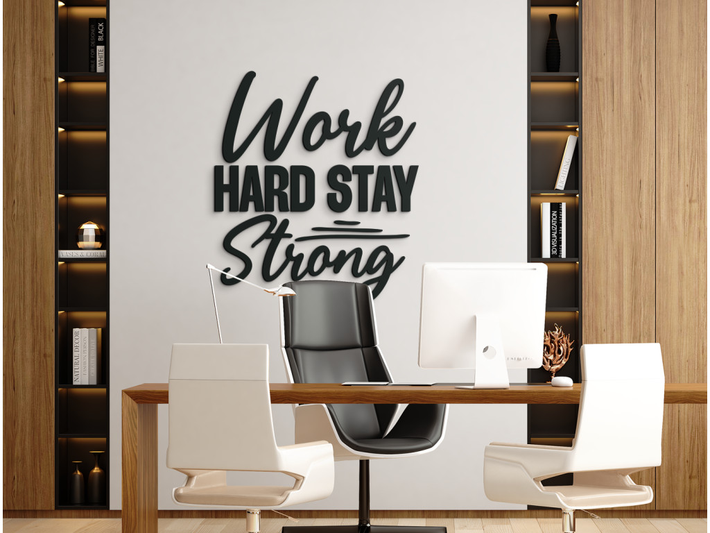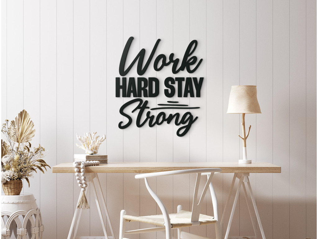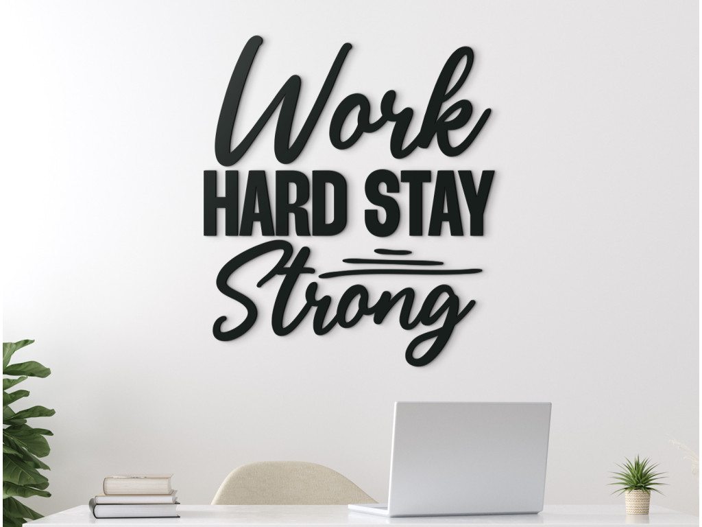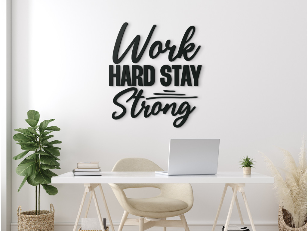 Si vous avez besoin d'un peu de motivation pour travailler ou étudier, l'inscription « Work hard stay strong », dans un design créatif, est faite pour vous. En regardant le mur, cette devise en anglais vous encouragera à agir chaque jour. L'endroit idéal pour cette citation est donc une chambre d'enfant ou d'étudiant, un bureau ou une salle de sport. Grâce à ses 3 dimensions et ses 8 couleurs, elle s'harmonise facilement avec n'importe quel intérieur.