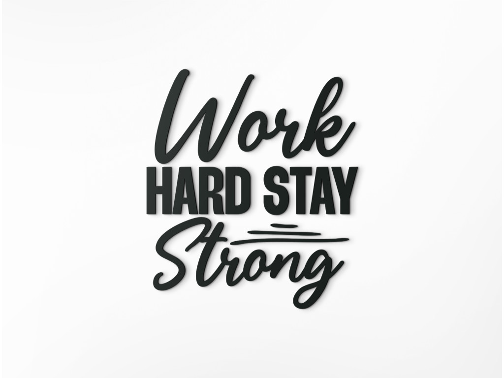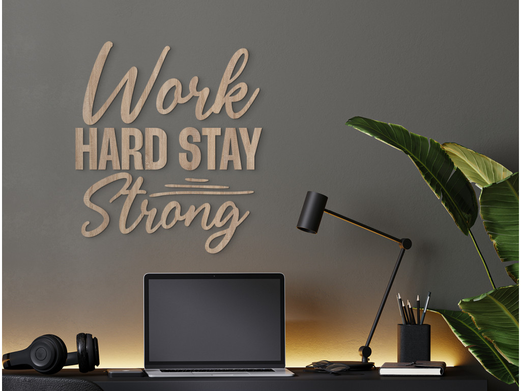 Táto drevená nálepka vám svojím povzbudzujúcim odkazom pripomenie, že bez práce nie sú koláče. Jej dizajn tvoria rôzne typy písma, ktoré vytvárajú štýlovú motivačnú dekoráciu na stenu. Výrok v preklade znamená Pracuj tvrdo a zostaň silný, takže sa hodí napríklad do kancelárie, domácej posilňovne alebo študentskej či internátnej izby.