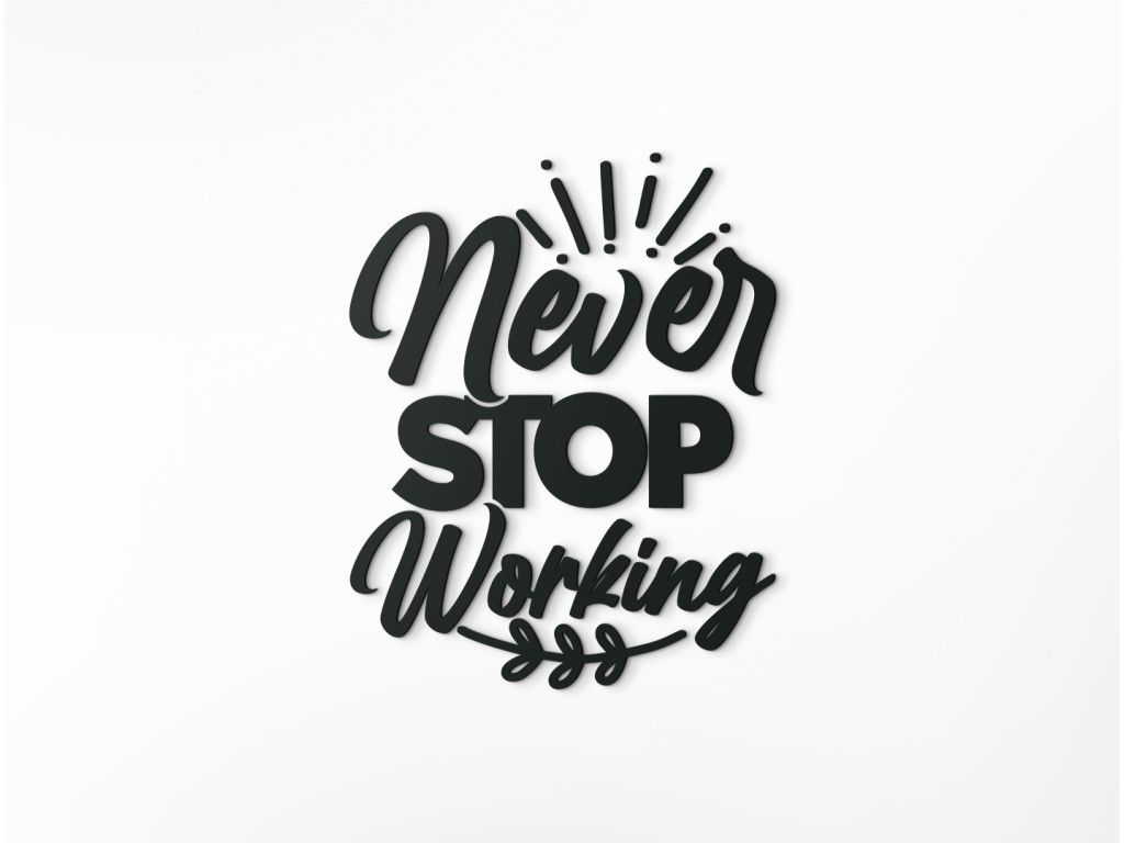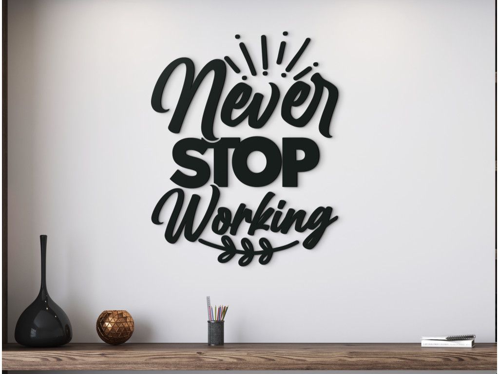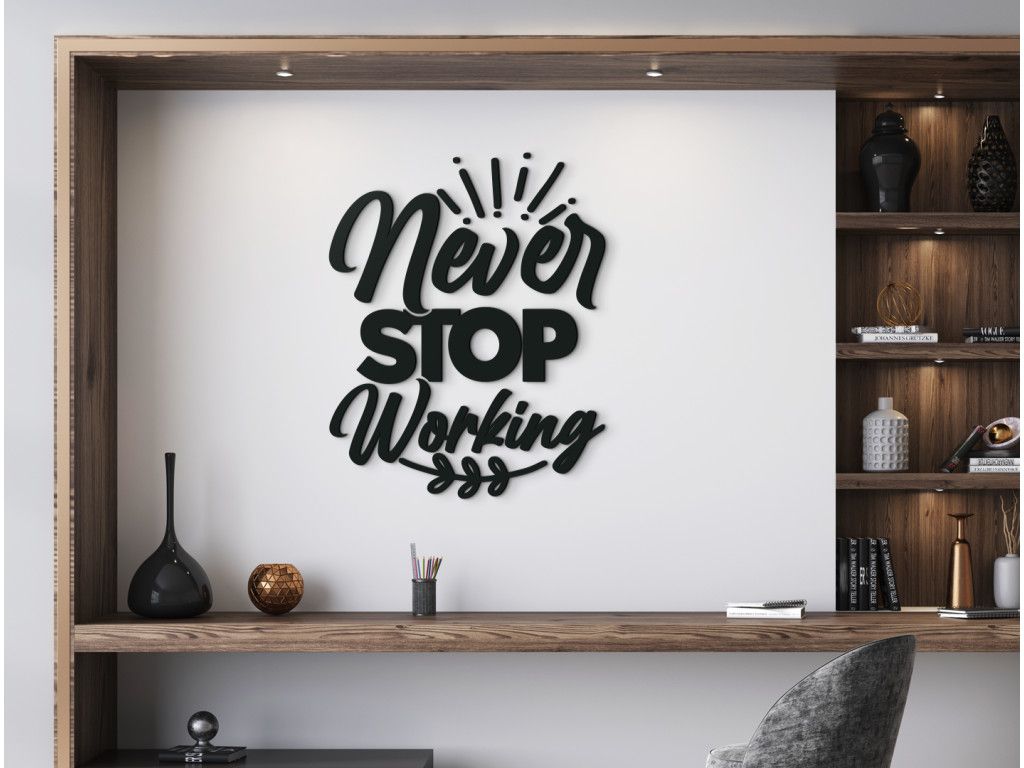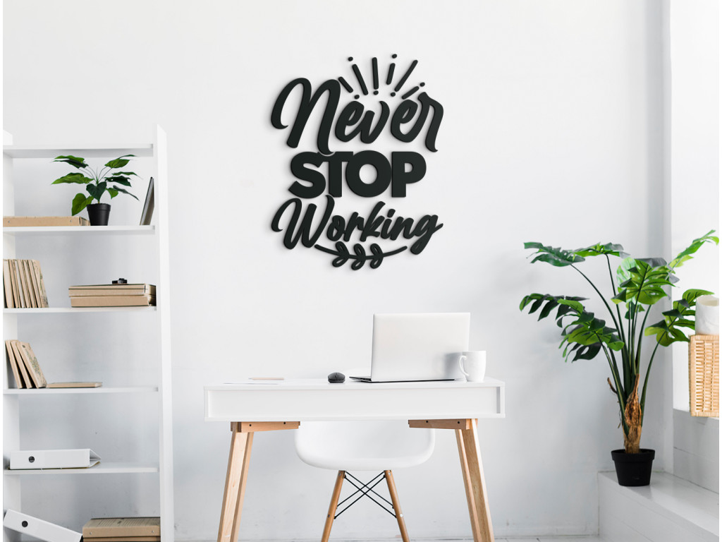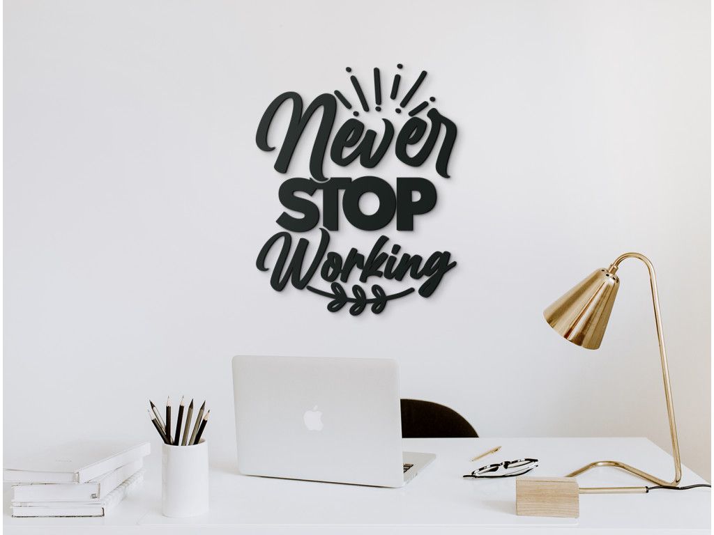 Kreatívnu dekoráciu z dreva tvoria rôzne typy písma, ozdobné prvky aj lístky. Hravý dizajn je spojený s motivačnou myšlienkou, ktorá vás zakaždým nakopne do nového školského či pracovného dňa. Anglický citát Nikdy neprestávaj pracovať je ideálne umiestniť na dobre viditeľné miesto, napríklad do kancelárie, domácej posilňovne alebo študentskej či internátnej izby.
