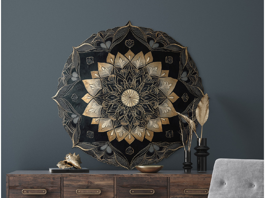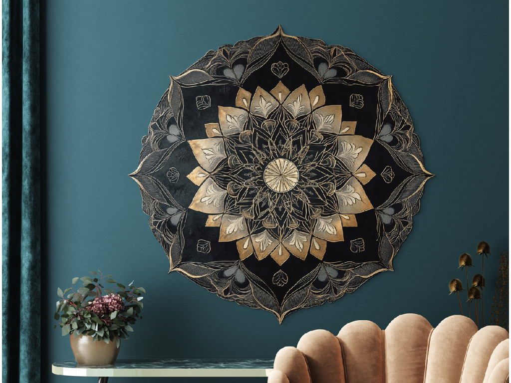 Mandala noir et or détaillée avec un design en couches complexe et des motifs géométriques et floraux répétitifs. Le cercle central est entouré d'ornements symétriques qui créent un effet de profondeur et une surface richement structurée. L'élégante combinaison de tons sombres et d'accents dorés confère à l'œuvre un caractère artistique prononcé.