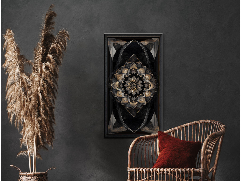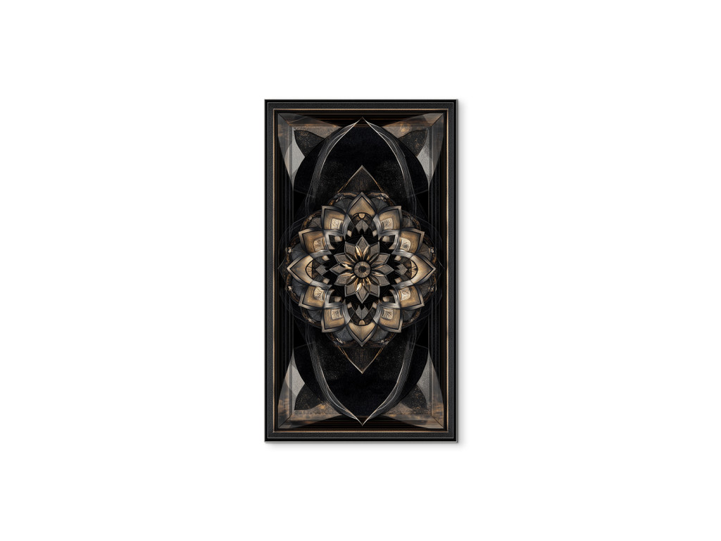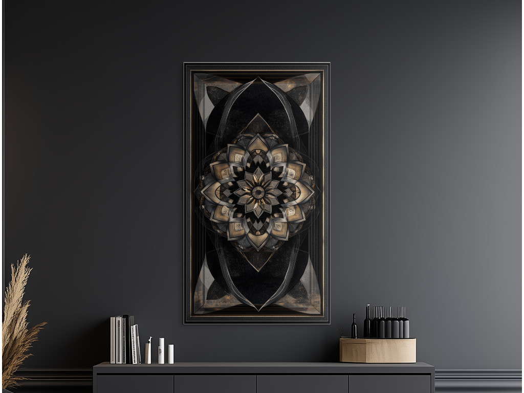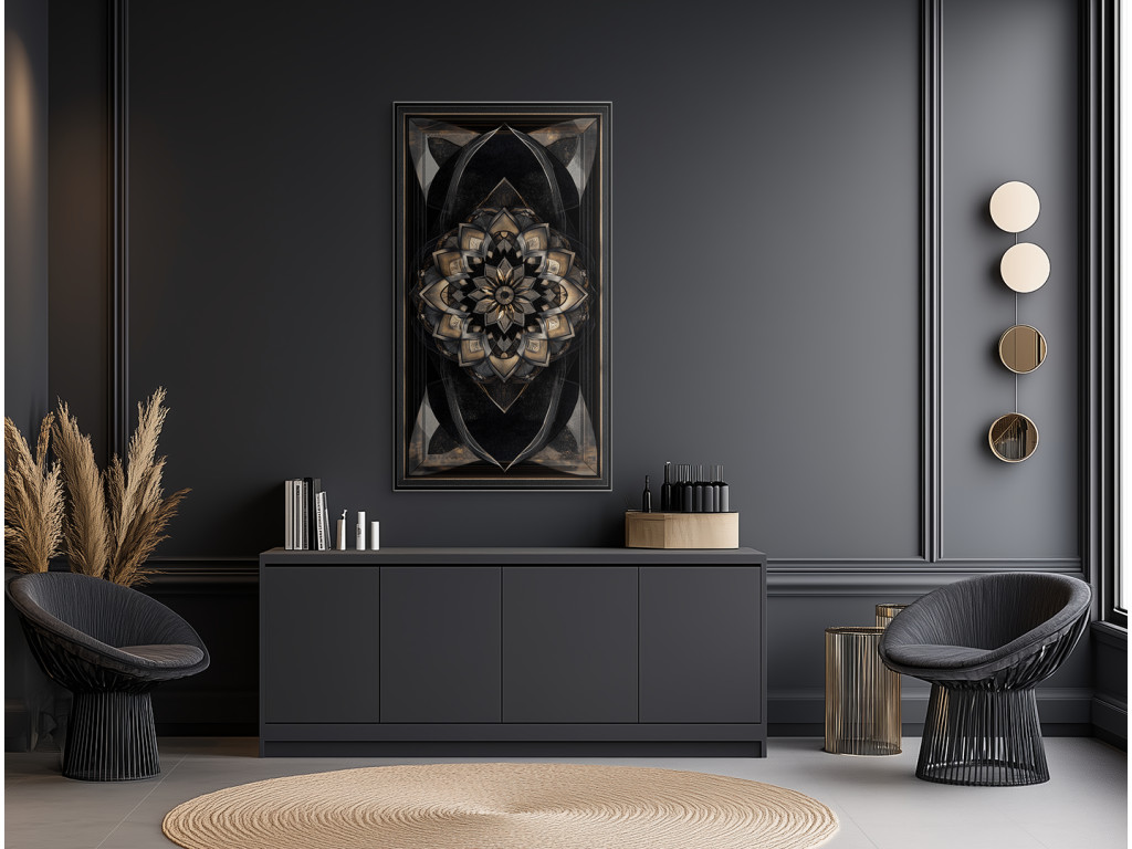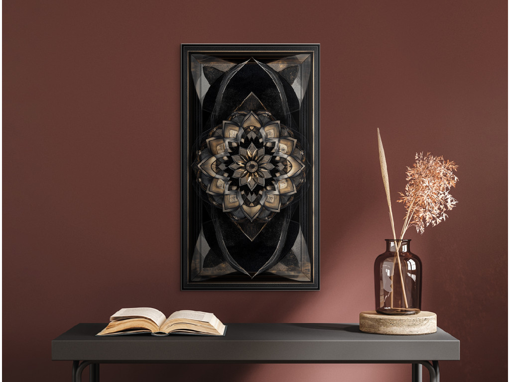Œuvre d'art à orientation verticale avec un riche motif mandala en or et bronze, contrastant avec le fond sombre. Les éléments brillants et la symétrie confèrent à l'œuvre un effet luxueux et spatial, idéal pour un intérieur moderne et sophistiqué.