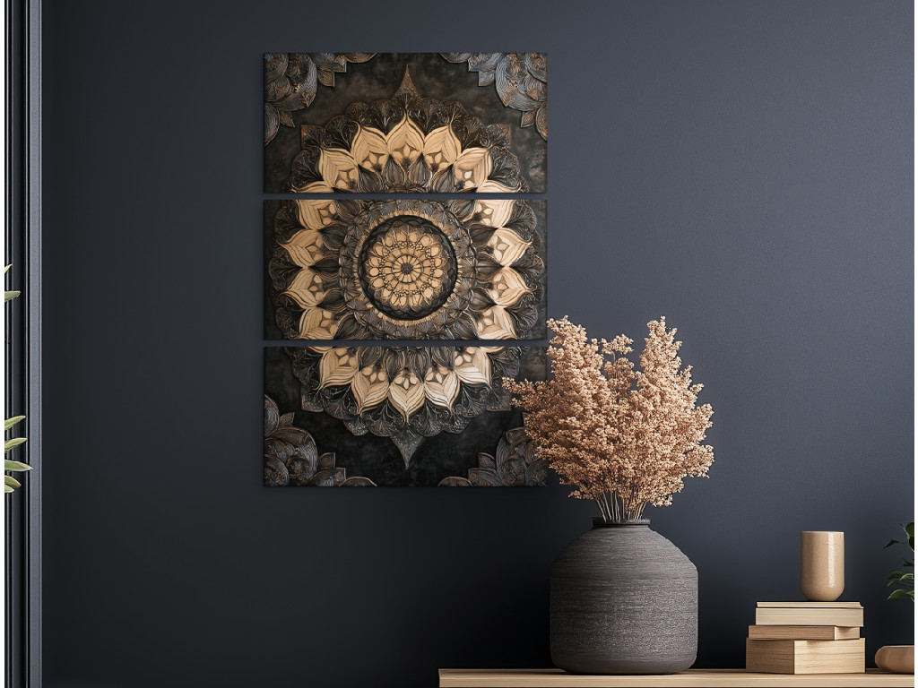 Tableau en trois parties avec un motif mandala détaillé dans des tons terreux et une texture prononcée rappelant la sculpture sur bois. Chaque panneau fait partie d'un ensemble harmonieux avec un relief visuellement impressionnant. Convient comme élément de design dominant dans des intérieurs aux couleurs naturelles ou rustiques.