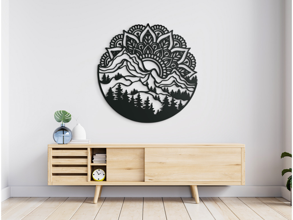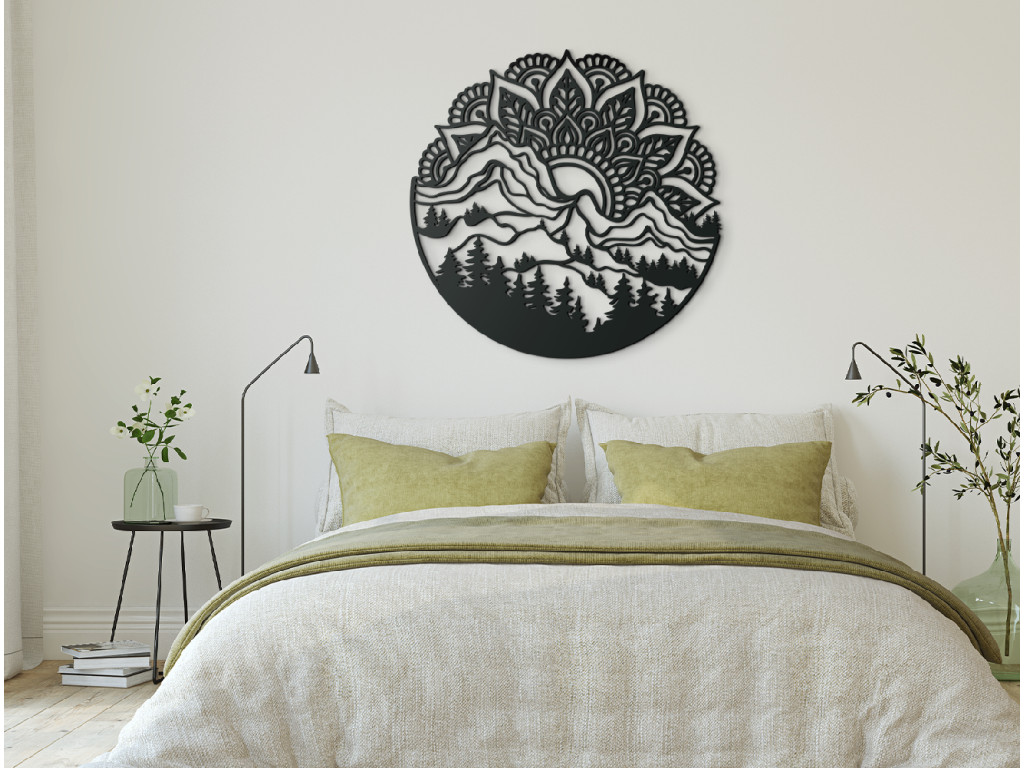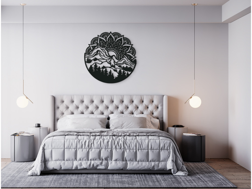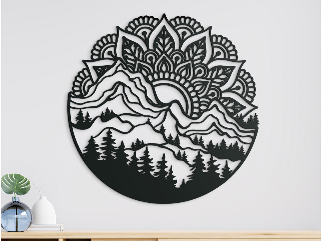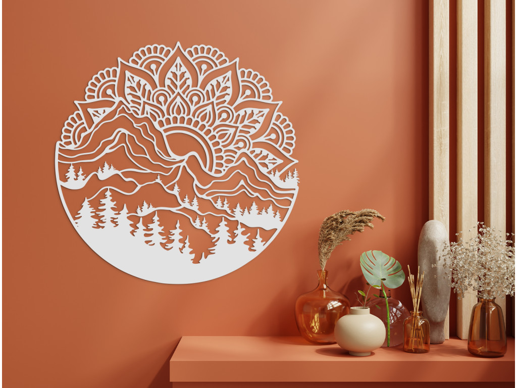Moderná mandala Východ Slnka bude v interiéri tvoriť jednu z najobľúbenejších dekorácií. Mandala je tu vyobrazená ako vychádzajúce Slnko nad horami a lesom. Kombinácia týchto dvoch javov vytvorí v miestnosti originálny dizajn.