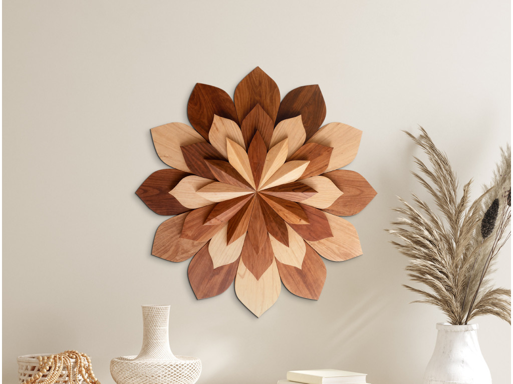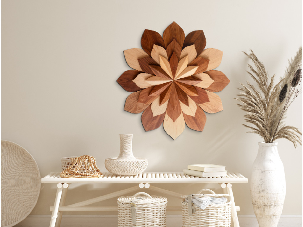 La mandala colorée Fleur en bois représente une fleur finement travaillée, dont chaque pétale présente un décor et une teinte de bois différents. Bien qu’il s’agisse d’une impression UV de haute qualité, l’effet réaliste des structures donne l’impression de véritables couches de bois et d’une texture naturelle. La composition harmonieuse de la mandala symbolise l’équilibre, l’unité et le lien entre la diversité et l’ensemble. Cette mandala devient un élément distinctif et apaisant pour un intérieur moderne et naturel.