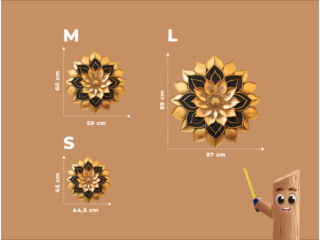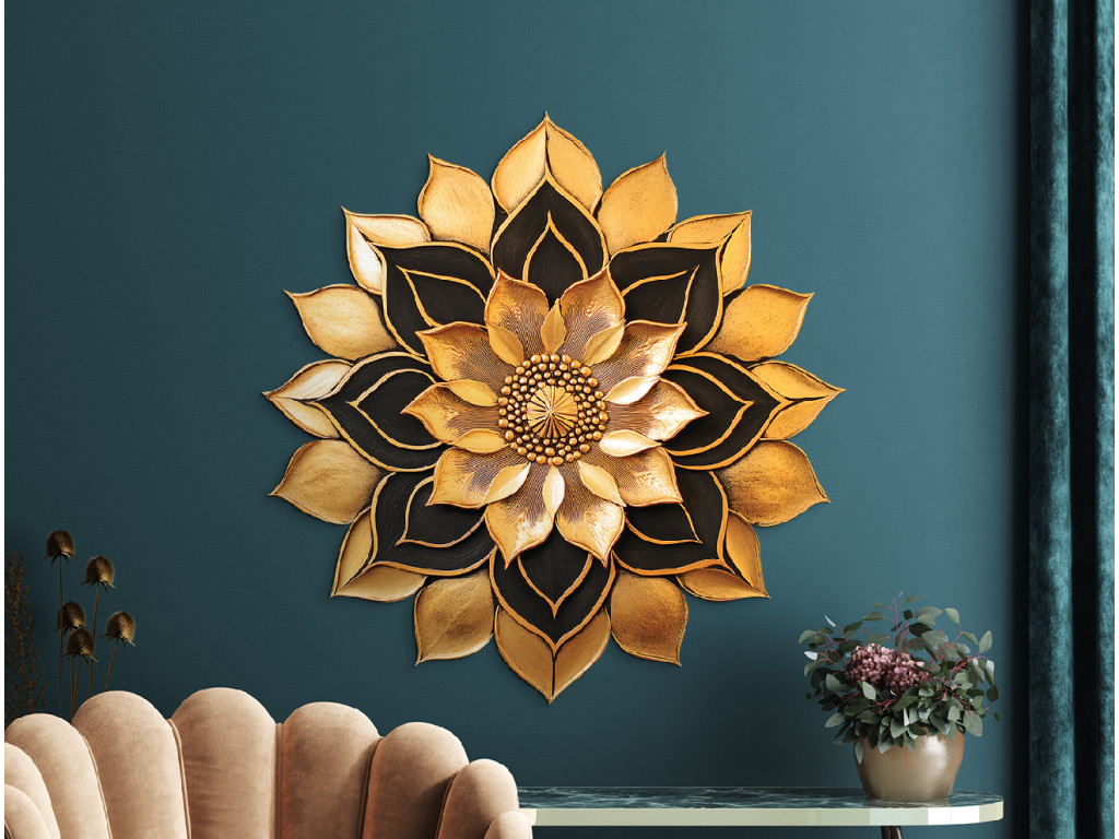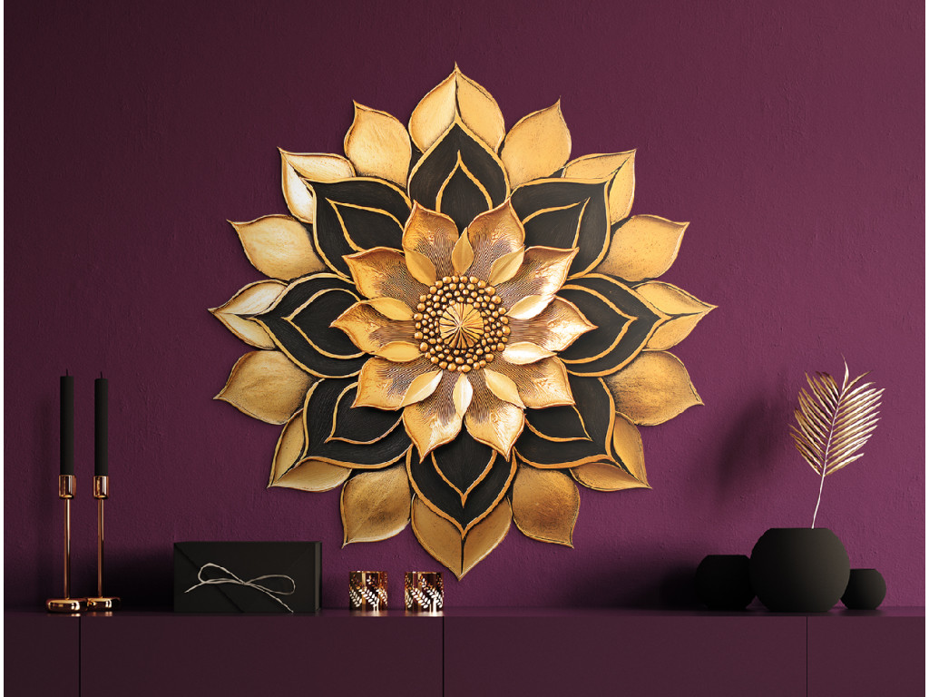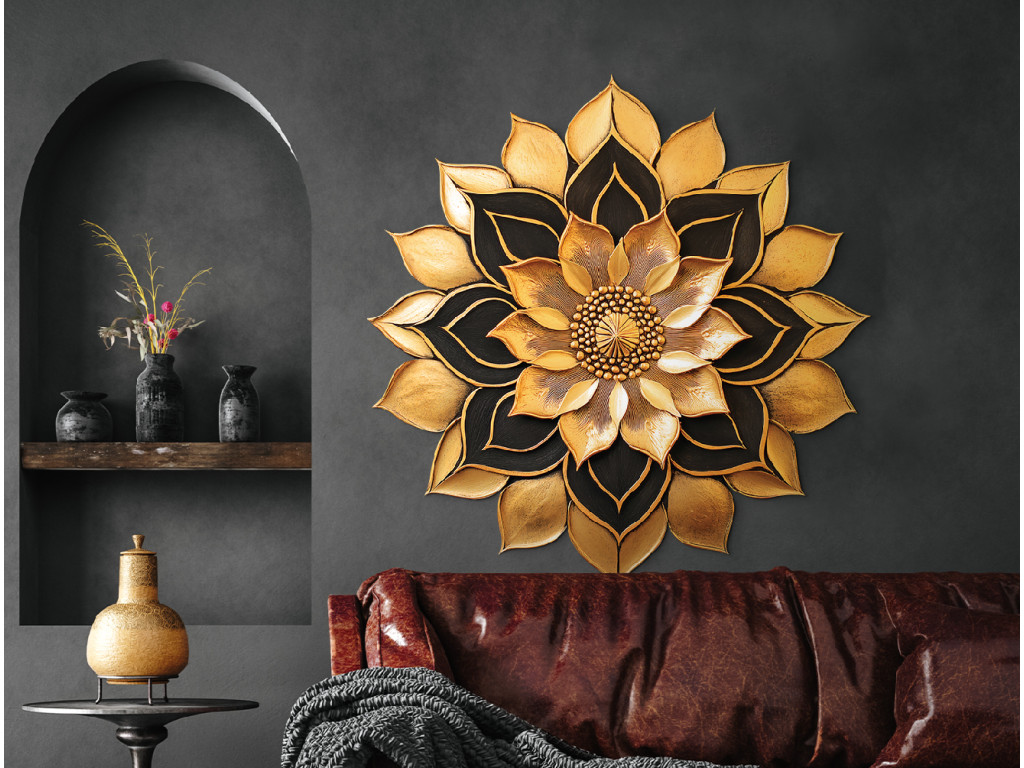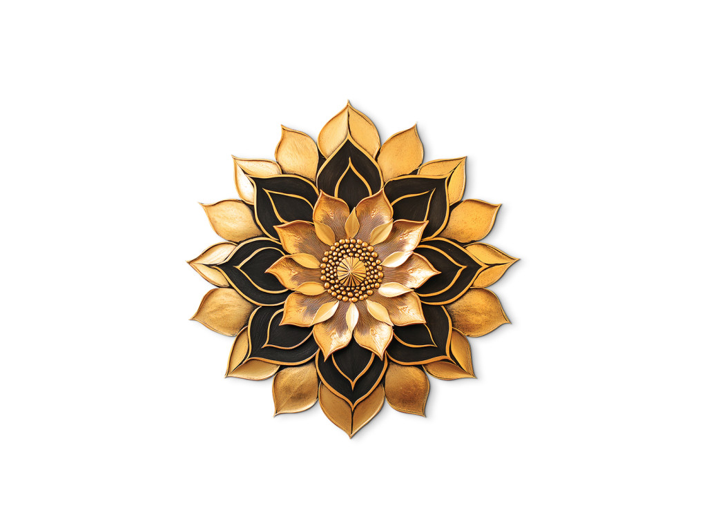 La mandala luxueuse aux tons dorés apporte à l'espace élégance, noblesse et beauté intemporelle. Elle est un symbole puissant de force intérieure et d'abondance.