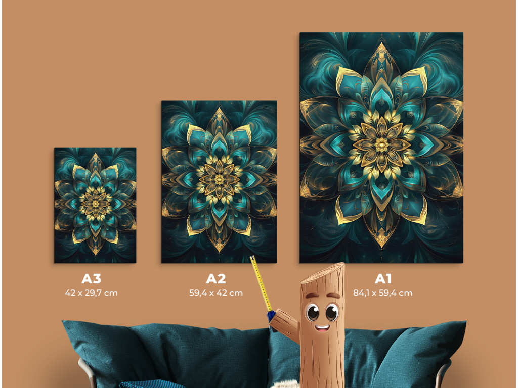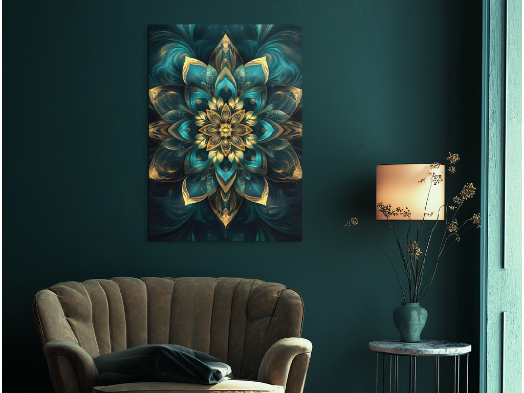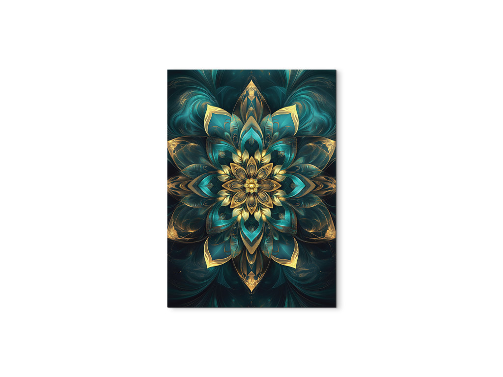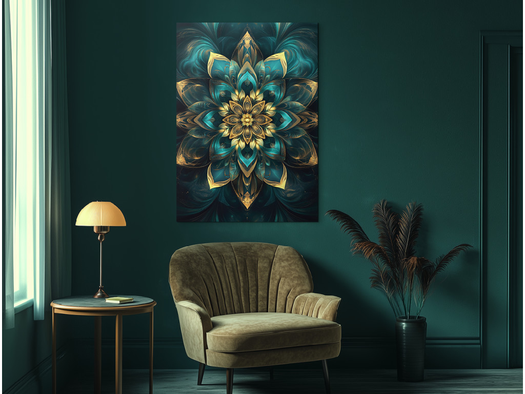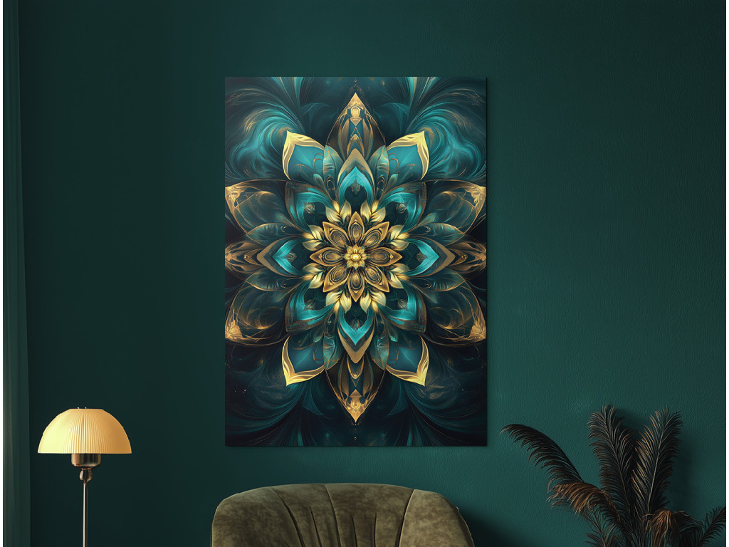 L'élégante mandala verticale représente un motif floral symétrique détaillé, combinant des tons turquoise et dorés. Grâce à son éclat harmonieux et à son design précis, elle dégage une impression de luxe et d'apaisement, idéale comme décoration dans des intérieurs modernes ou bohèmes.