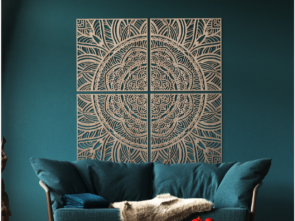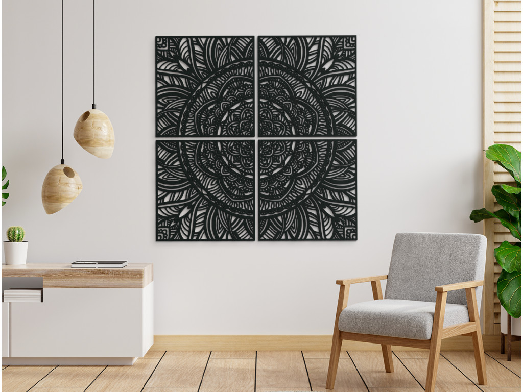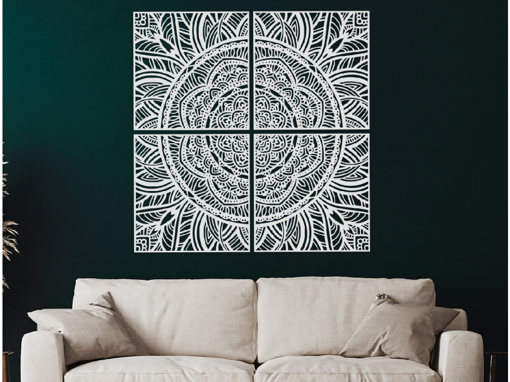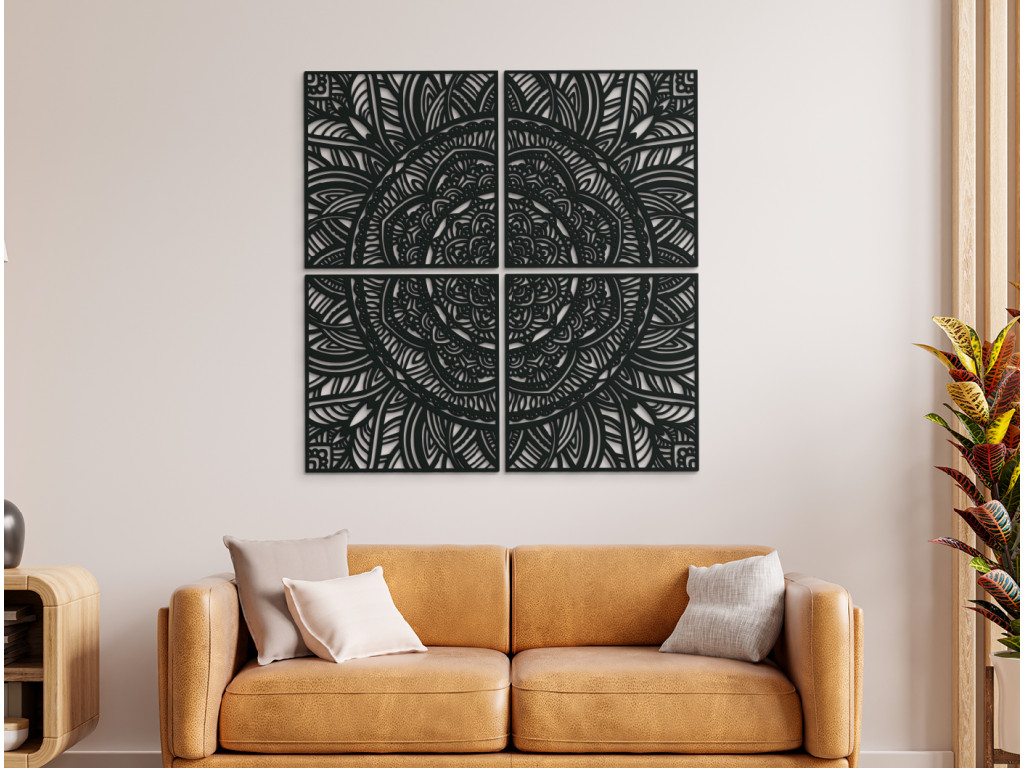Si vous recherchez une décoration qui illuminera votre intérieur, vous êtes au bon endroit. La mandala Épanouissement s'étend sur 4 pièces qui s'assemblent pour créer une magnifique image dans un salon moderne.
