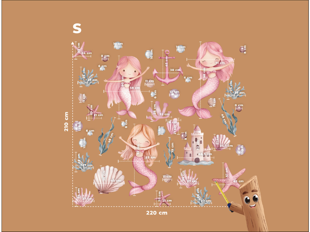 Ensemble d'autocollants muraux charmants représentant trois sirènes dans des tons roses, complétés par des paysages sous-marins de leur royaume enchanté. Les couleurs douces et les détails ludiques transformeront la chambre de votre enfant en un monde sous-marin féérique plein de fantaisie et de magie.