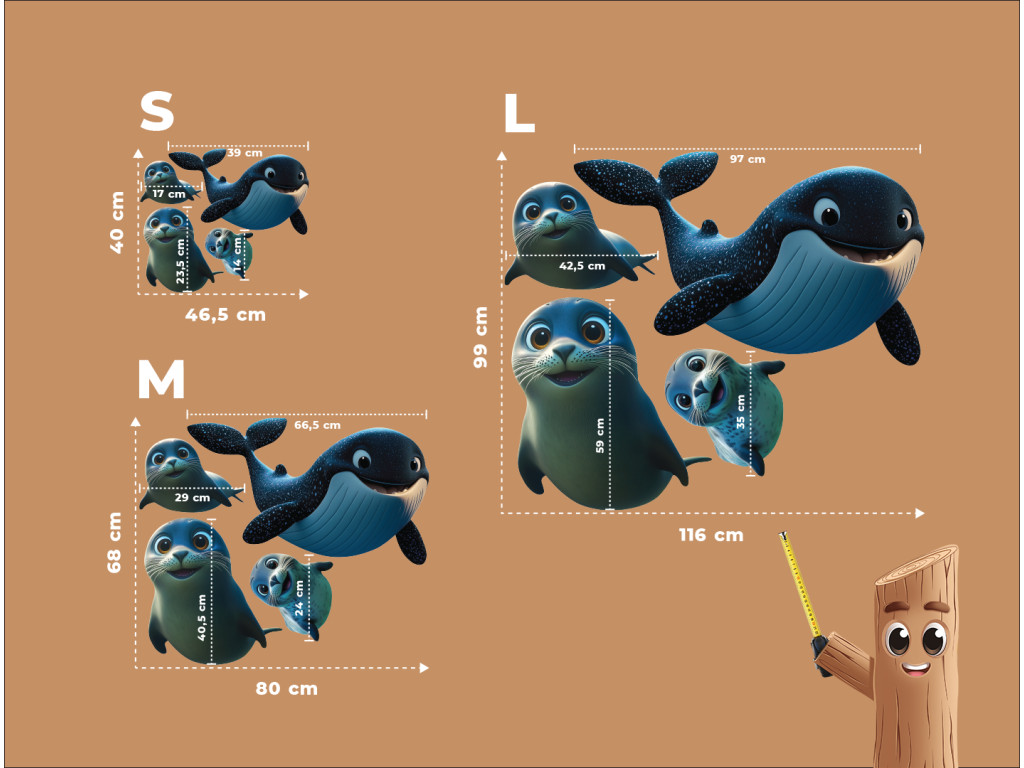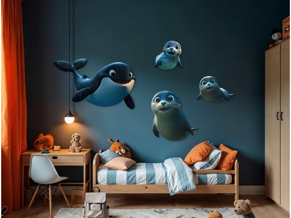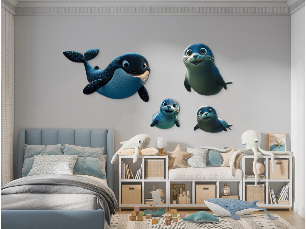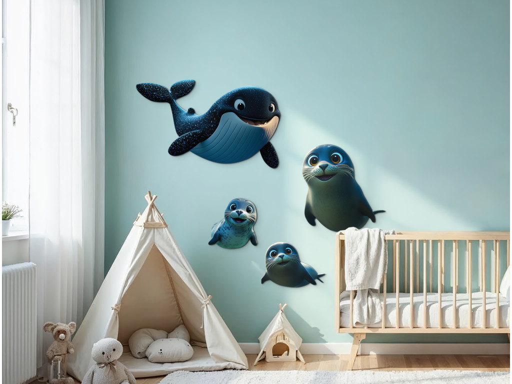 Cette adorable décoration murale représente une baleine à la bouche ouverte et trois joyeux phoques dans des poses ludiques. Tous les personnages ont de grands yeux, de jolis sourires et des formes arrondies qui conviennent parfaitement à une chambre d'enfant. La décoration est conviviale, joyeuse et stimule l'imagination ainsi que l'amour du monde marin.