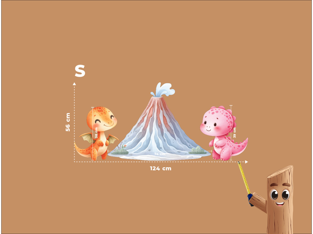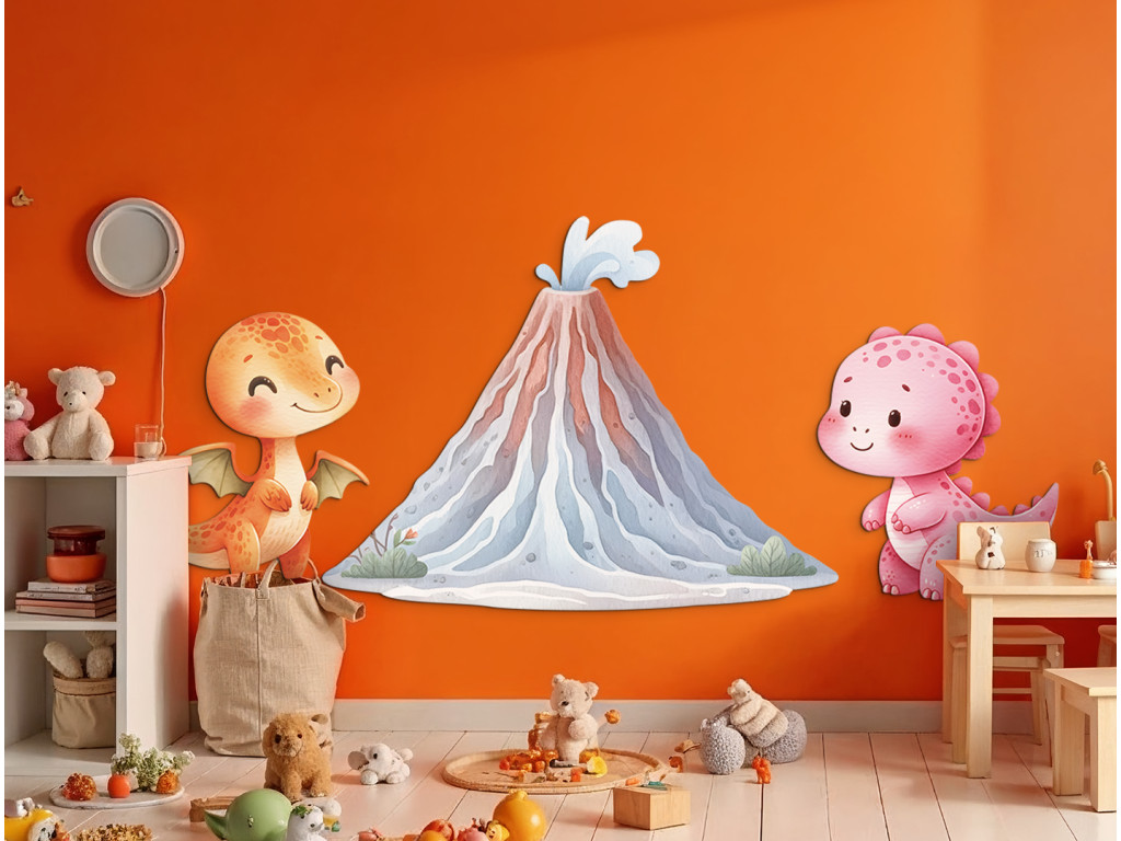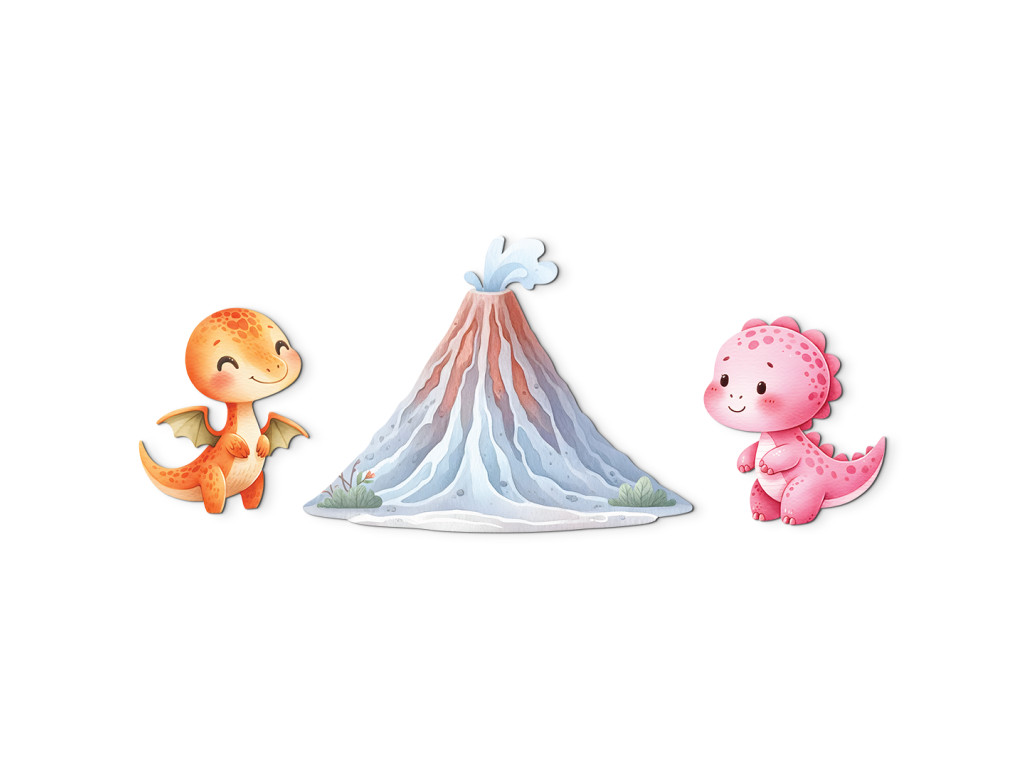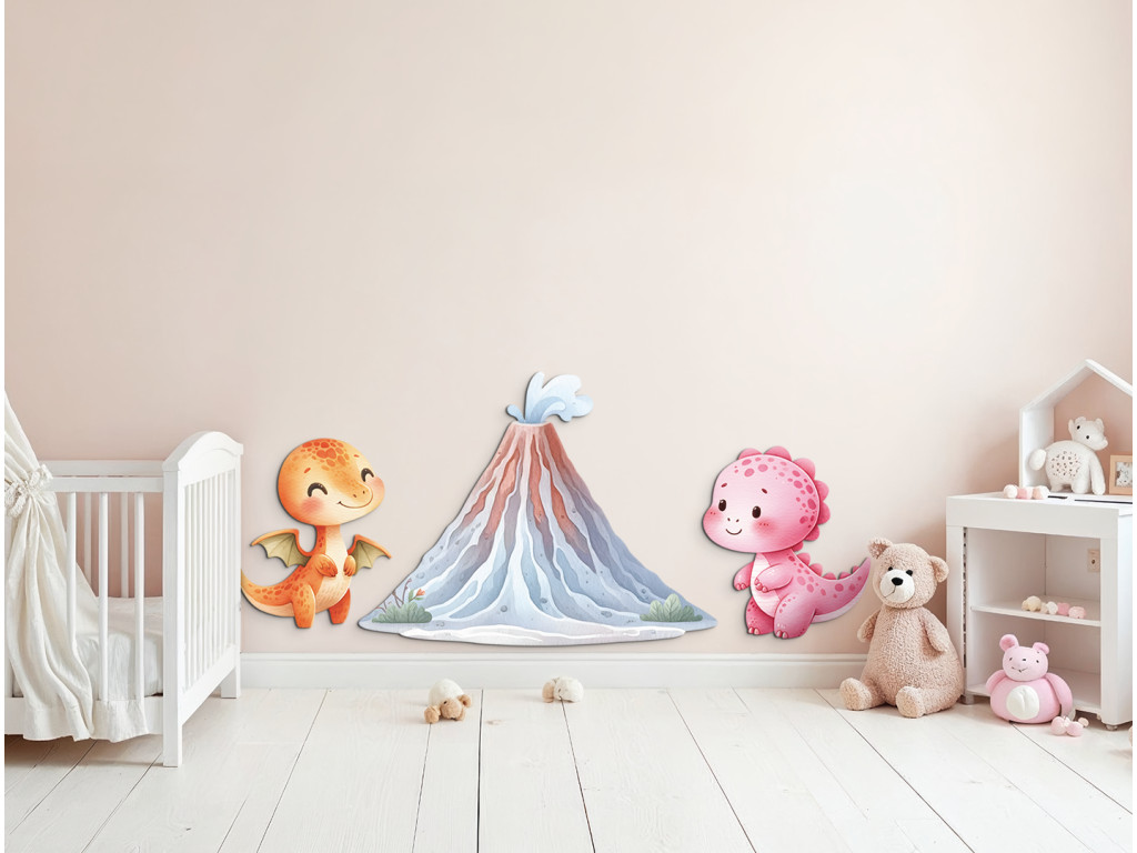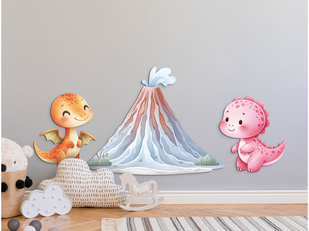 Décoration murale joyeuse avec deux adorables dinosaures qui gardent un volcan fumant. Le dinosaure orange ailé et son compagnon rose apportent de la gaieté et de la couleur dans chaque chambre d'enfant. Les teintes vives et les visages sympathiques raviront les petits explorateurs et créeront l'atmosphère d'un monde préhistorique plein d'aventures.