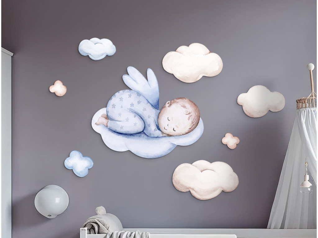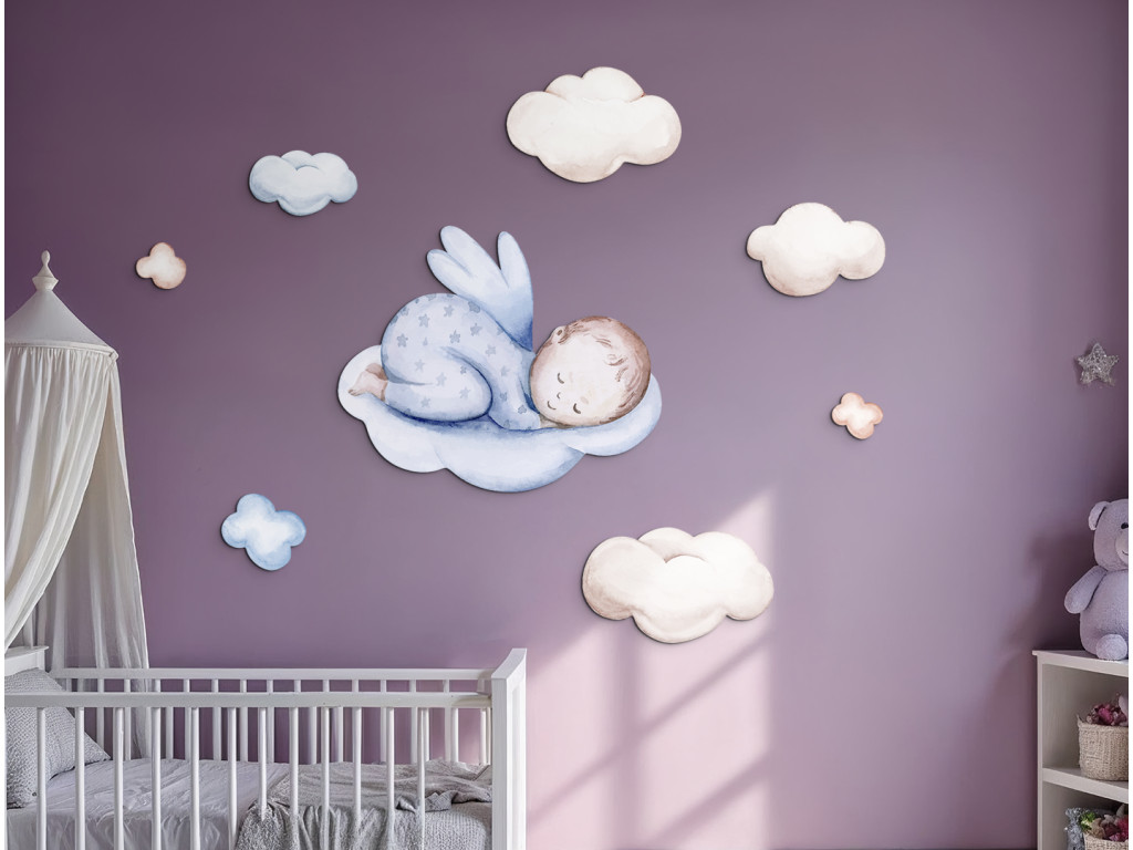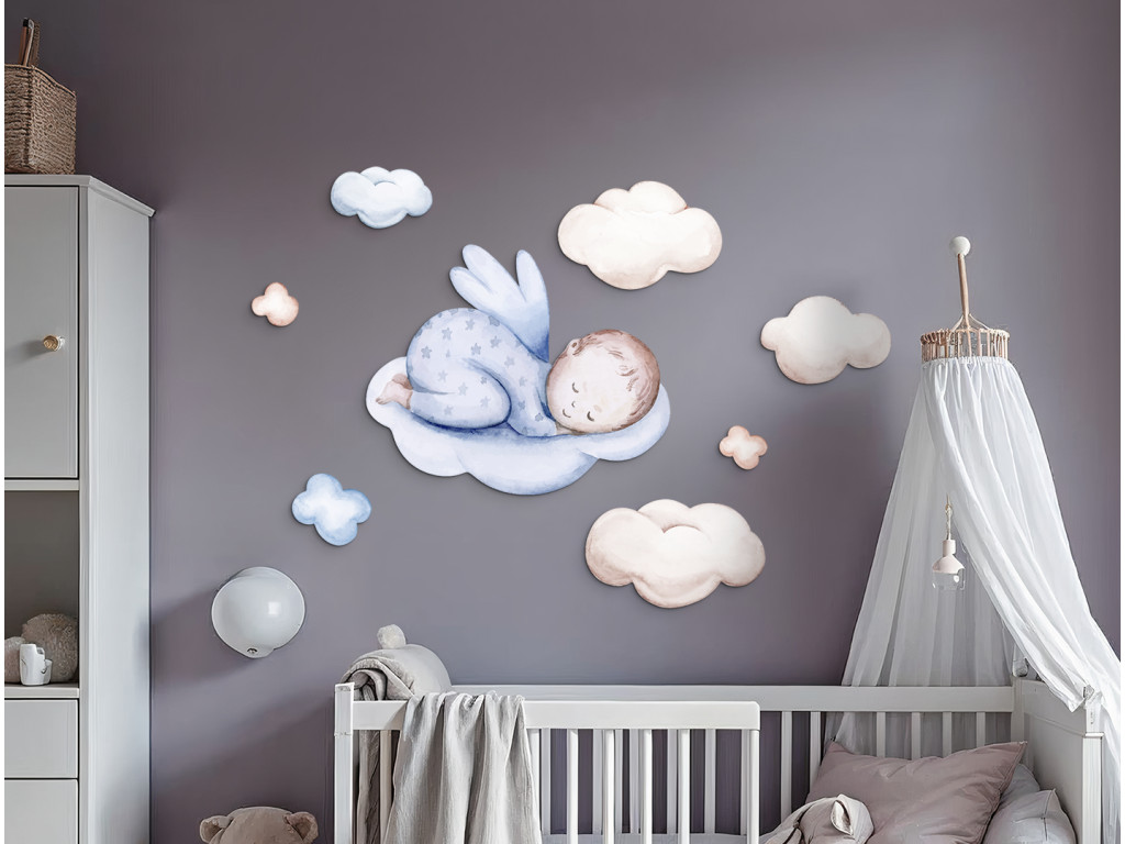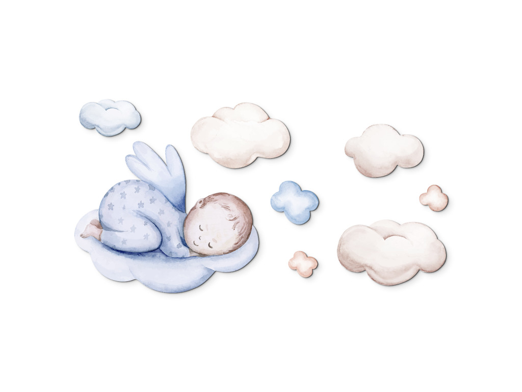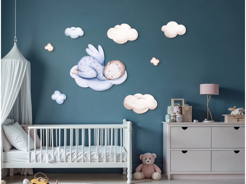Un adorable petit ange dessiné en pyjama bleu se repose paisiblement sur des nuages moelleux. Les couleurs douces et le motif délicat évoquent un sentiment de paix et de sécurité. Un excellent choix pour rendre la chambre d'enfant plus confortable et créer une atmosphère propice au sommeil.