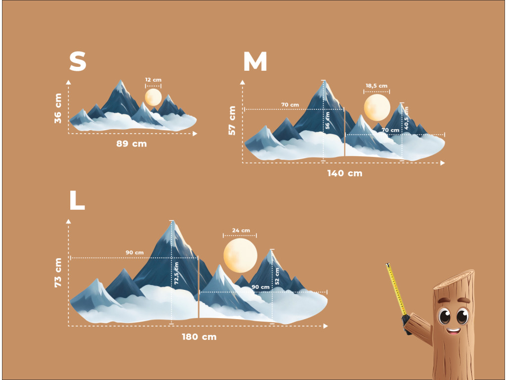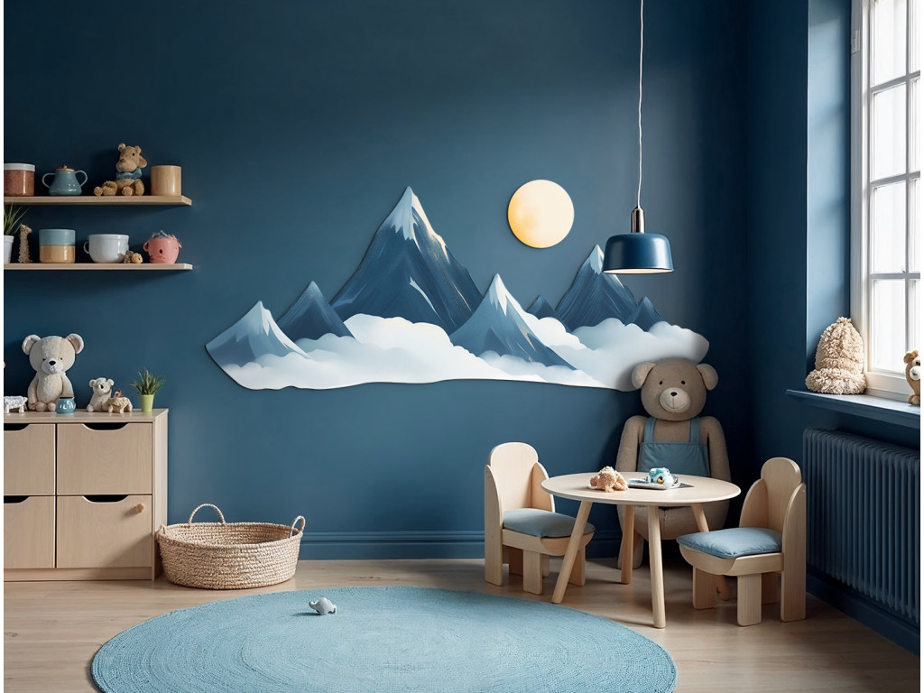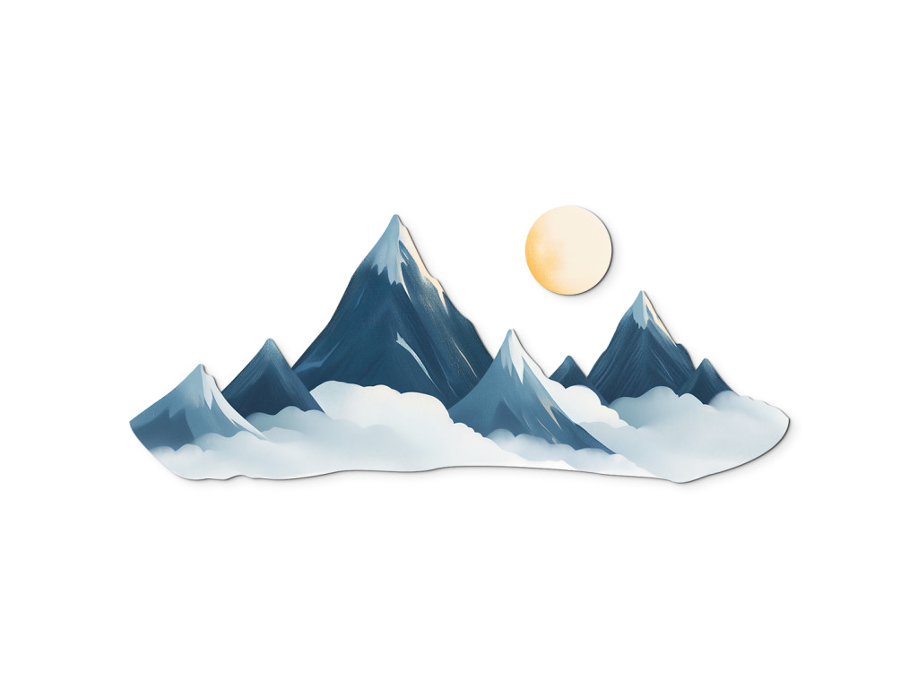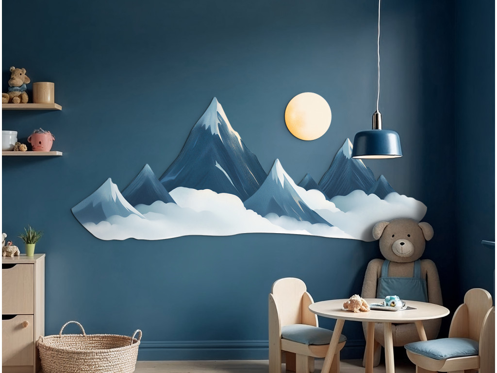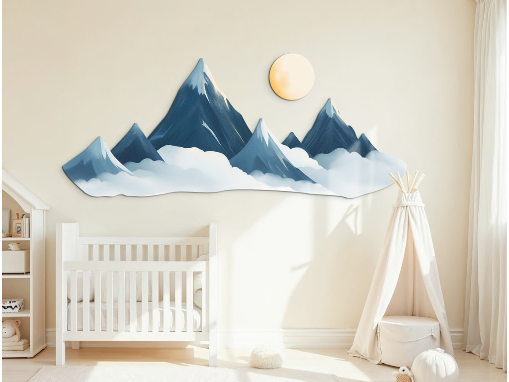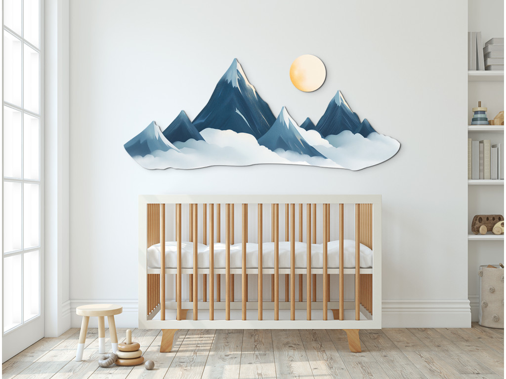 Illustration enfantine délicatement dessinée représentant des sommets montagneux enveloppés de nuages cotonneux avec le soleil au-dessus. La palette de couleurs gaie crée une atmosphère chaleureuse et paisible, idéale pour égayer les murs d'une chambre d'enfant.